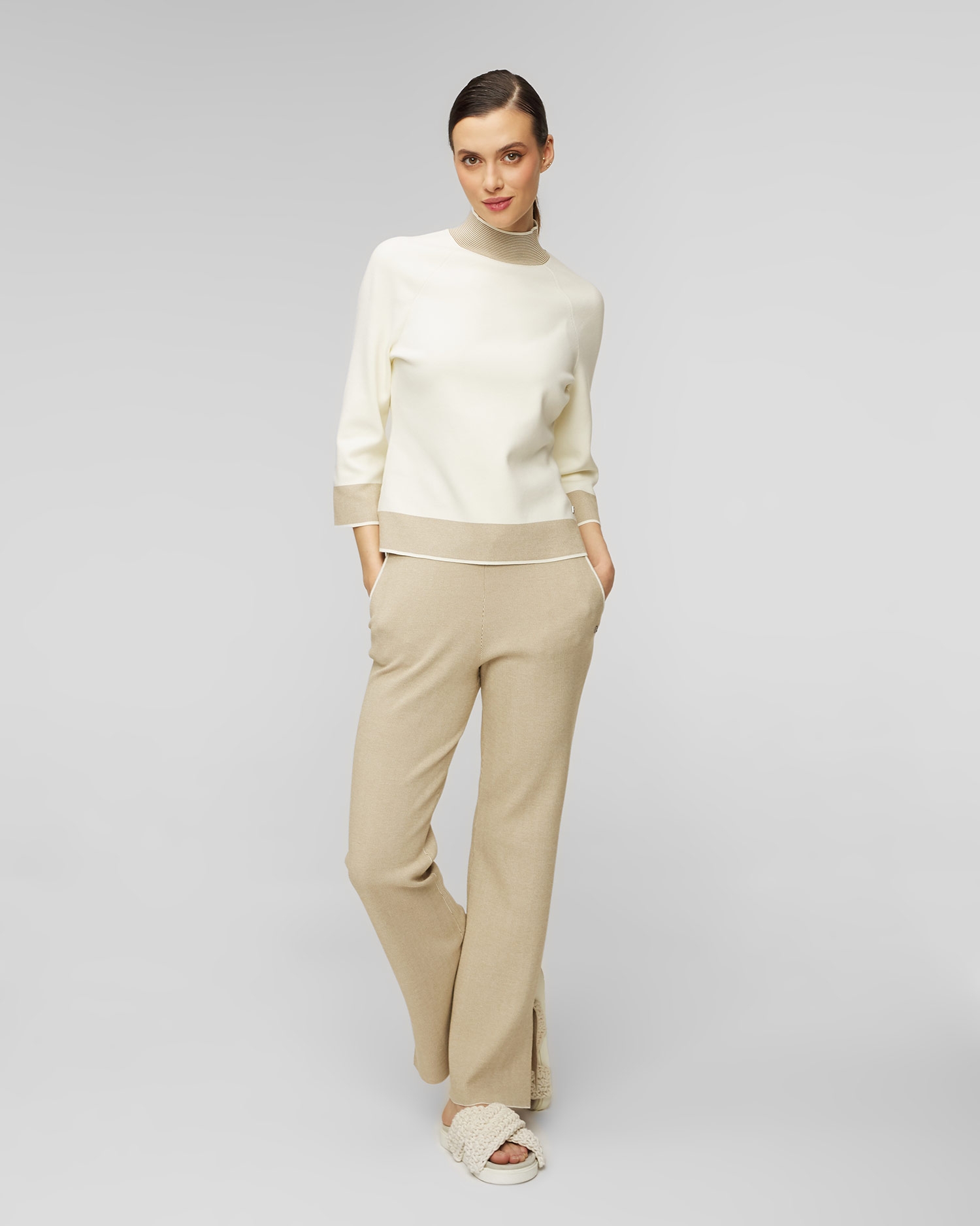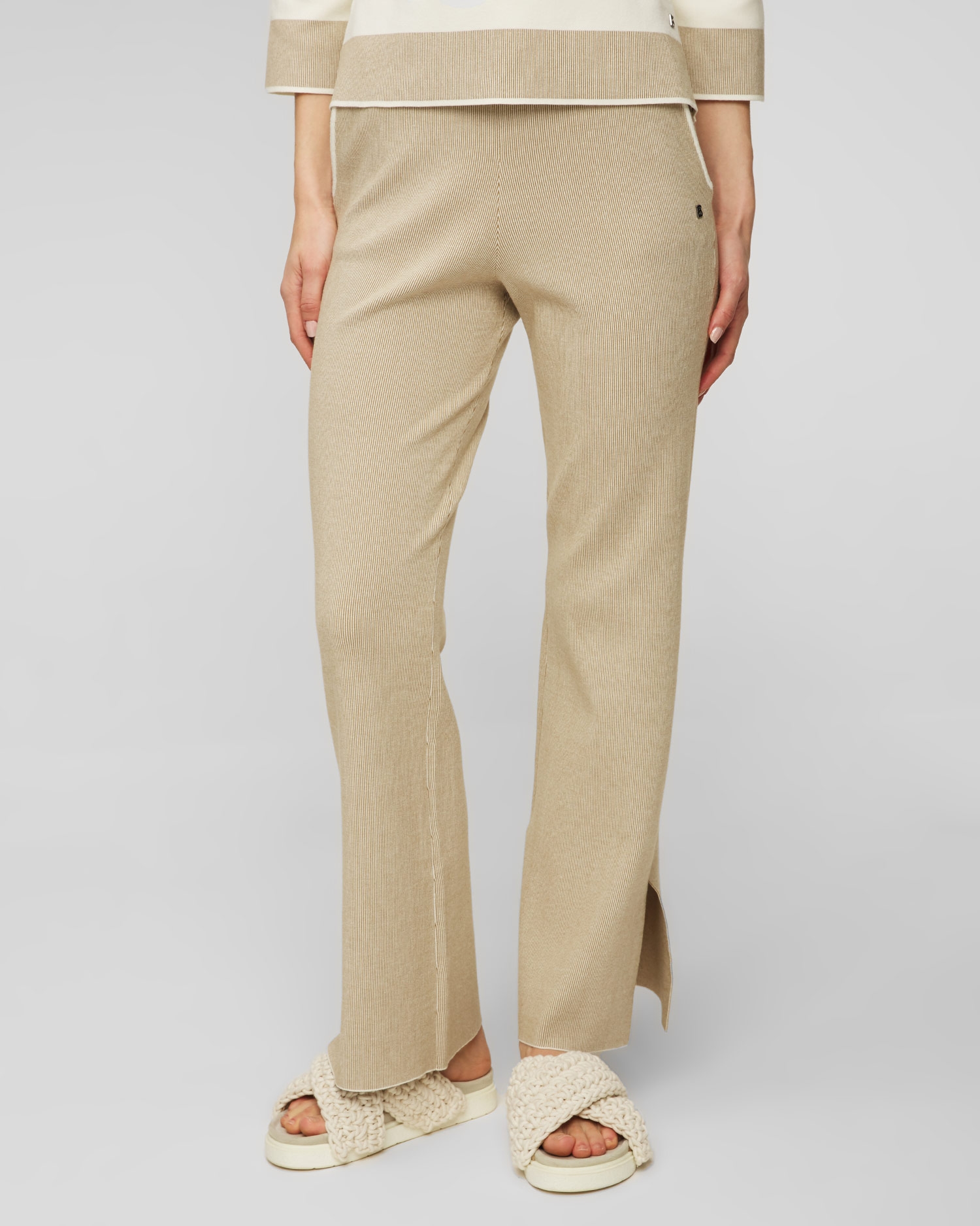 Dámské pletené kalhoty BOGNER Manon se vyznačují vysokým komfortem. Volná silueta kalhot, rozparky na nohavicích a elegantní kontrastní detaily. Měkká viskózová tkanina zajišťuje pohodlí při nošení a elastická stahovací šňůrka v pase zajišťuje správné padnutí postavě.