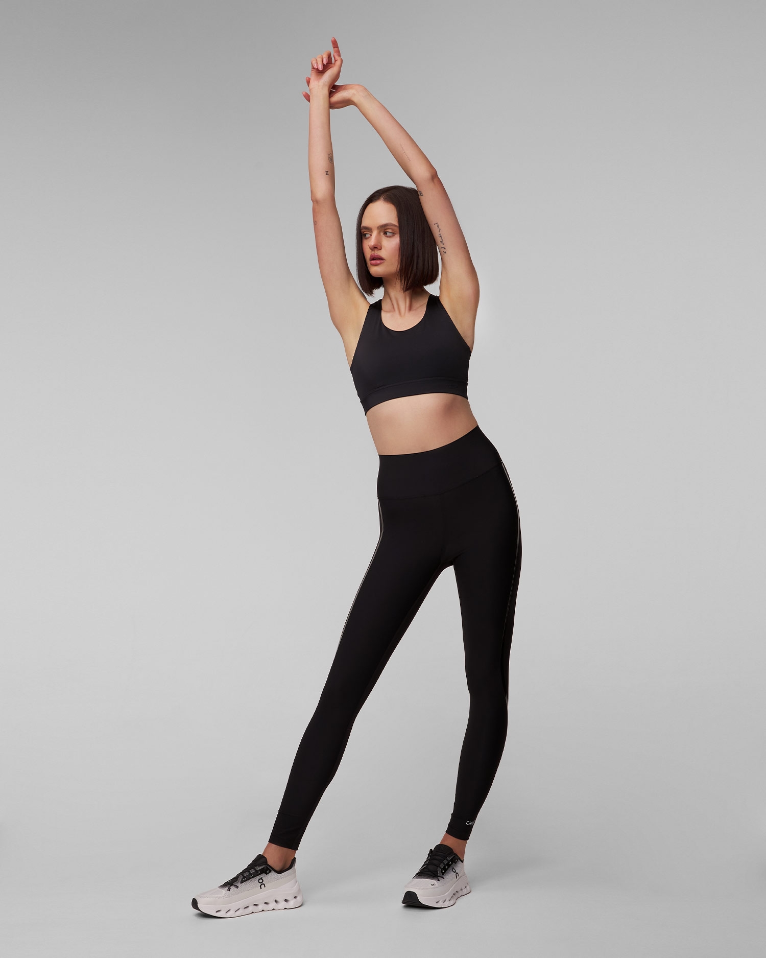 Laminované pruhy zdůrazňující křivky nohou po celé délce. Tkanina na zadní straně je silnější a zcela odolná proti prosvítání při dřepu.