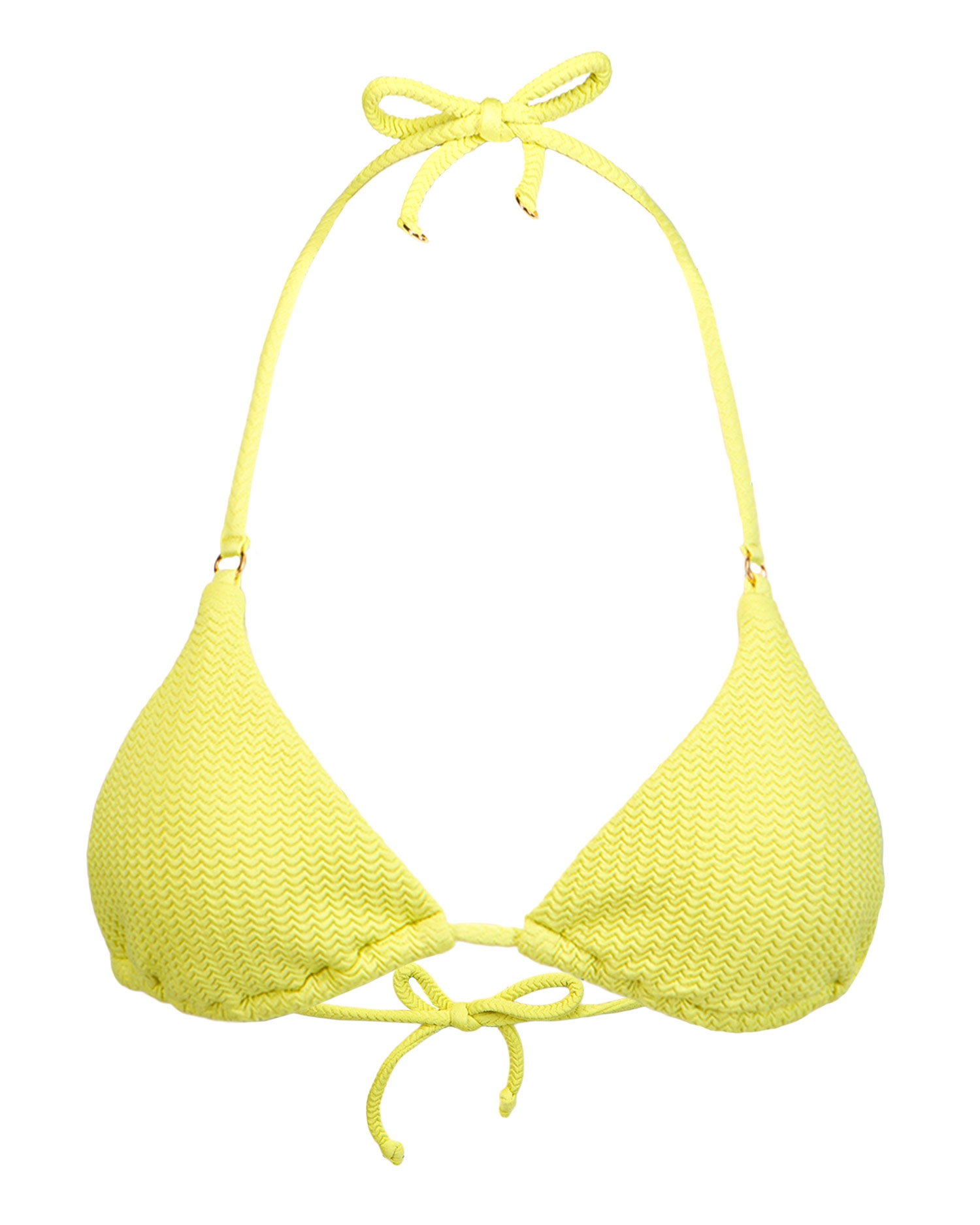 Horní díl plavek SEAFOLLY SLIDE TRI je perfektní volbou na pláž. Vyrobeno z odolného nylonu s přídavkem elastanu, poskytne maximální pohodlí a plnou volnost pohybu. Materiál je měkký a příjemný na dotyk s pokožkou, zdobený texturou. Top outfitu klasického střihu se zavazováním na krku a zádech, umožňující dokonalé přizpůsobení tělu. Odnímatelné košíčky zdůrazní poprsí a zajistí dostatečnou oporu.