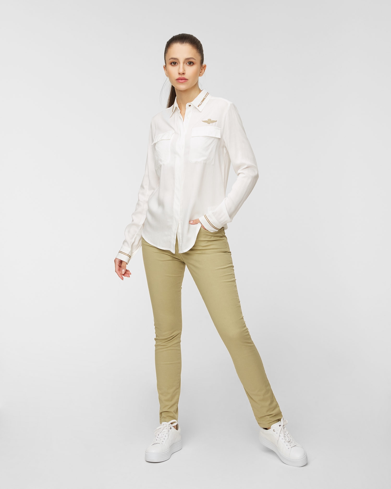 Kalhoty AERONAUTICA MILITARE úspěšně doplní váš outfit. Jsou vyrobeny z vysoce kvalitní bavlny s přídavkem elastanu a jsou ideální pro každodenní nošení, zajišťují pohodlí a plnou svobodu pohybu. Kalhoty s vysokým pasem vypasovaného střihu, zapínání na knoflík a zip. Zdobené vyšívaným jménem značky v pase a značkovým odznakem na zadní kapse. Na přední straně dvě kapsy.