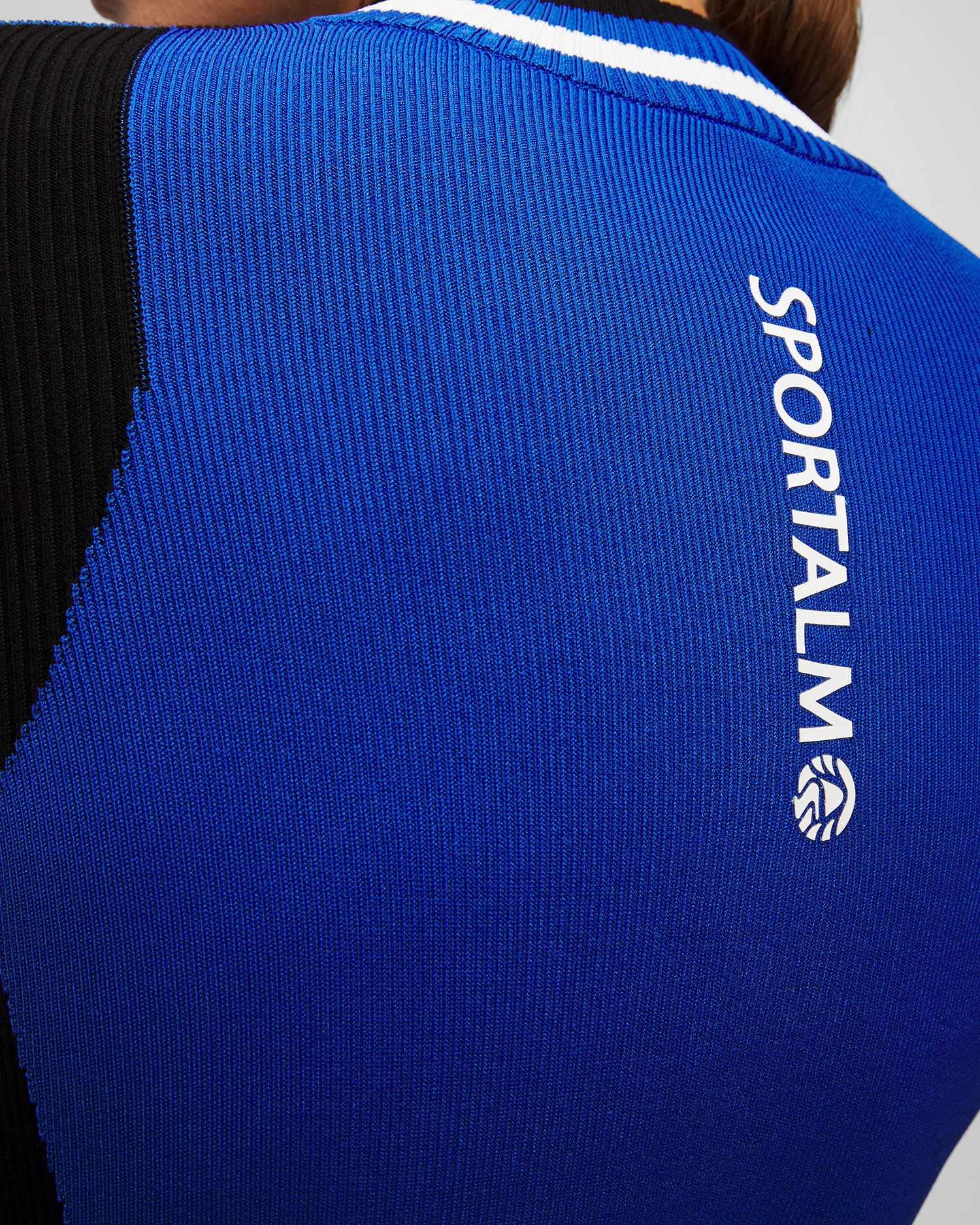 Pletené šaty Sportalm se stojáčkem jsou typicky ženské a zdůrazňují postavu. Vyrobeno z měkké směsi viskózy a elastických vláken, která zajišťuje pohodlí a přesné padnutí. Úzká silueta je navíc zdůrazněna žebrovanými vsadkami na bocích. Bloky různých barev vytvářejí módní a moderní efekt. Sportovní charakter podtrhuje zip pod krkem, který usnadňuje oblékání šatů. Na zádech potisk Sportalm v kontrastní barvě.