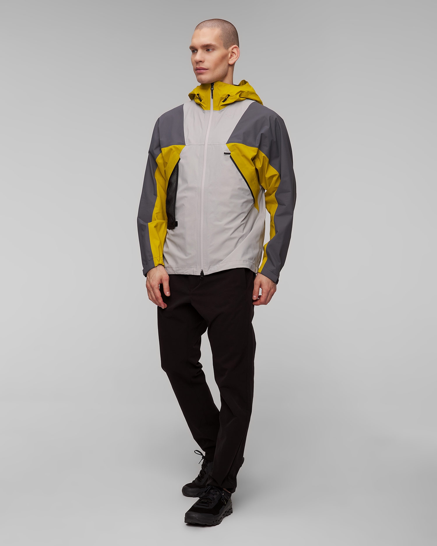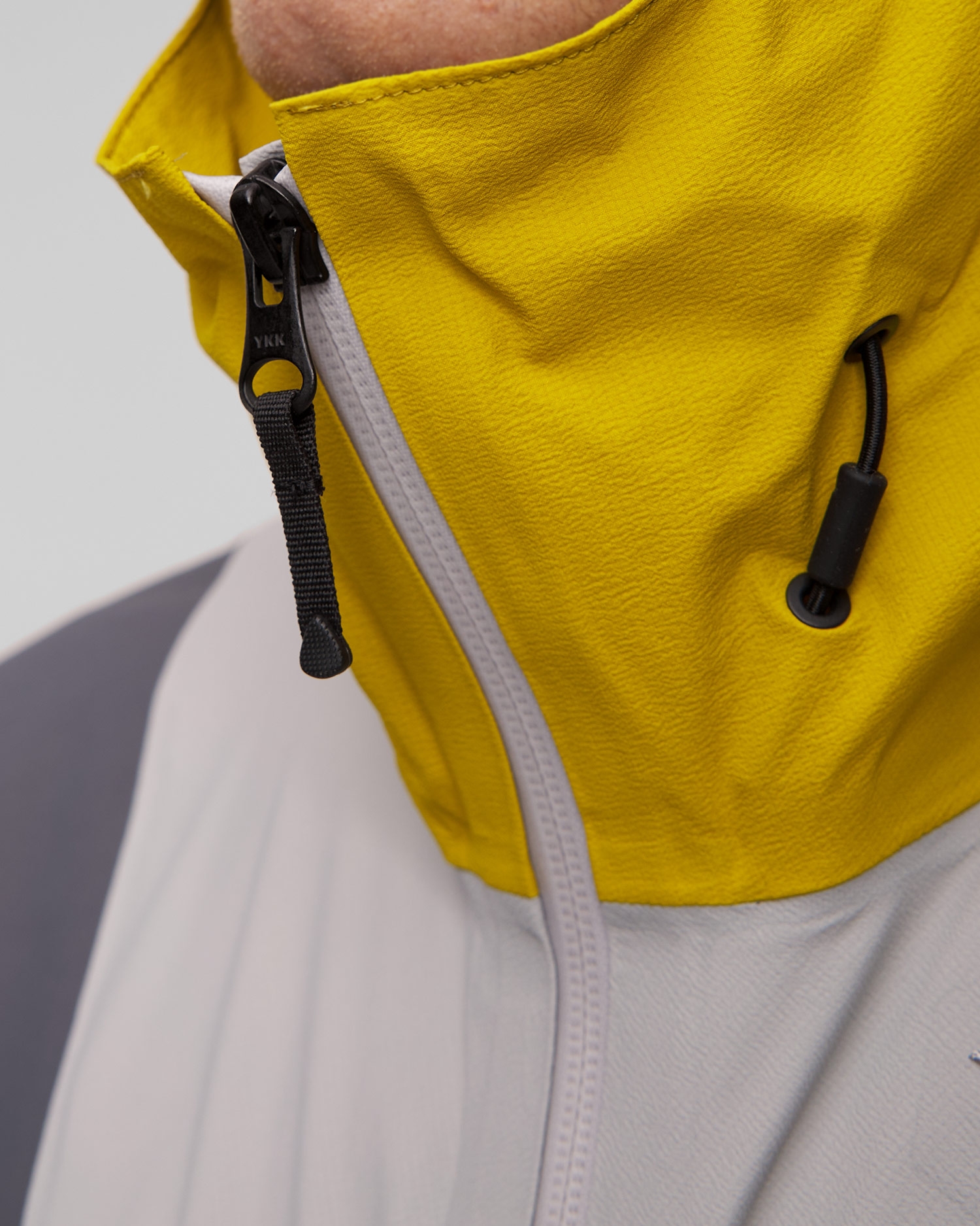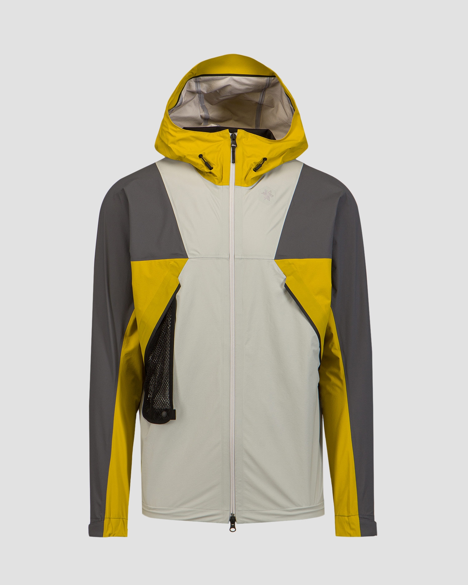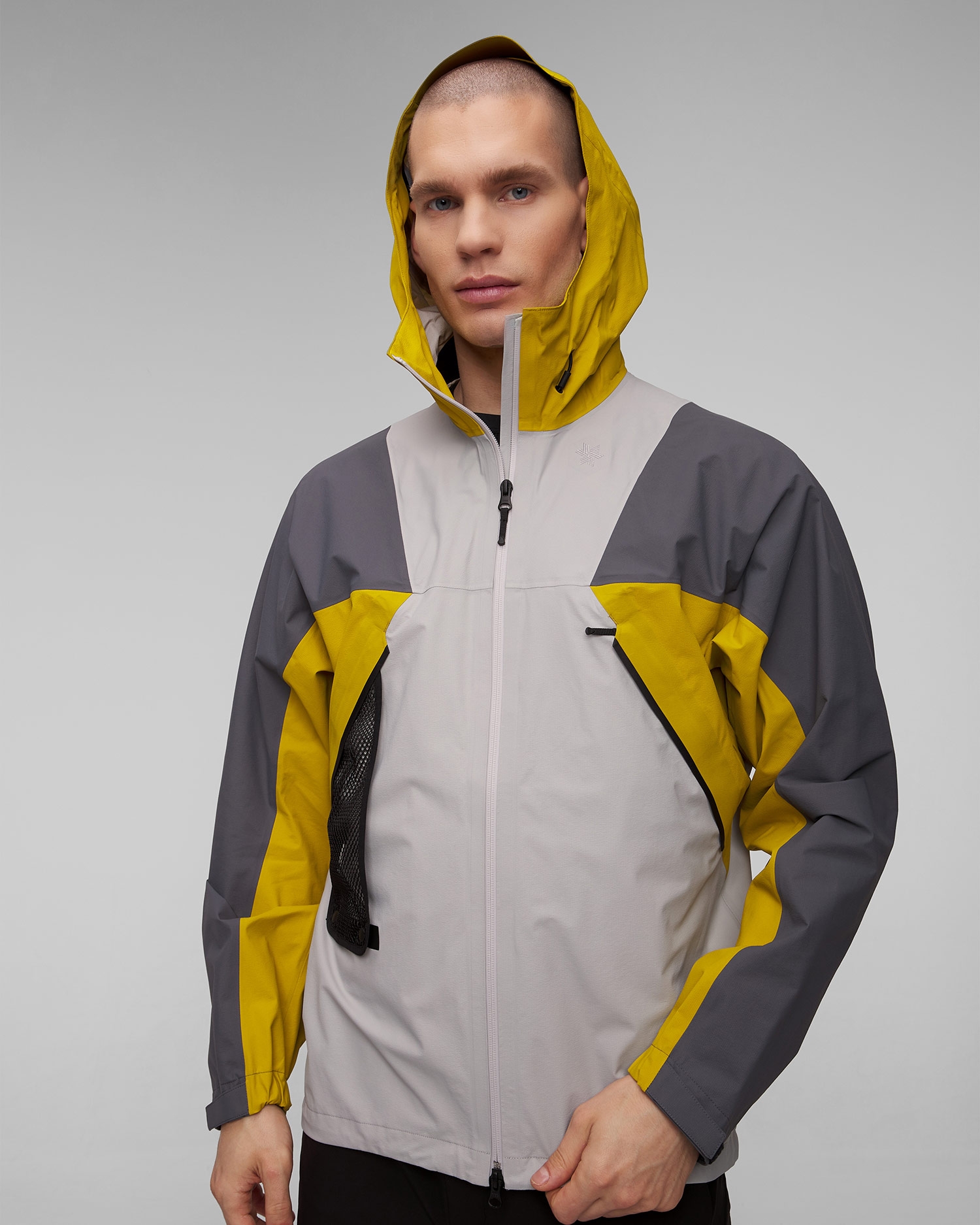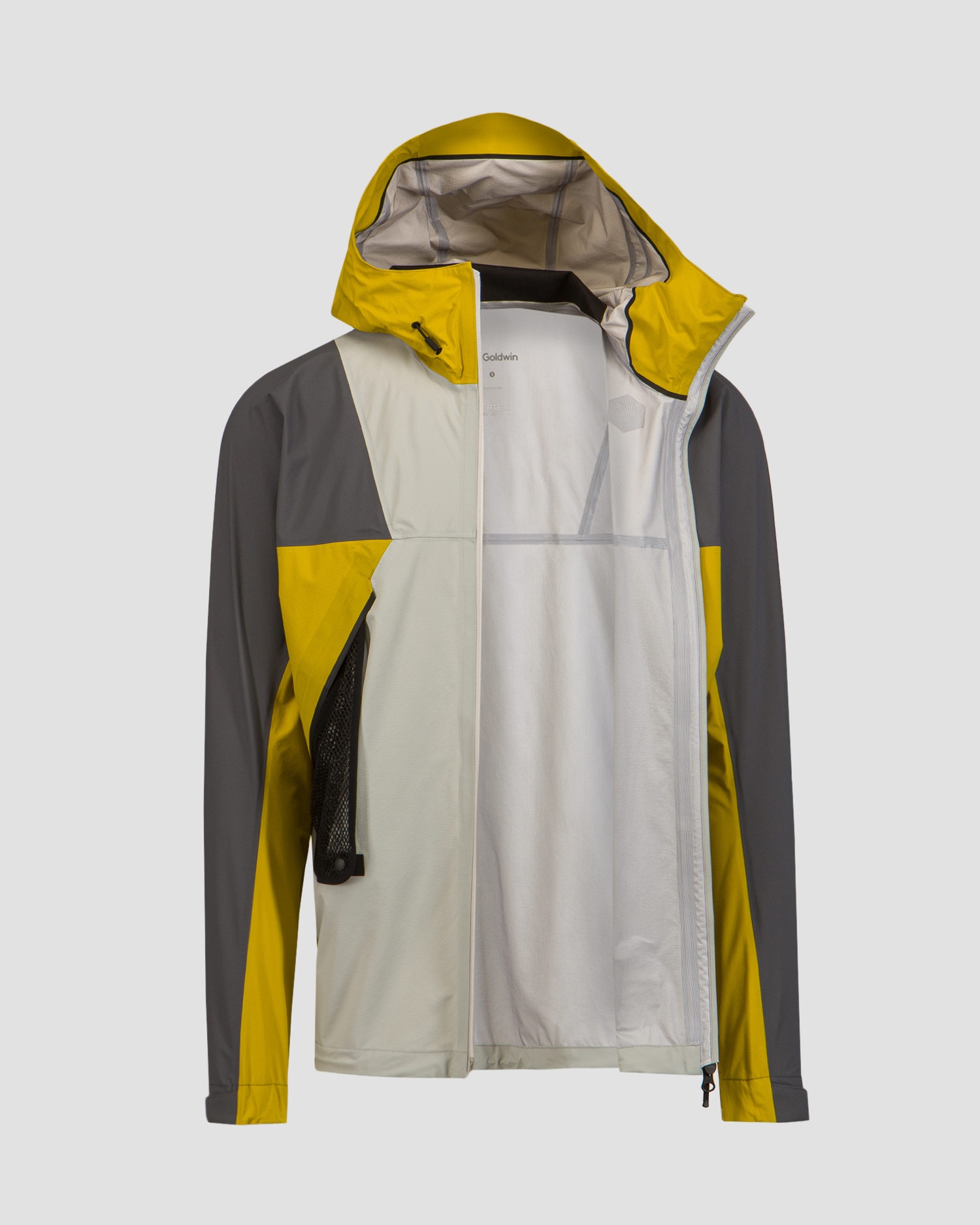 Design přední části bundy byl inspirován charakteristickým logem značky Goldwin, dodává eleganci a styl. Trojrozměrný design je navržen tak, aby poskytoval lepší mobilitu a pohodlí při pohybu. Navíc je bunda vybavena dvoucestným voděodolným zipem a poskytuje další funkčnost a možnost nastavení ventilace v závislosti na povětrnostních podmínkách a preferencích uživatele.