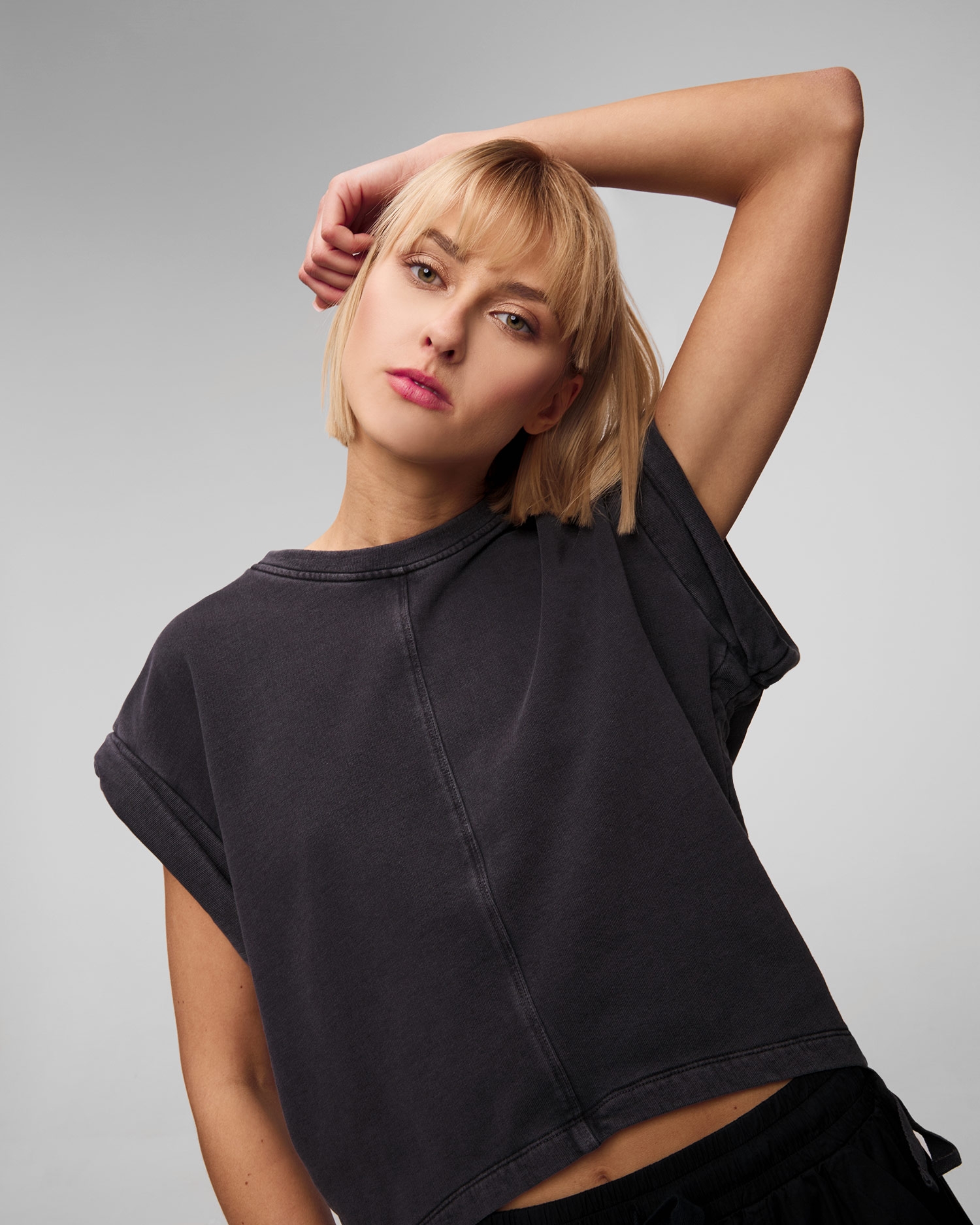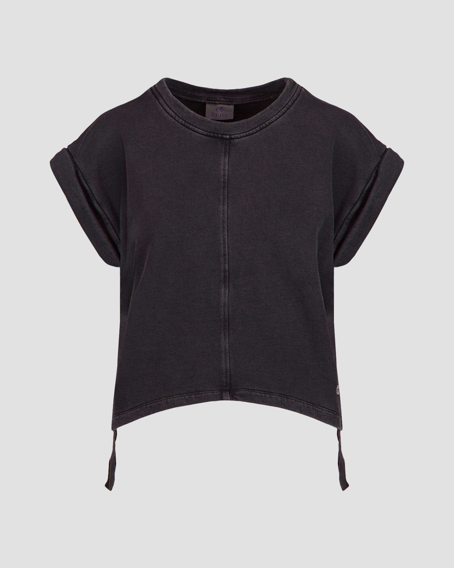 Dámský top Deha je návrhem pro ženy, které oceňují pohodlí a krásu. Originální oversize střih se šňůrkami na bocích, kulatý výstřih, krátké rukávy, zakončené ohrnutými manžetami. Vyrobeno z husté organické bavlny s praným efektem. Nášivka s podpisem na krku. Stříbrný potisk loga Deha na přední straně.