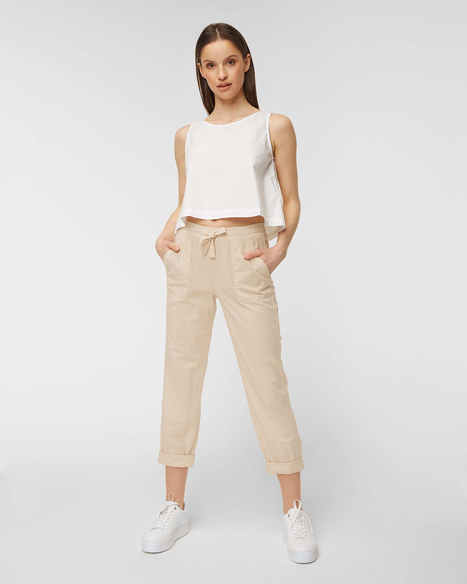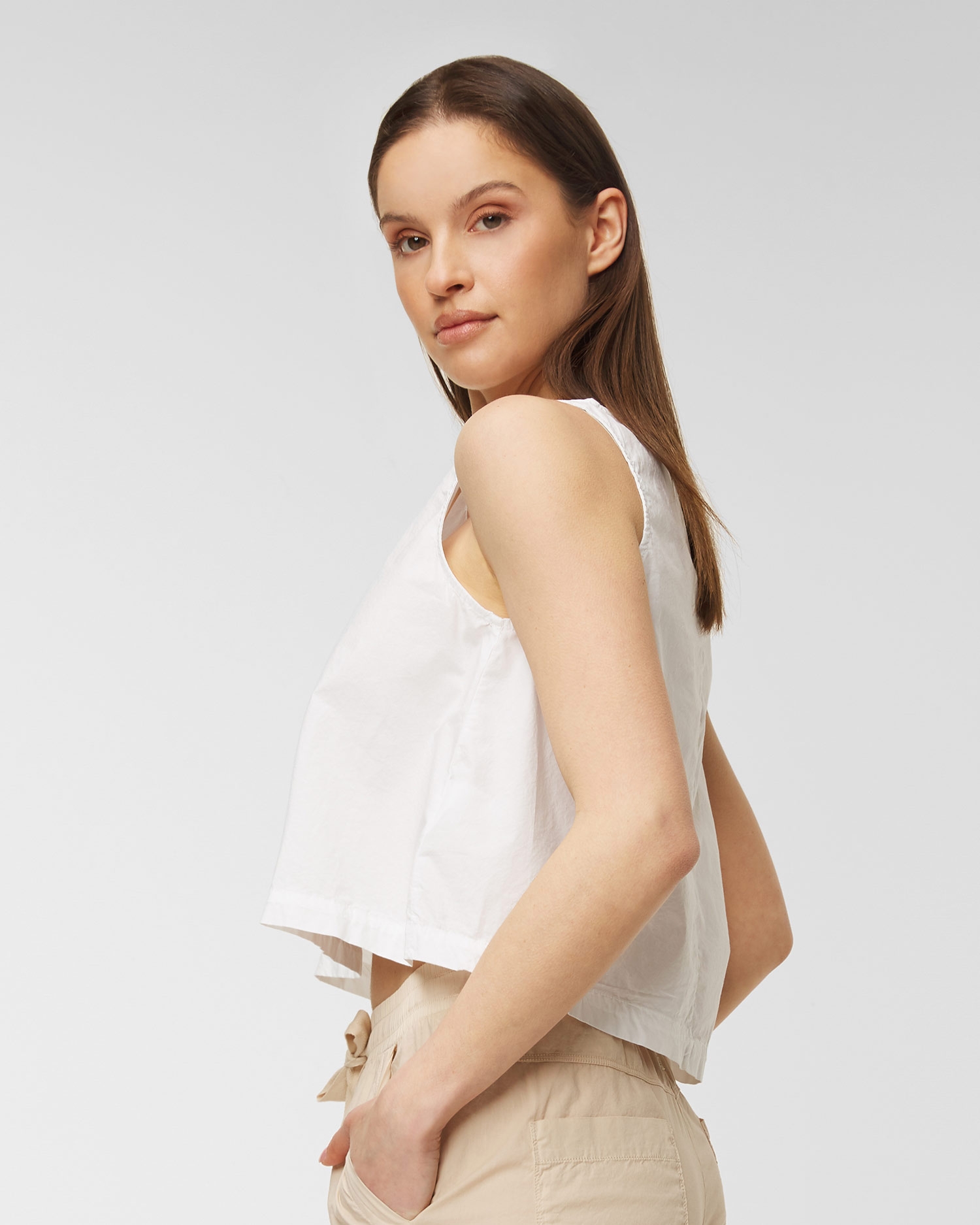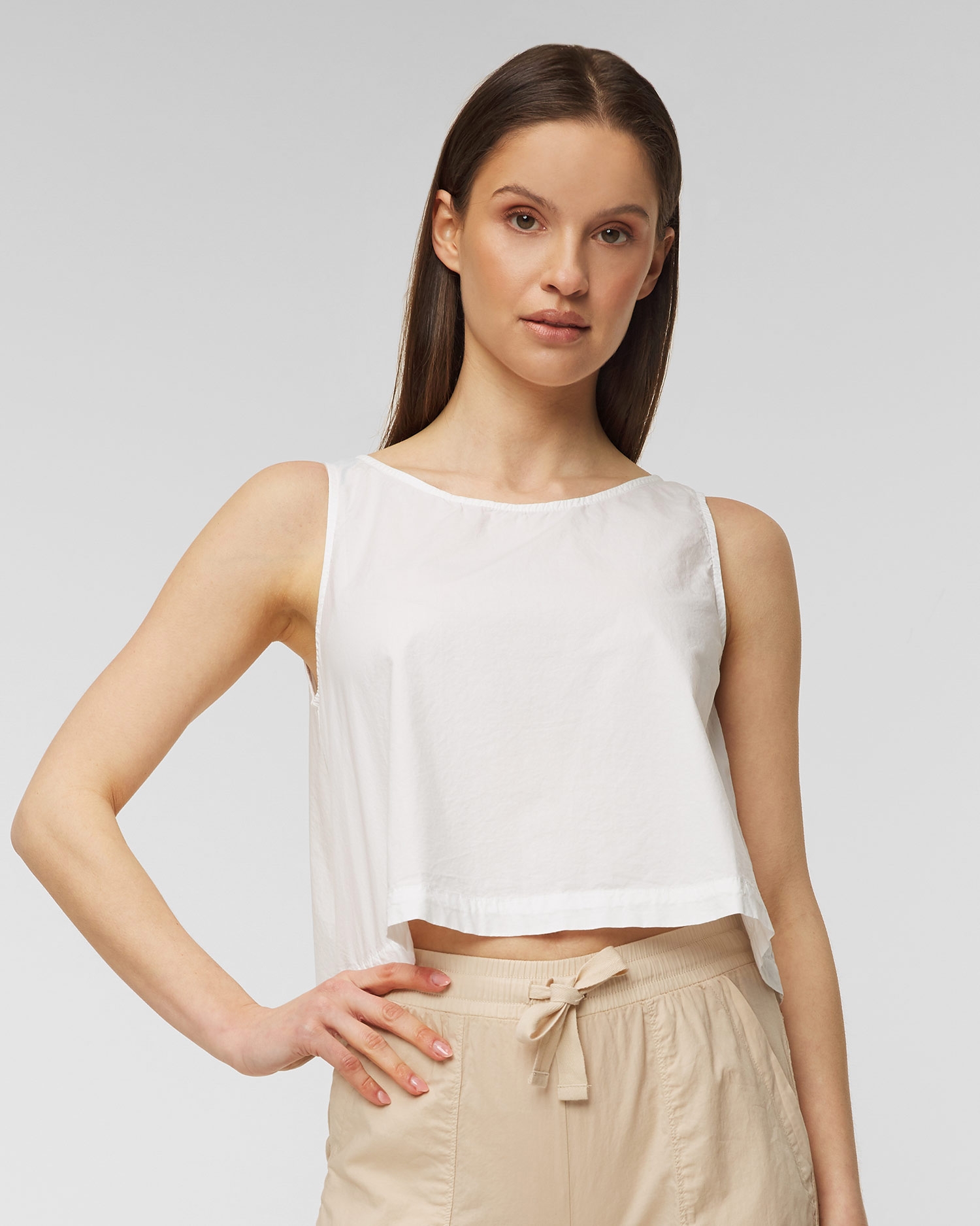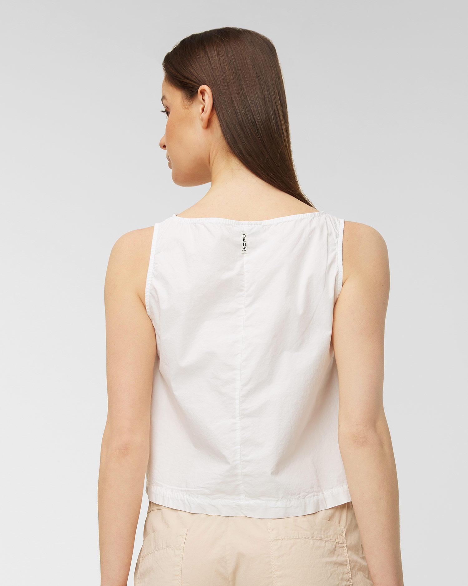 Top DEHA HYPE lichoběžníkového střihu úspěšně doplní letní stylizace. Vyrobeno z vysoce kvalitního bavlněného popelínu, díky kterému je měkké, jemné, lehké a vzdušné. Navíc se nemačká a na pleti je příjemný. Top se širokými ramínky, volný, krátký střih, vzadu mírně zaoblený. Stříbrné logo Deha na levé straně. Signovaný odznak na zadní straně.