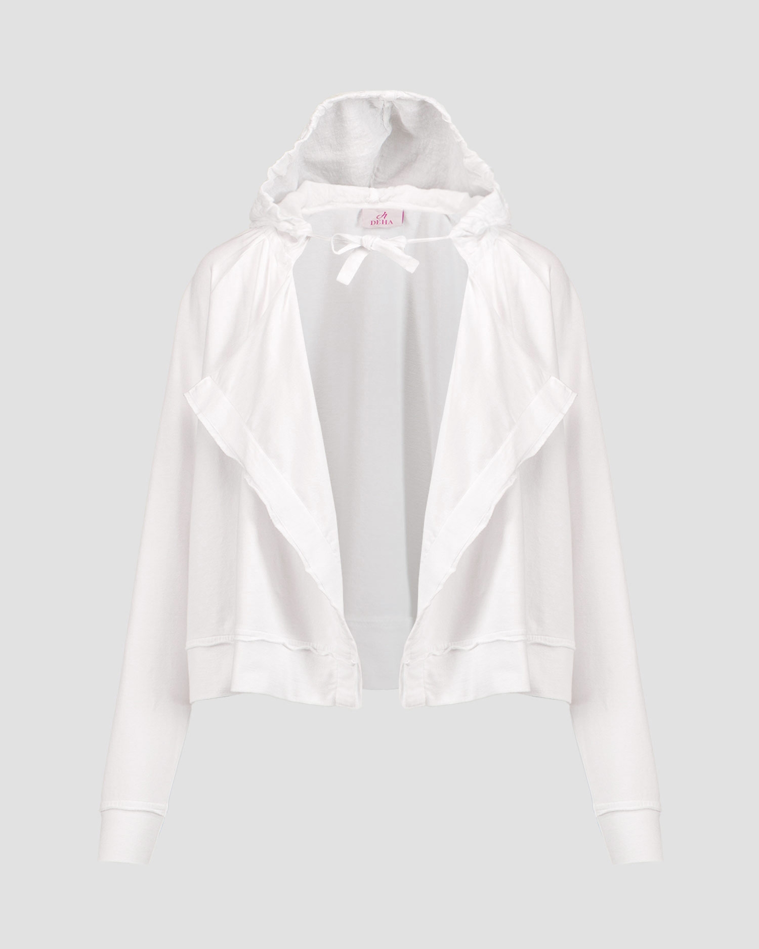 Das Deha Damen-Sweatshirt im Blazer-Stil mit Kapuze, ohne Verschluss. Hergestellt aus Bio-Baumwolle mit einer Kapuze aus Leinen, die mit Bändern verstellbar ist. Originelle Nähte unterstreichen den lässigen Charakter.