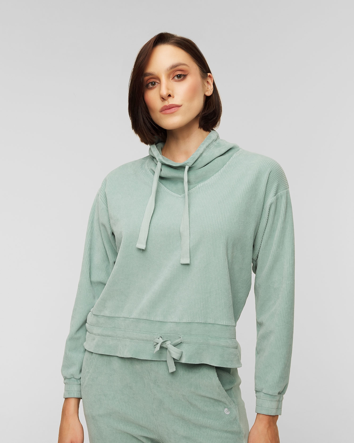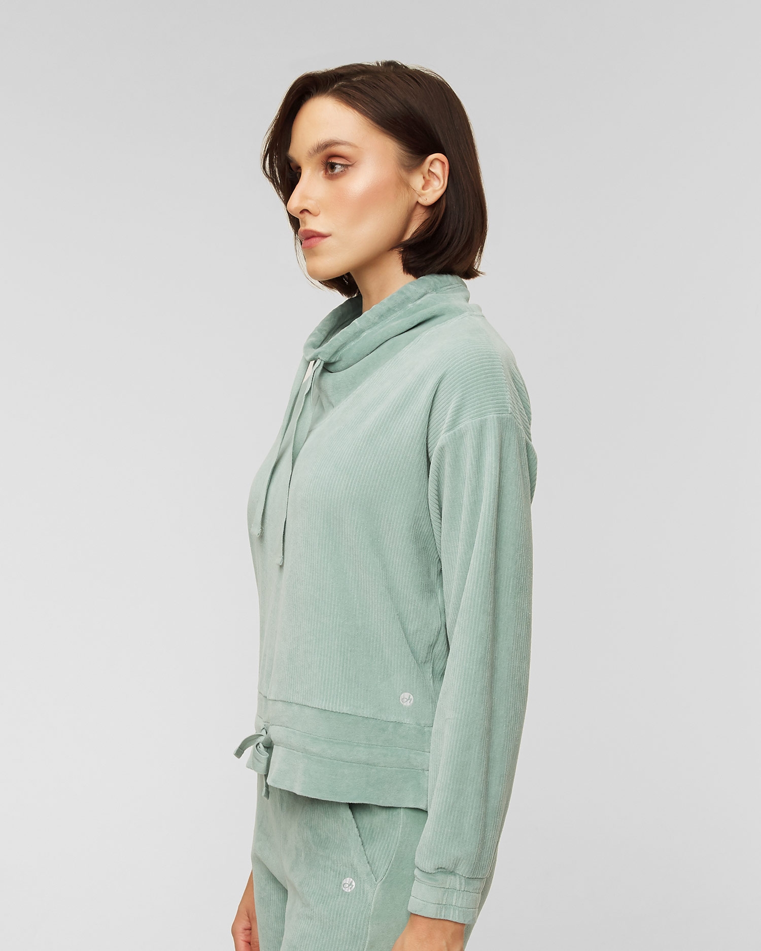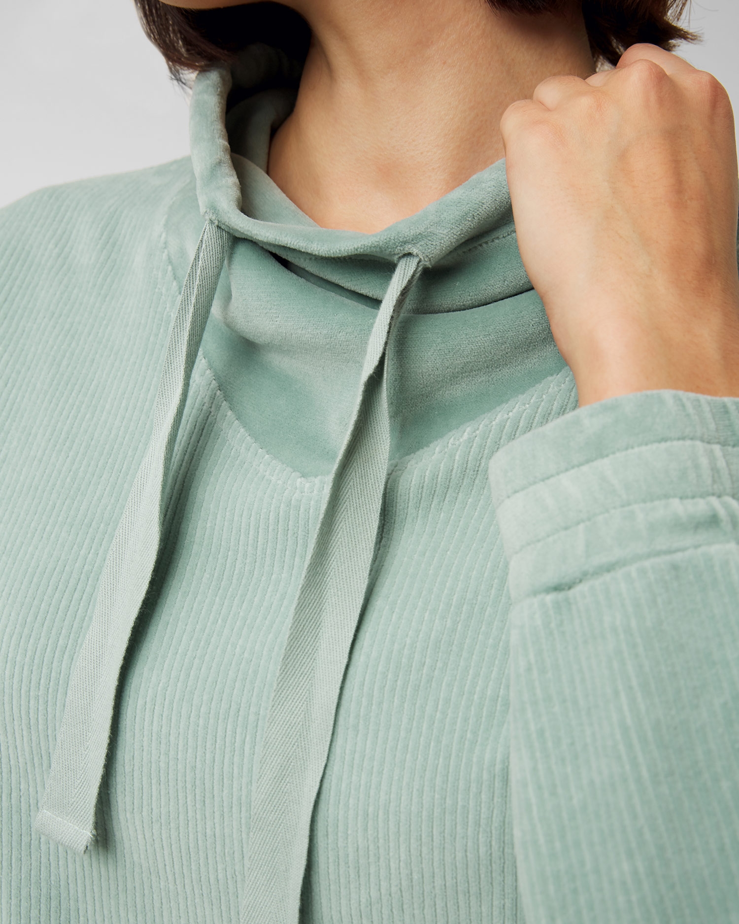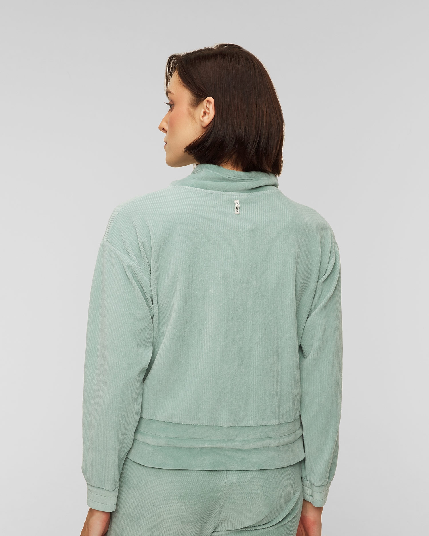 Das Deha Sweatshirt ist die perfekte Wahl für entspannten Komfort, der sich auch für ein lässiges Alltagsoutfit eignet. Hergestellt aus einem sehr angenehmen Chenille-Samt mit Cordstruktur. Lässiger Schnitt mit leicht verkürzter Länge und abgesenkten Ärmeln sorgt für Lockerheit. Unterteil und Ärmel sind mit einem gerippten Veloursbündchen versehen. Der Ausschnitt wird durch einen gebundenen Stehkragen abgeschlossen.