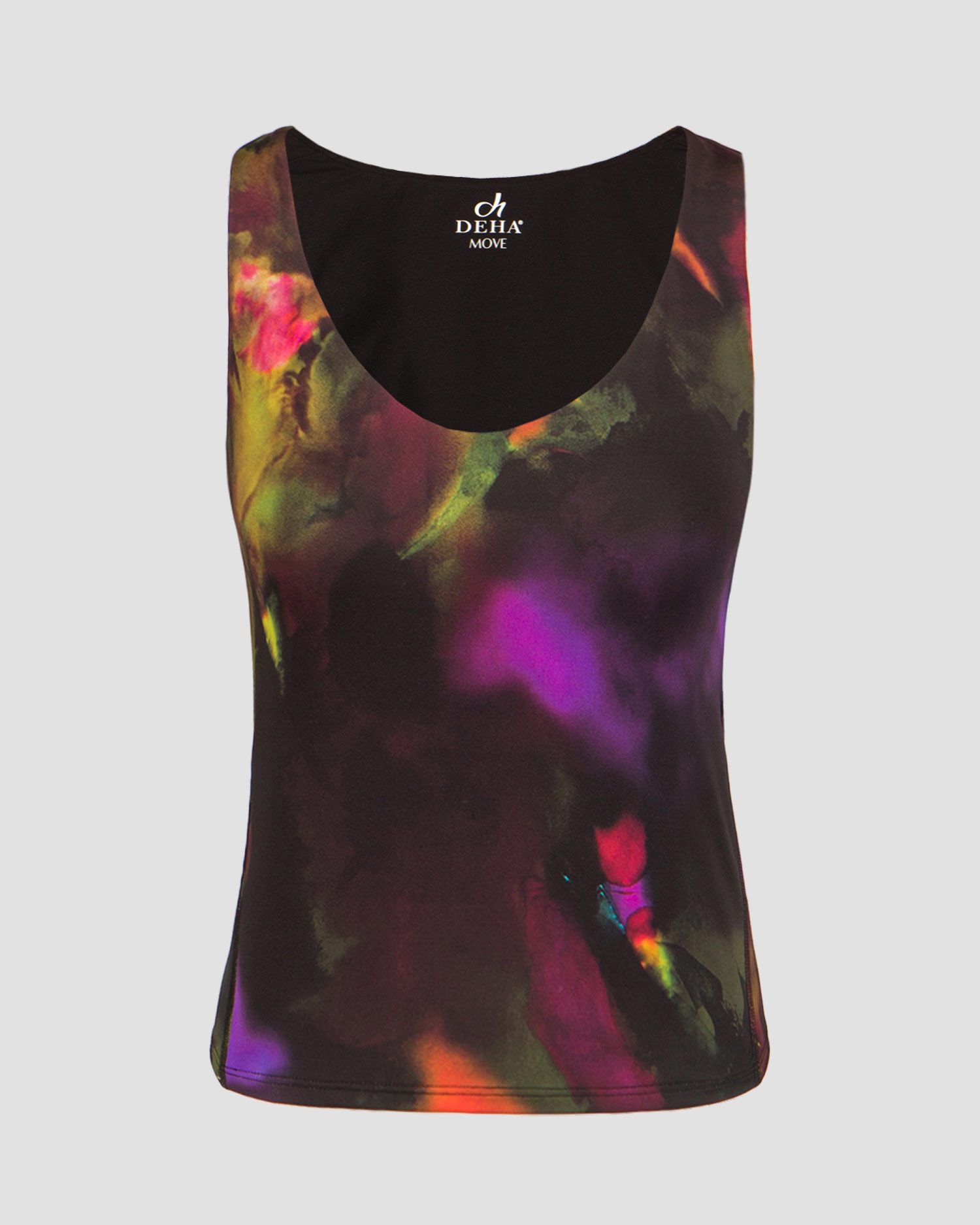 Das Trainingstop von Deha mit originellem Print ist bequem und sehr angenehm auf der Haut. Overlock-Nähte an den Schultern und an den Seiten unterstreichen den sportlichen Charakter. Ein eingenähter BH gibt der Brust ausreichend Halt. Unten ein rundes silbernes Deha-Logo.