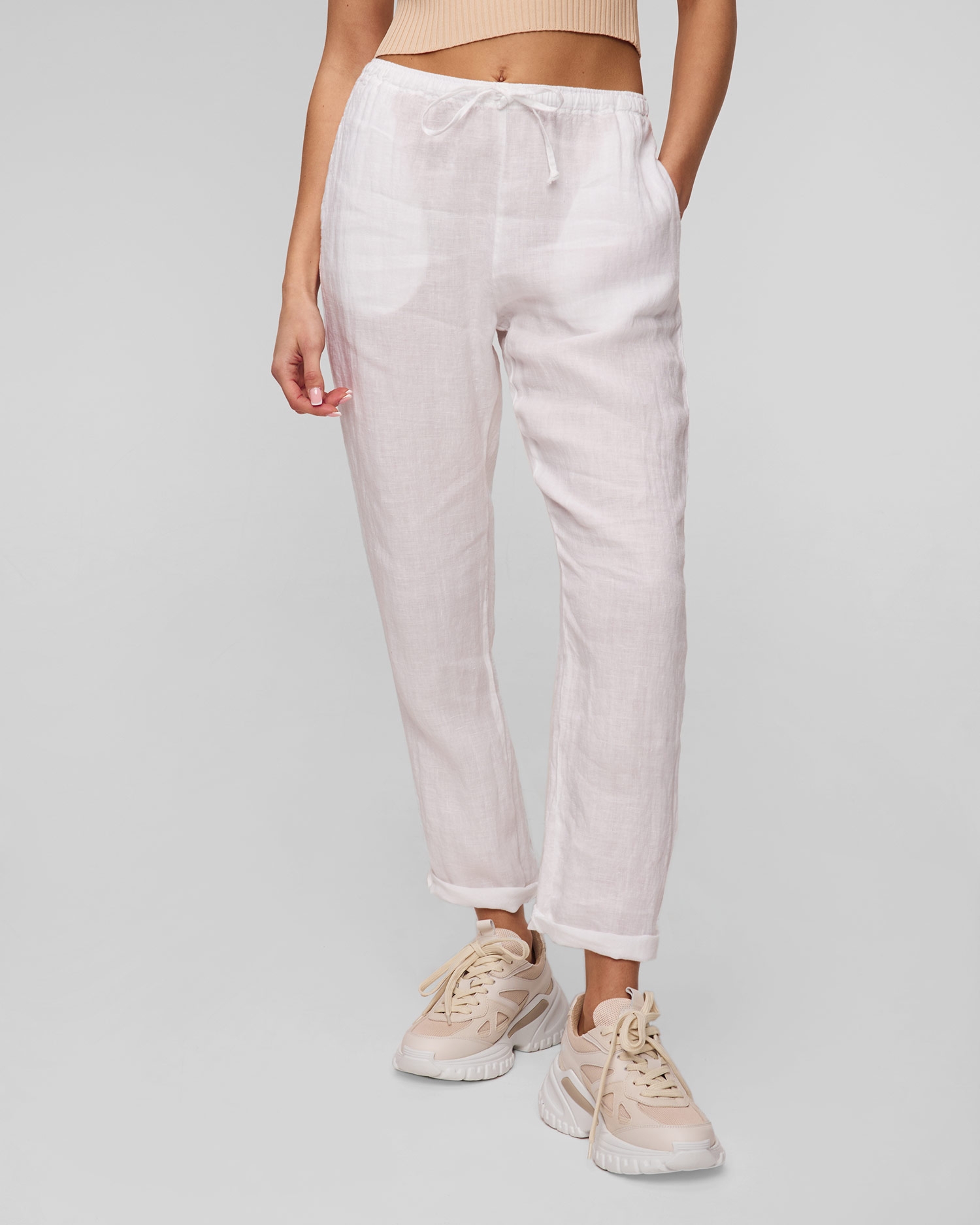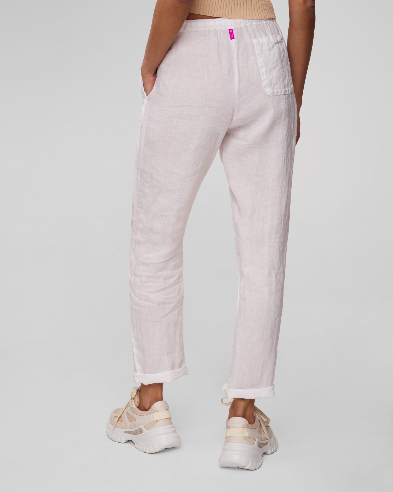 Die Damenhose von Deha mit schlichtem Schnitt ist eine äußerst bequeme Option für den Sommer. Der elastische Bund mit Kordel sorgt für eine perfekte Passform. Zwei Eingrifftaschen an den Seiten und eine aufgesetzte Tasche auf der Rückseite. Hergestellt aus Leinen, das perfekt für heiße Tage ist.