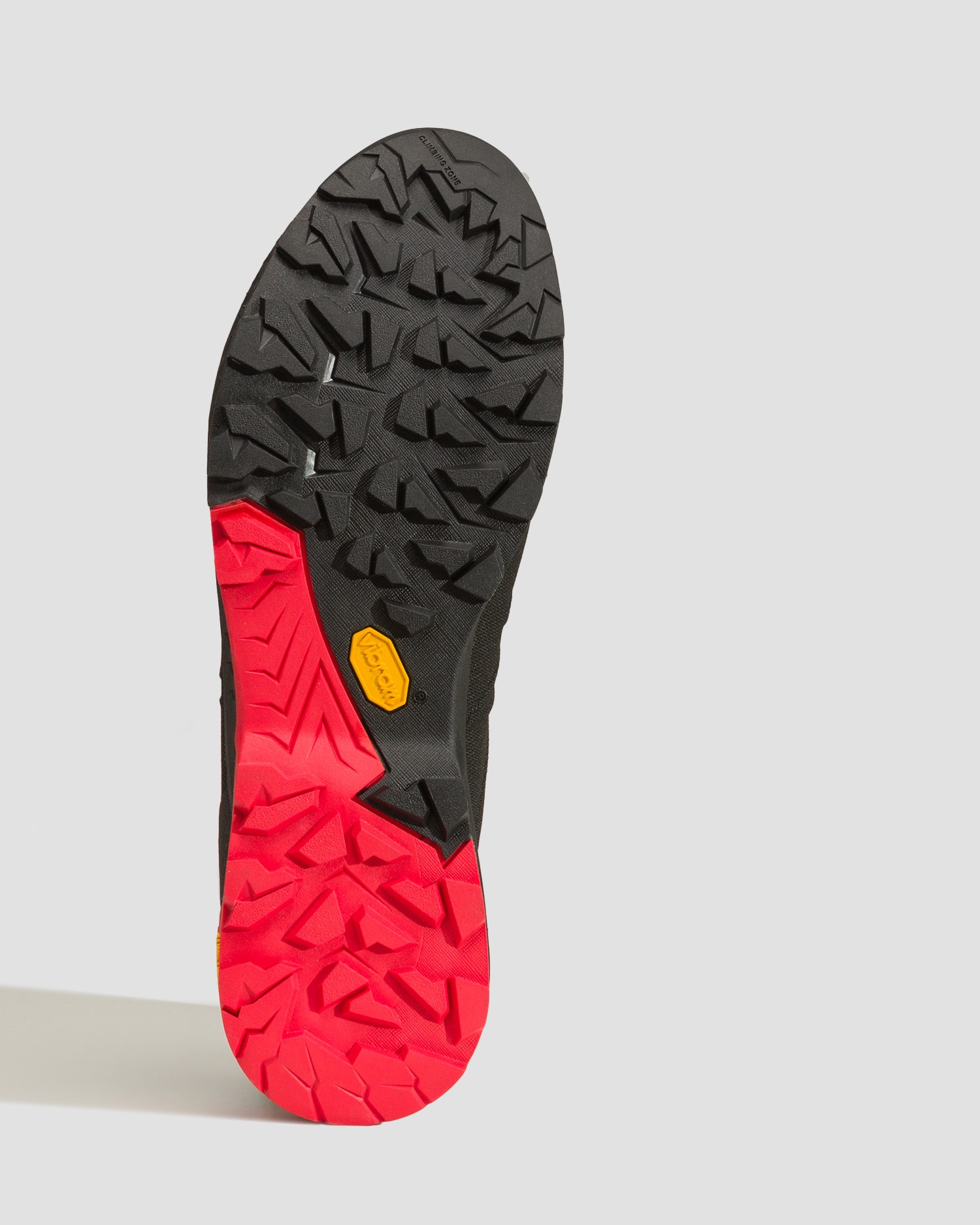 Die Zwischensohle ist so konzipiert, dass sie sich um 360° an den Fuß des Trägers anpasst und auf jedem Terrain für Komfort und Stabilität sorgt. Der Fersenbereich besteht aus weichem EVA-Schaum und garantiert so eine hervorragende Dämpfung und Aufprallschutz. Der vordere Teil hingegen ist steifer und verfügt über eine Kletterzone im Zehenbereich, die für Präzision sorgt und das Gewicht des Trägers auf kleinen Felsvorsprüngen und Rissen trägt, ohne sich zu verbiegen.