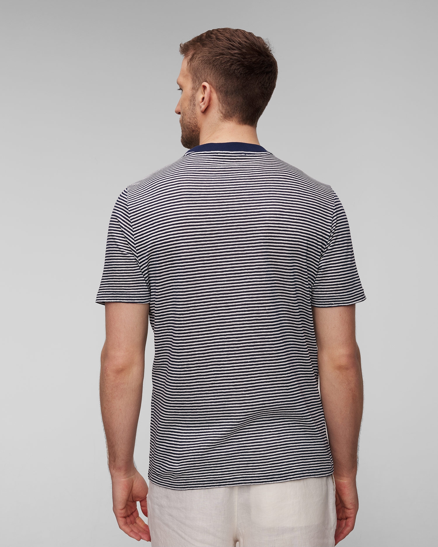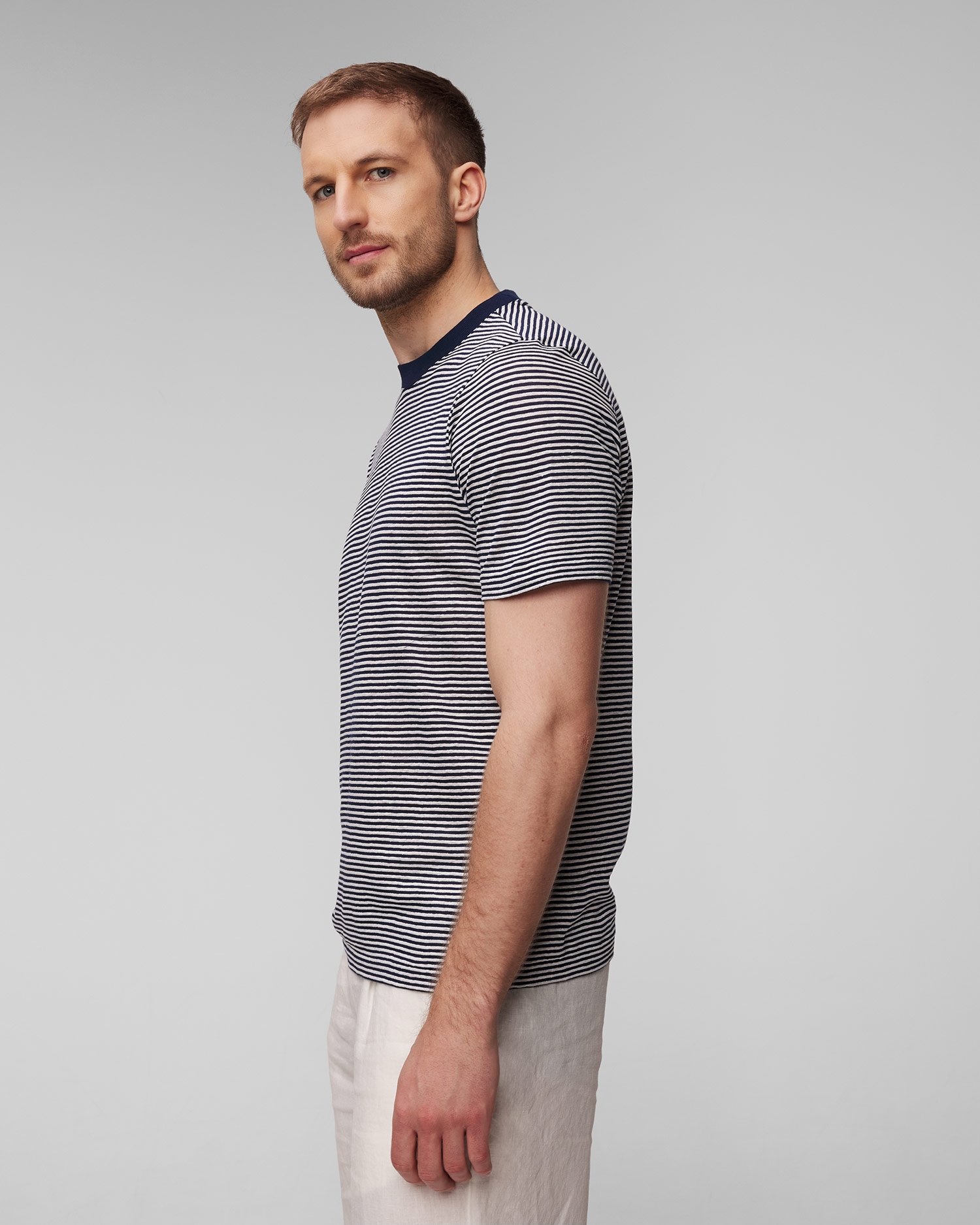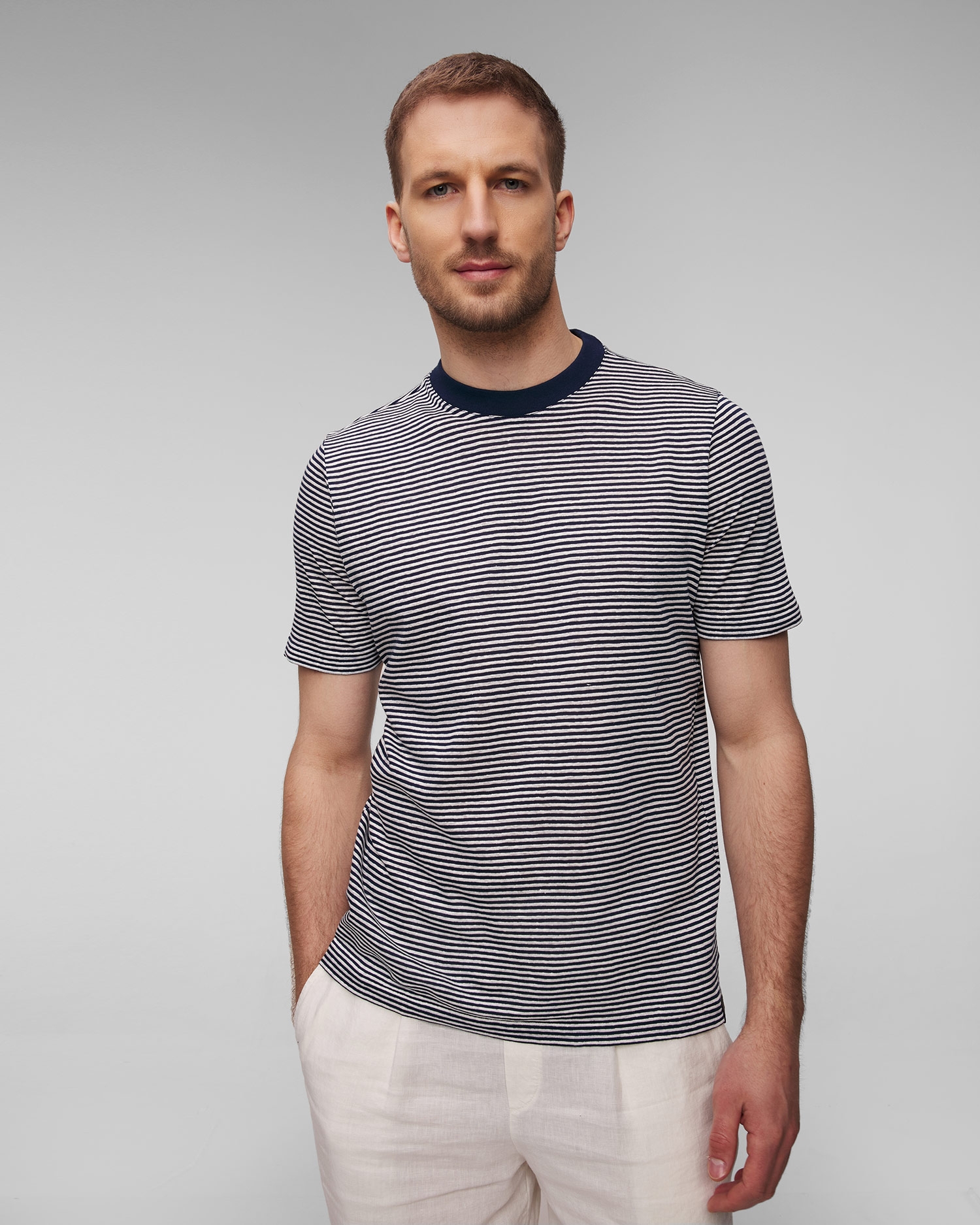 Hergestellt aus luftigem Leinen-Baumwoll-Jersey, der den ganzen Tag über für natürlichen Komfort und Frische sorgt. Gerippter Halsausschnitt in Kontrastfarbe. Alles mit Streifenmuster.