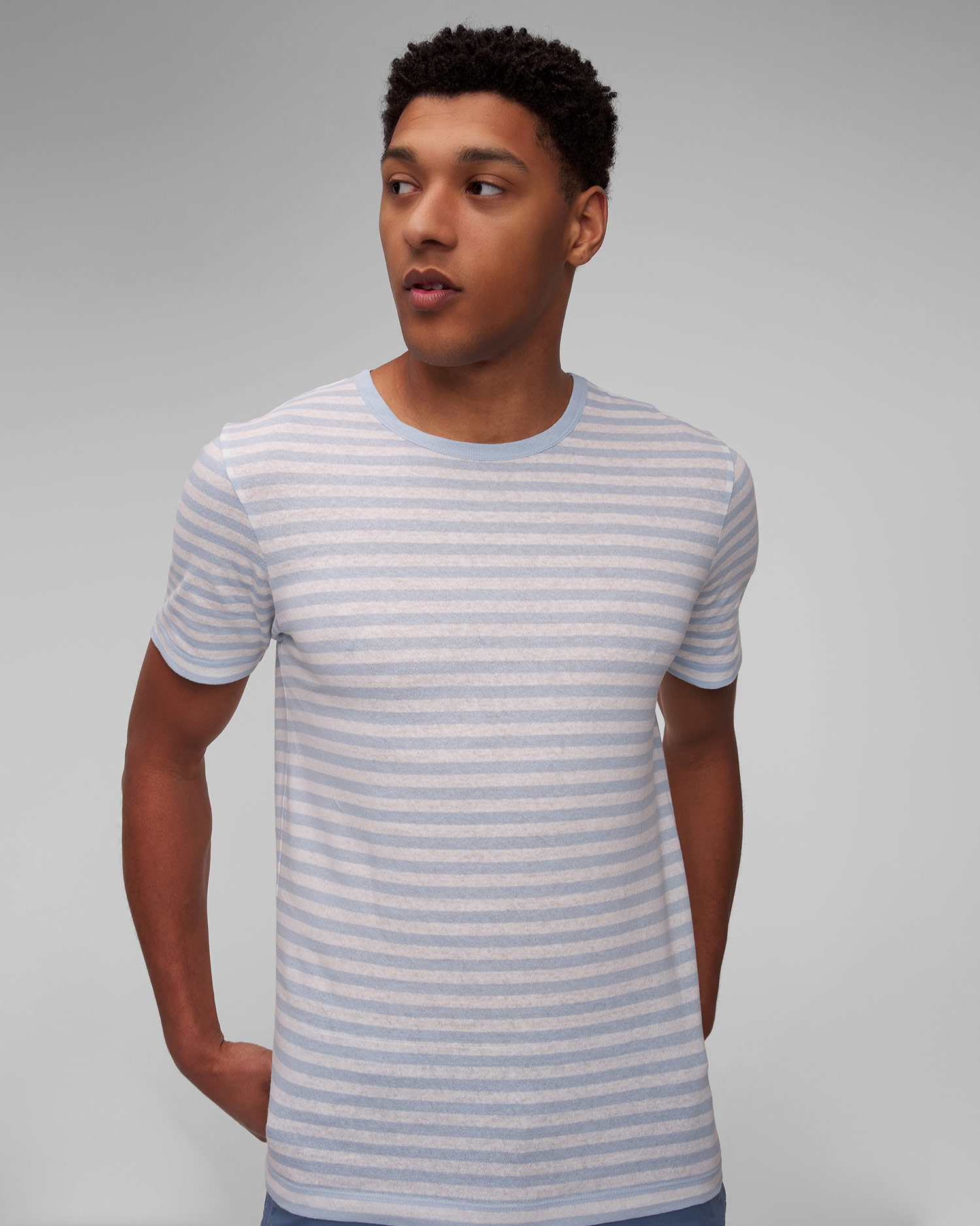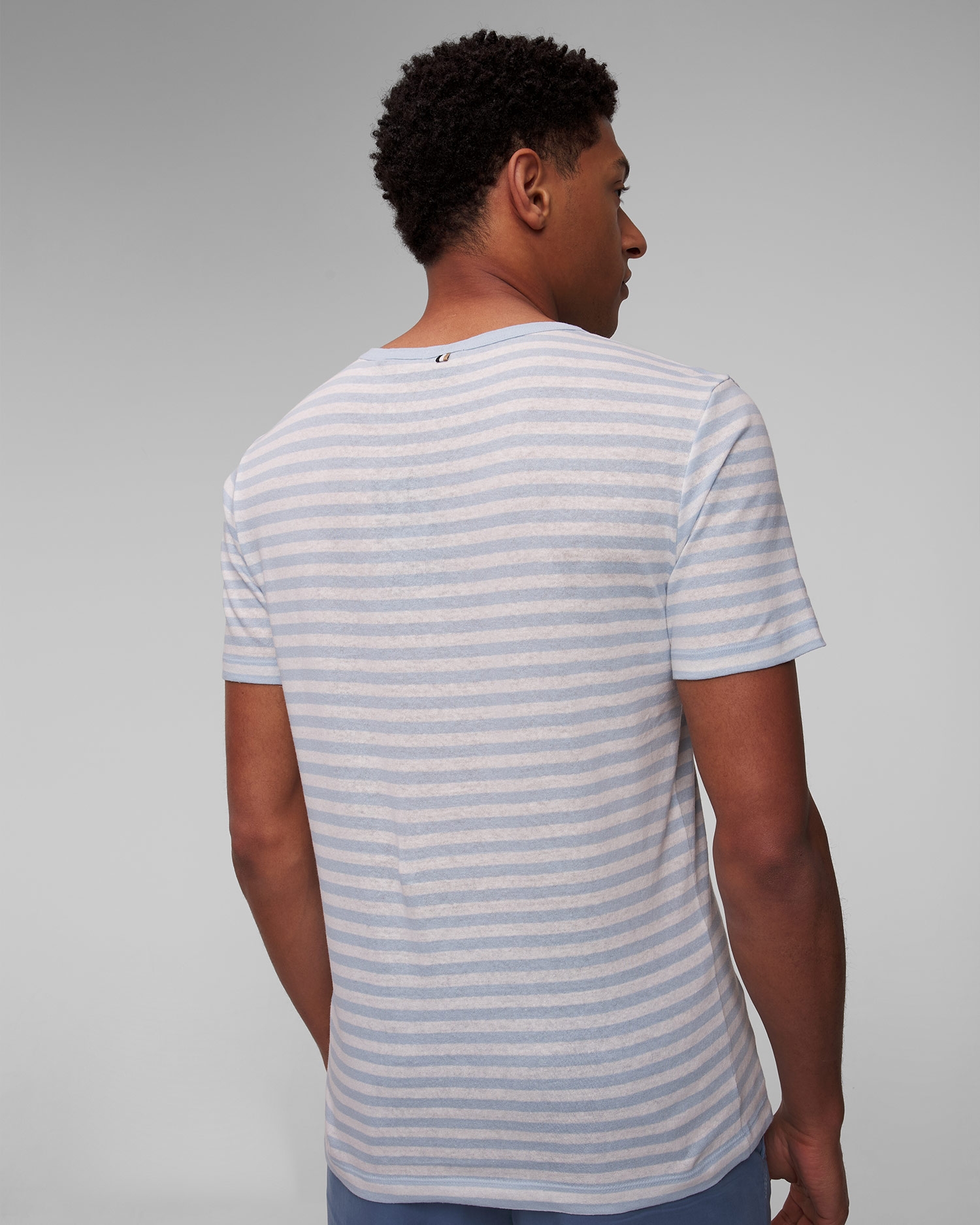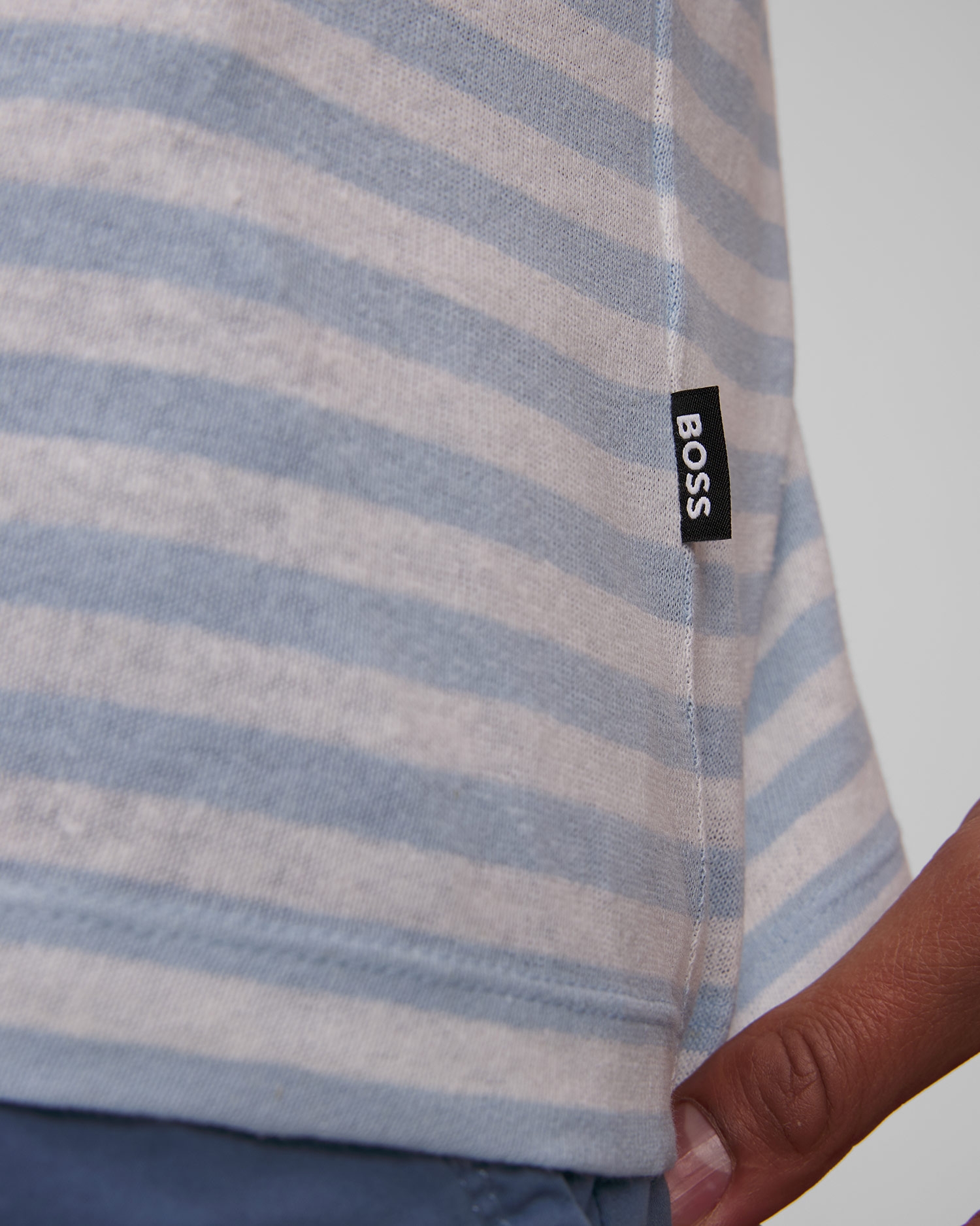 Das Hugo Boss Tiburt Herren-T-Shirt ist ein Sommerangebot mit normalem Schnitt und horizontalen Streifen. Hergestellt aus Baumwolle und Leinen – eine Fasermischung, die für Frische und Komfort sorgt. Rundhalsausschnitt mit Paspelierung.