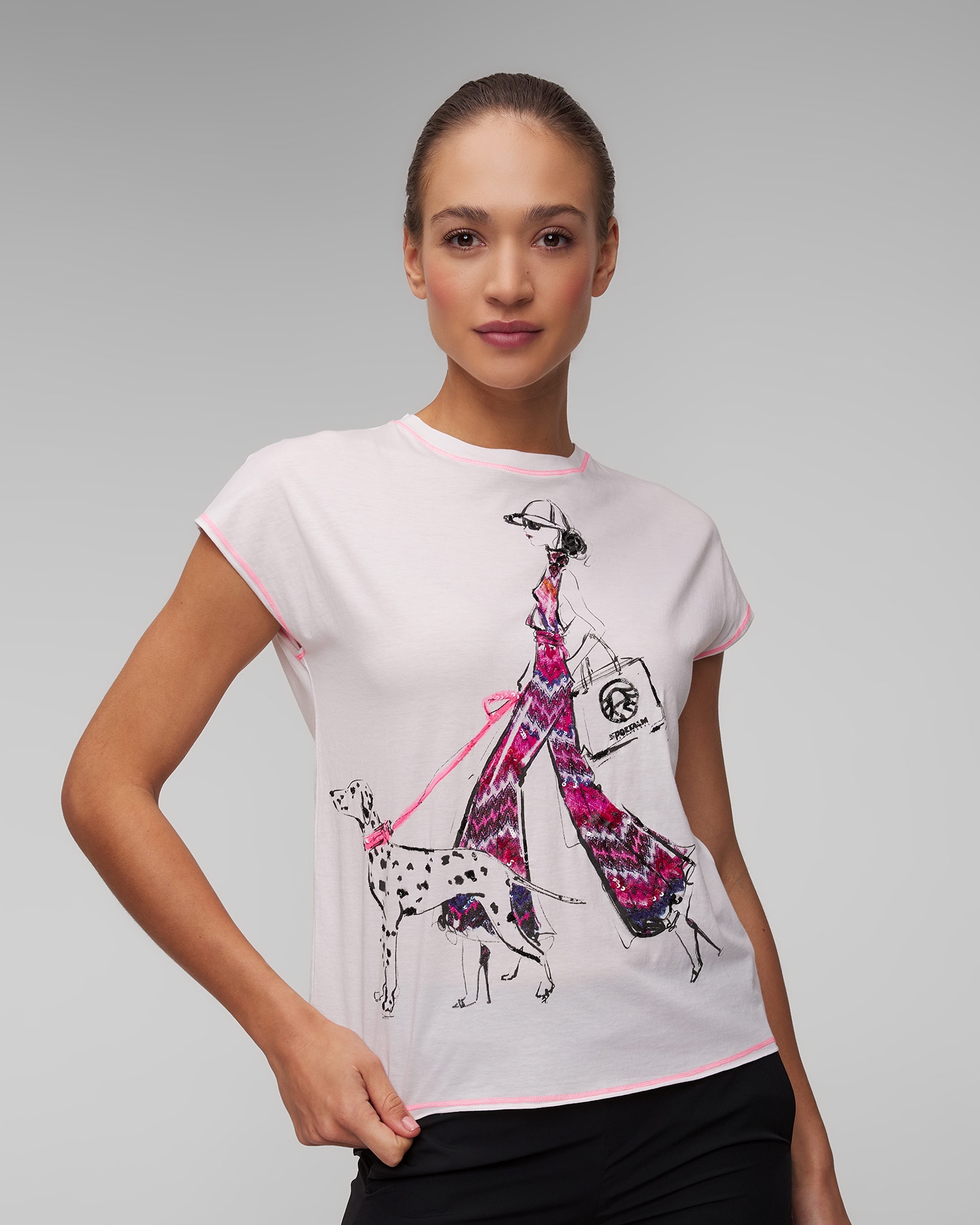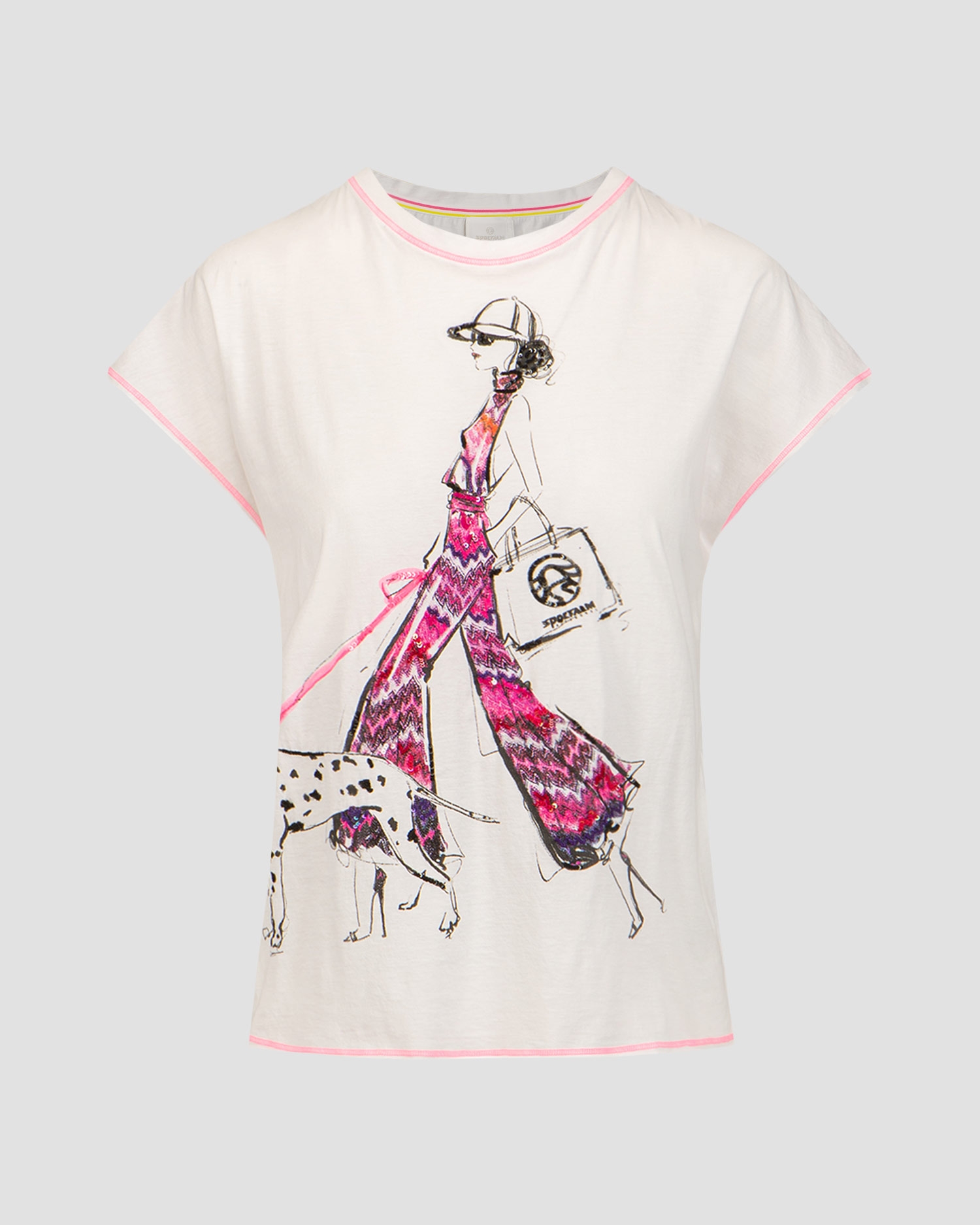Das bedruckte Damen-T-Shirt von Sportalm ist sowohl in der Stadt als auch im Urlaub perfekt. Regulärer, taillierter Schnitt, runder Ausschnitt und sehr kurze Ärmel mit neonfarbenem Overlock. Der mit Pailletten verzierte Druck unterstreicht den luxuriösen Charakter der Sportalm.