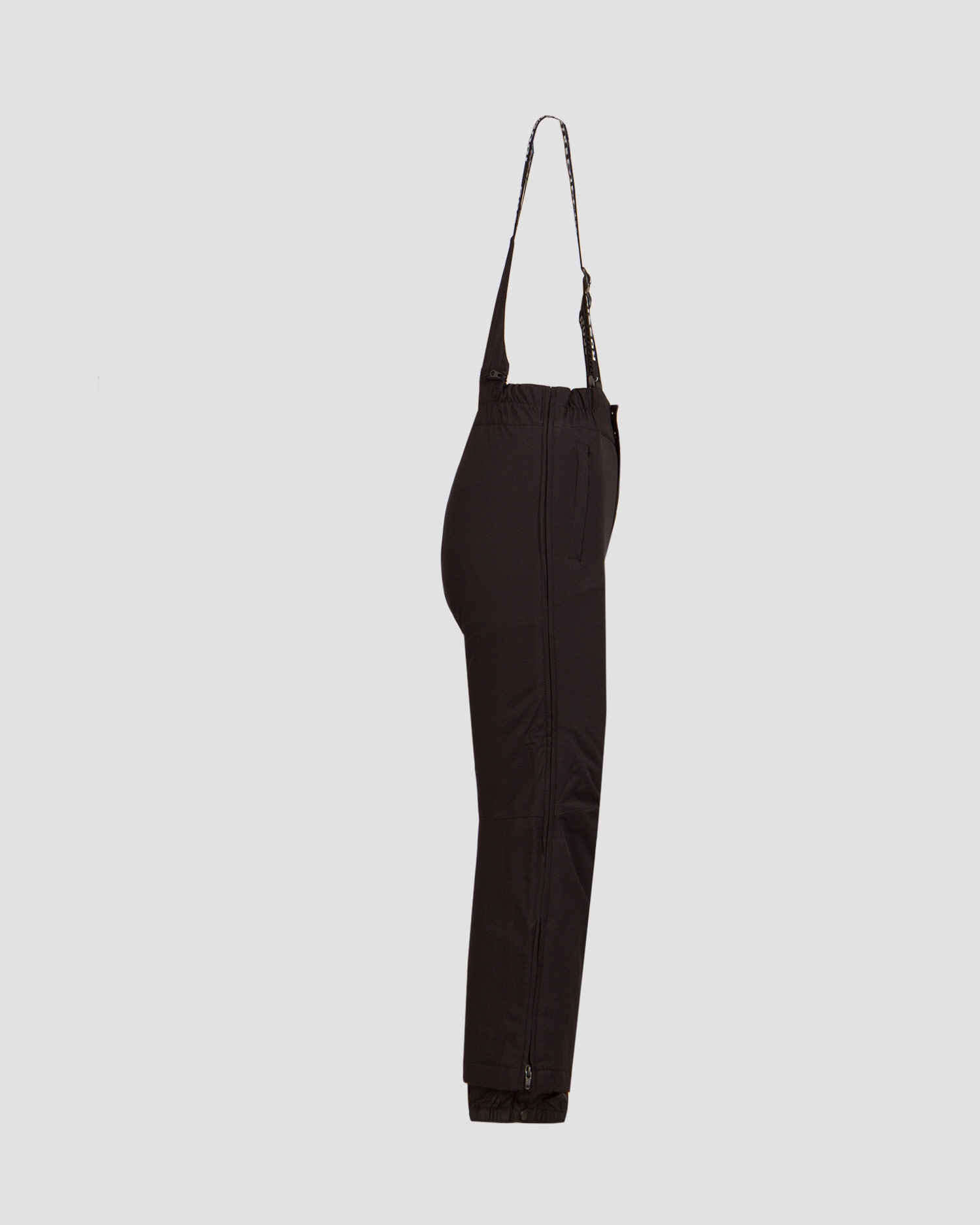 Side zips along the full length of the legs. Internal snow cuffs. Elasticated waistband. Bib with braces that can be detached and leave the trousers alone. Two side pockets with warm lining.