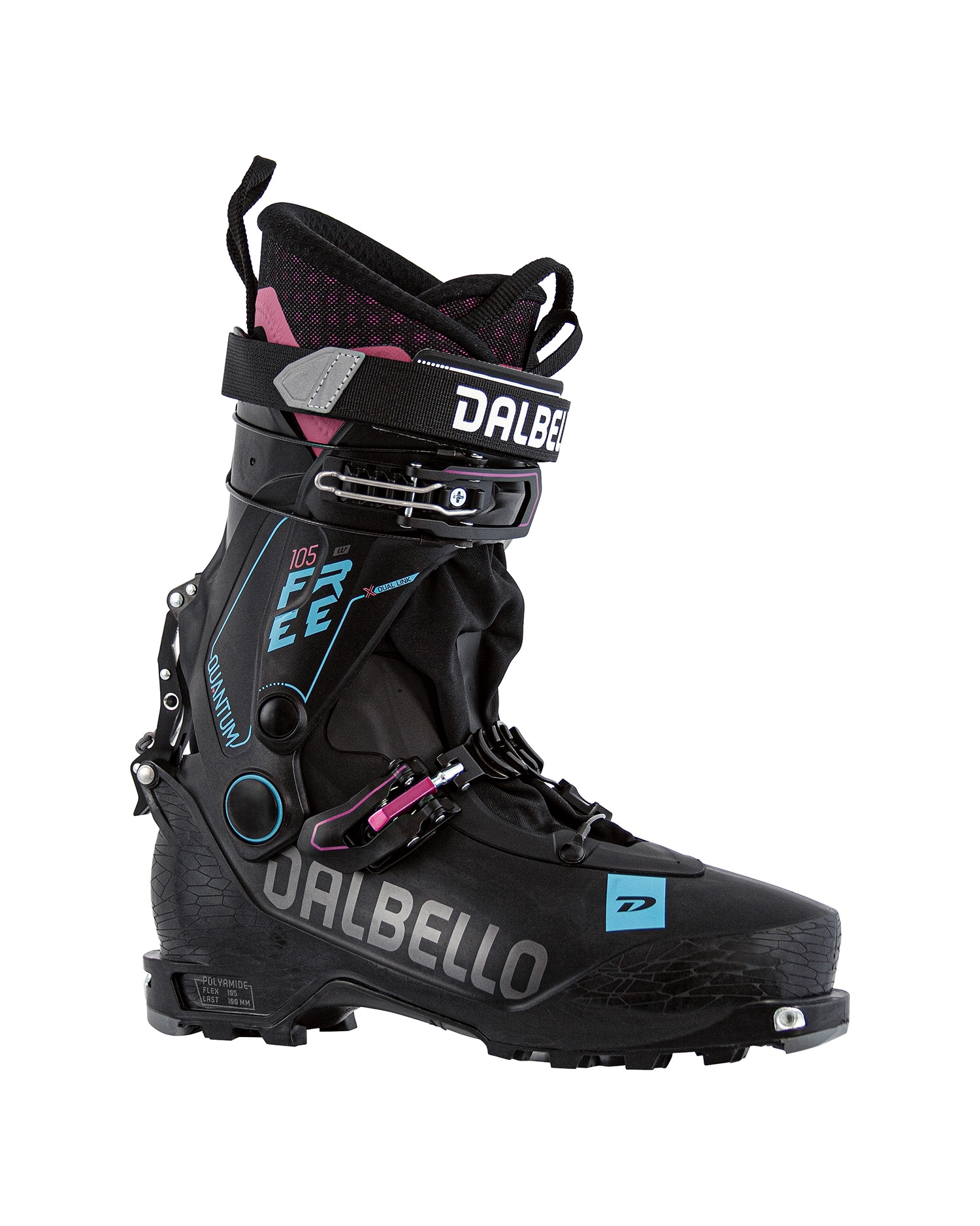 The freetouring-model dedicated to all female riders who ask for a boot with great downhill and smooth uphill performance. Top handling and easy step in/step out comfort included! The Quantum Free 105 W is specifically designed for female skiers looking for a very versatile freetouring boot. It combines control and power transmition with smooth and comfortable hiking characteristics in a perfect way. The secret is its innovative, two piece shell and cuff construction that enables little weight, anatomical fit and high rigidity. Still, this stiffness does not effect the freedom of movement at all. Since the two-piece X dual link cuff allows more than a 65° range of movement making hiking easy and effortless! On descents the extended cuff ensures loss-free power transfer, great support and excellent ski control. The wide powerstrap and two easy to grab buckles for effective and smooth closure provide lateral stability. An improved mechanism allows more foreward lean and can very quickly be changed from hike to ride and vice versa. The exclusive women´s IF Touring Sport liner with medium density paddings and extra heel retention offers outstanding comfort and hold and can be adapted to the individual shape of the foot. A profiled Vibram dual density rocker sole offers good grip when walking and climbing plus smooth power transfer to the binding and ski.