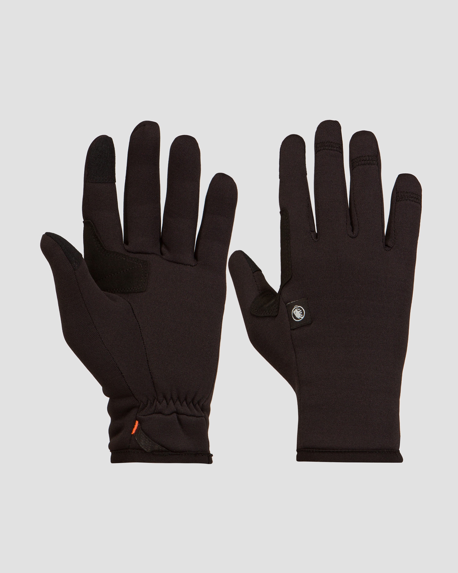 The black Mammut Fleece Gloves are a versatile model that will work well during sports as an insulating layer underneath membrane gloves, as well as for everyday wear. Made of soft and warm fleece. Artificial leather reinforcement at the index finger. Touchscreen-friendly fingertips.