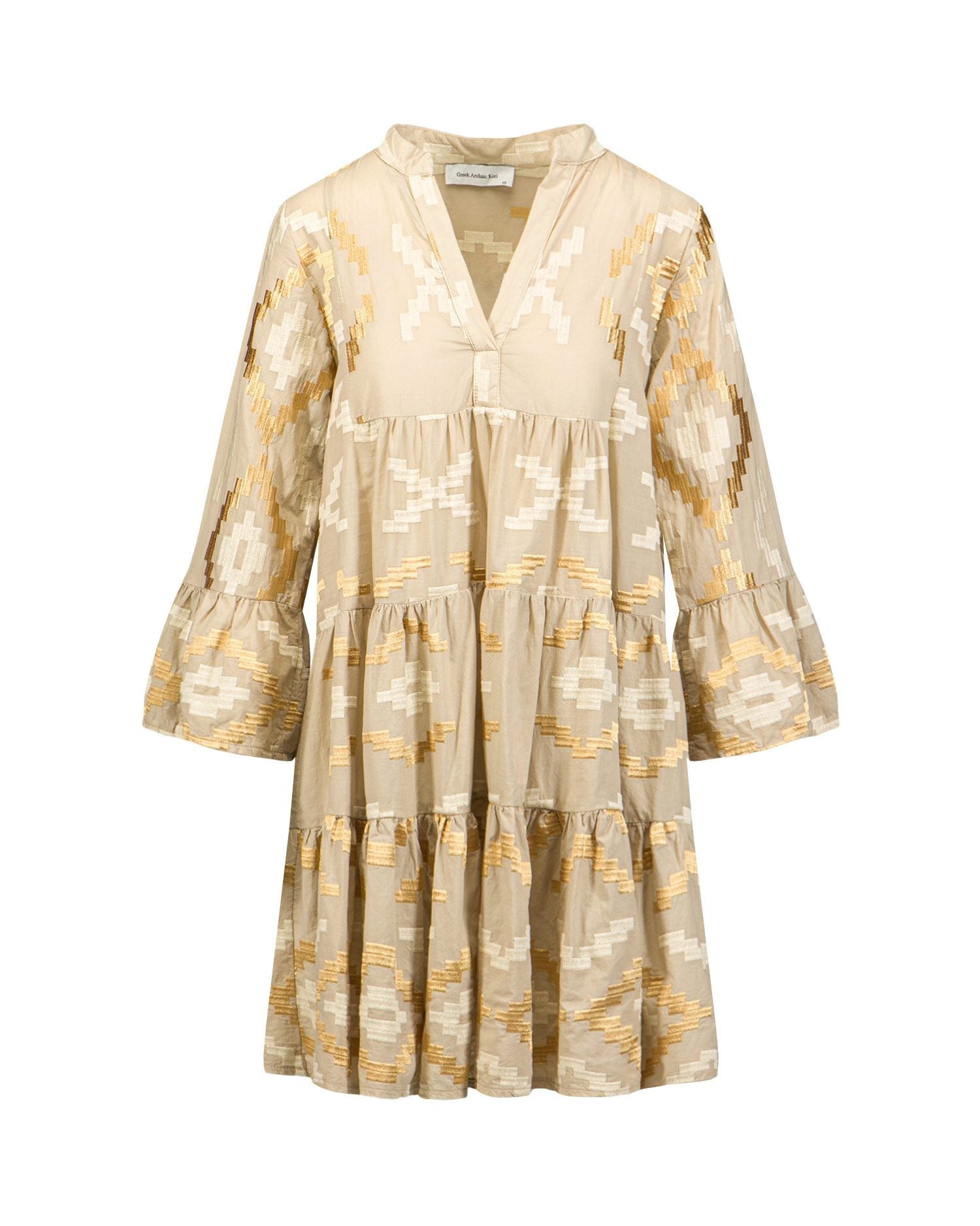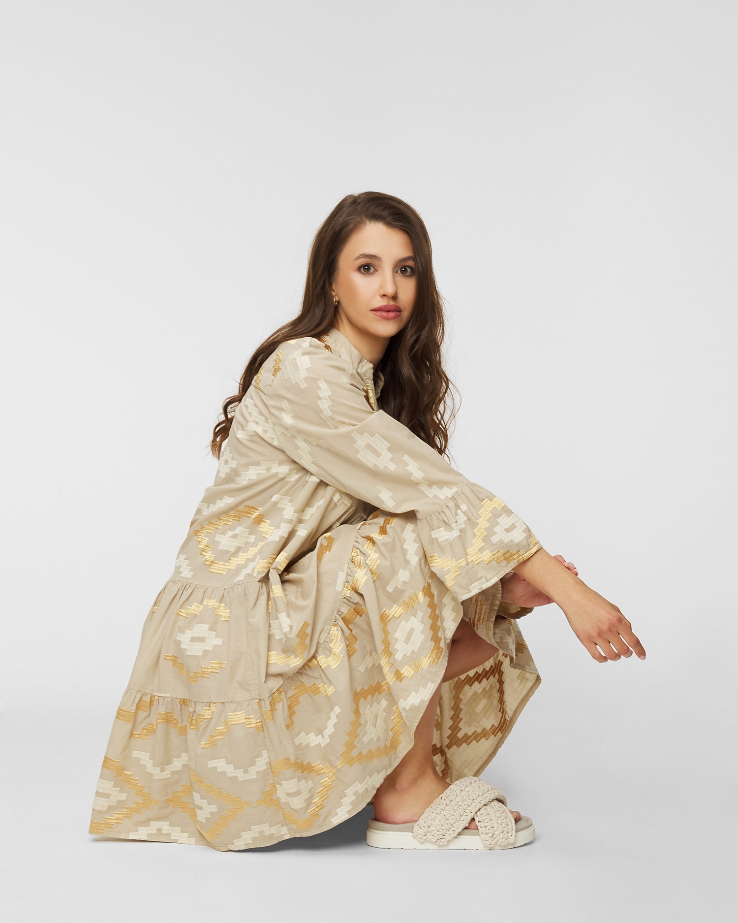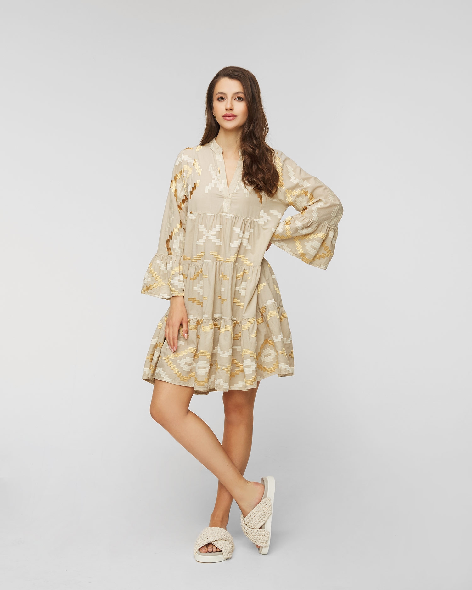 Kori dress will freshen up your summer look. Made from high quality cotton with breathable properties. Lightweight fabric is soft and pleasant to the touch, it ensures comfort during various activities. Loose fit with a V-neck. The dress guarantees comfort and full freedom of movement. Eye-catching embroidered pattern in two colors makes the dress unique.