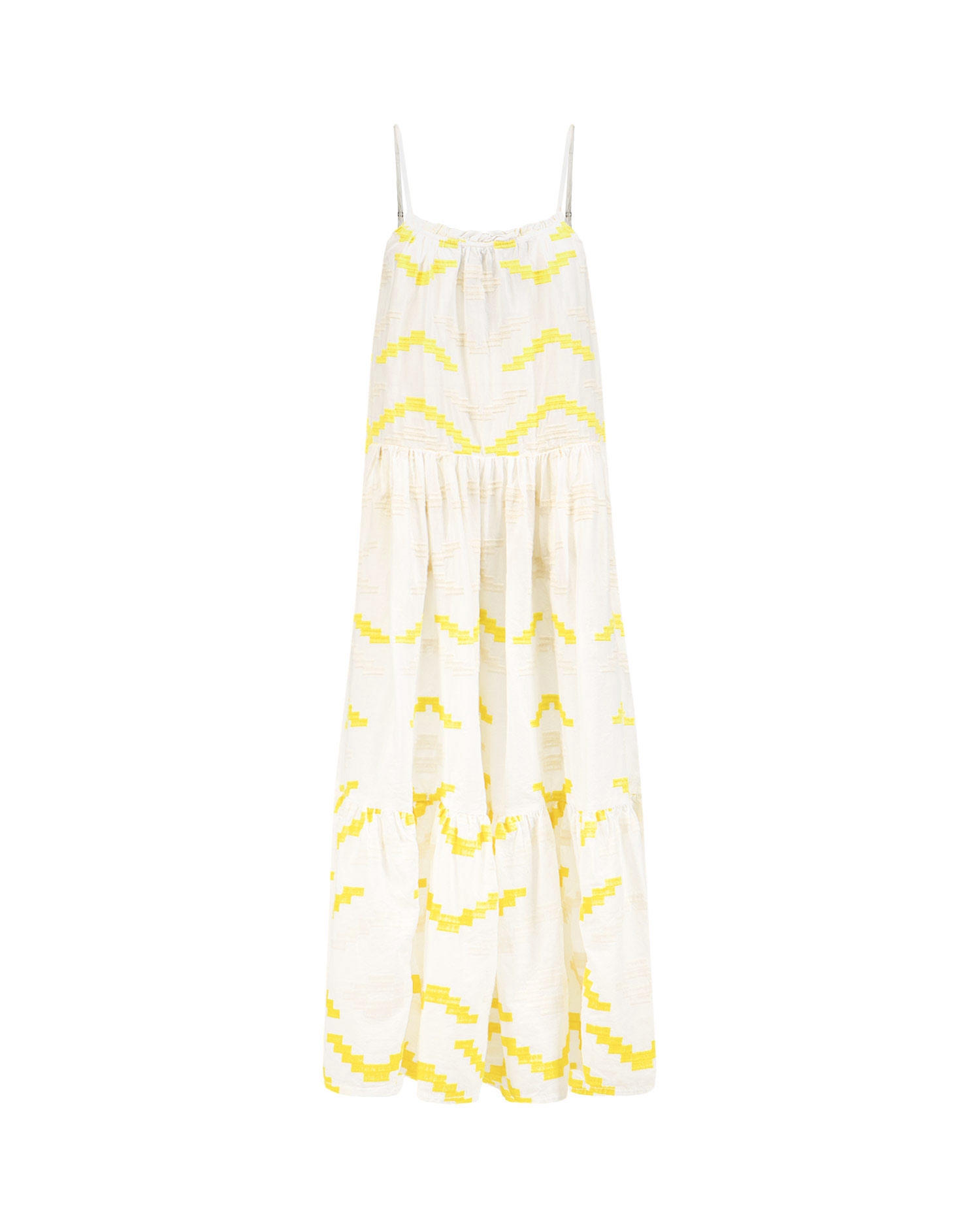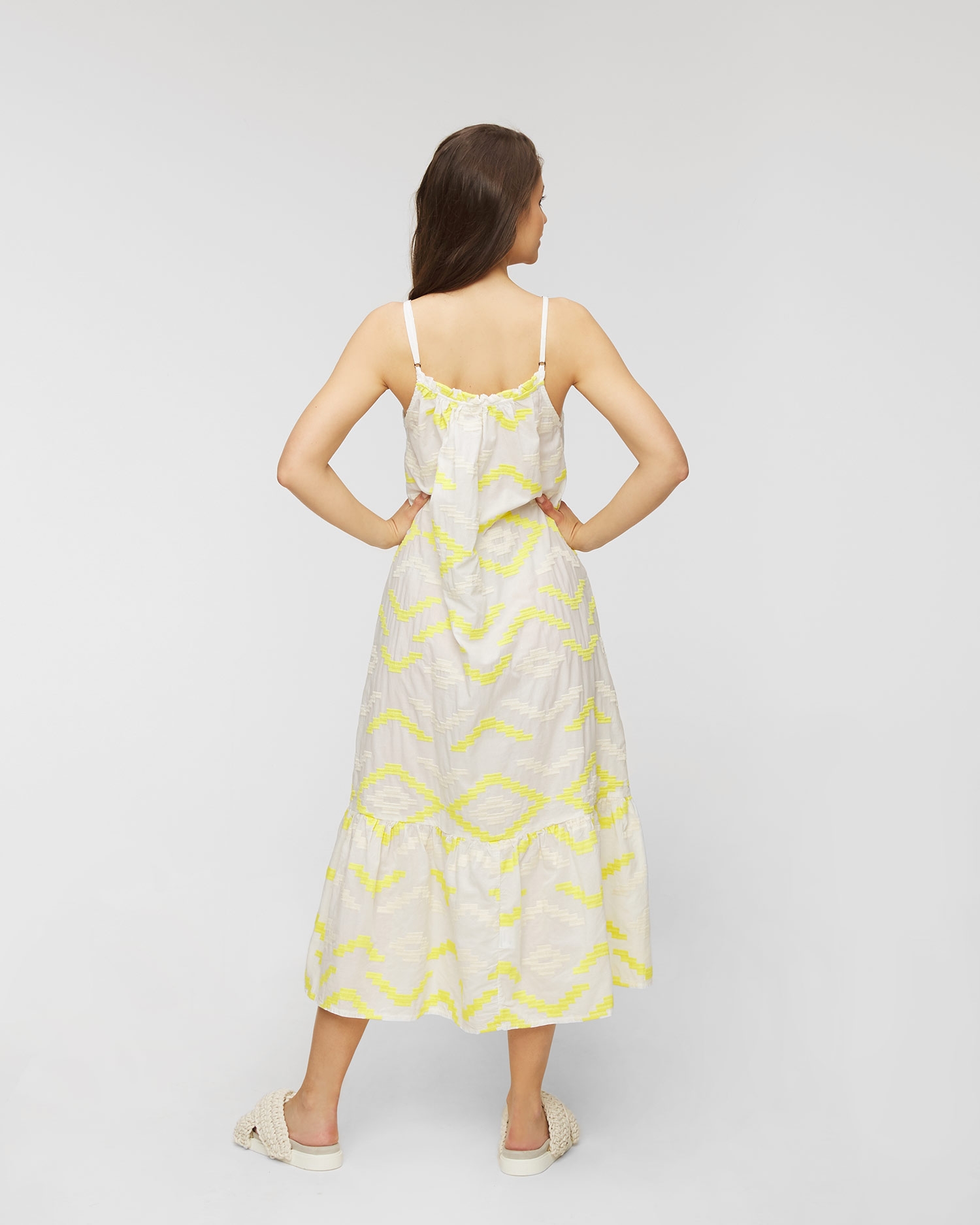 KORI midi dress is a charming piece for hot summer days. Made from high quality cotton with breathable properties that ensure the feeling of comfort during holiday activities. A-line dress ensures freedom of movement. Removable straps allow wearing the dress in two different ways. Two side pockets. Handmade geometrical embroideries make the piece unique.