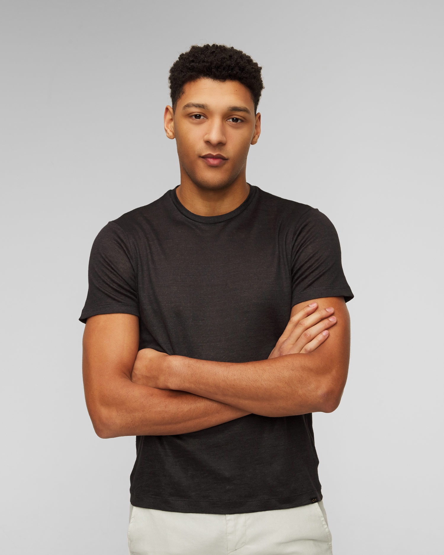 Paul&Shark's men's linen t-shirt will work well for summer styling, providing thermal comfort. The use of Délavé linen yarn allows for this unique effect. Classic cut with round neckline. Gold embroidered Paul&Shark logo patch on the left hem.