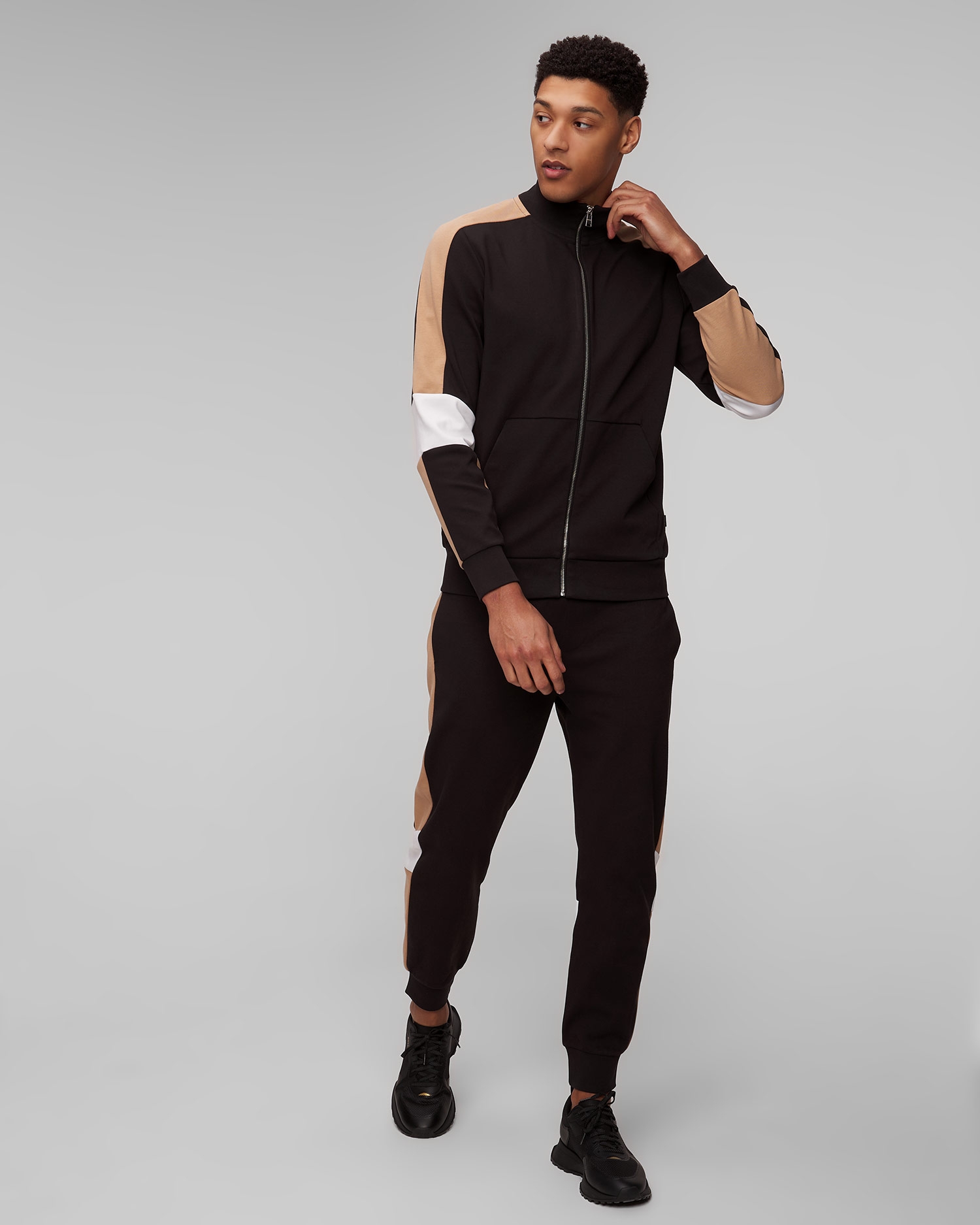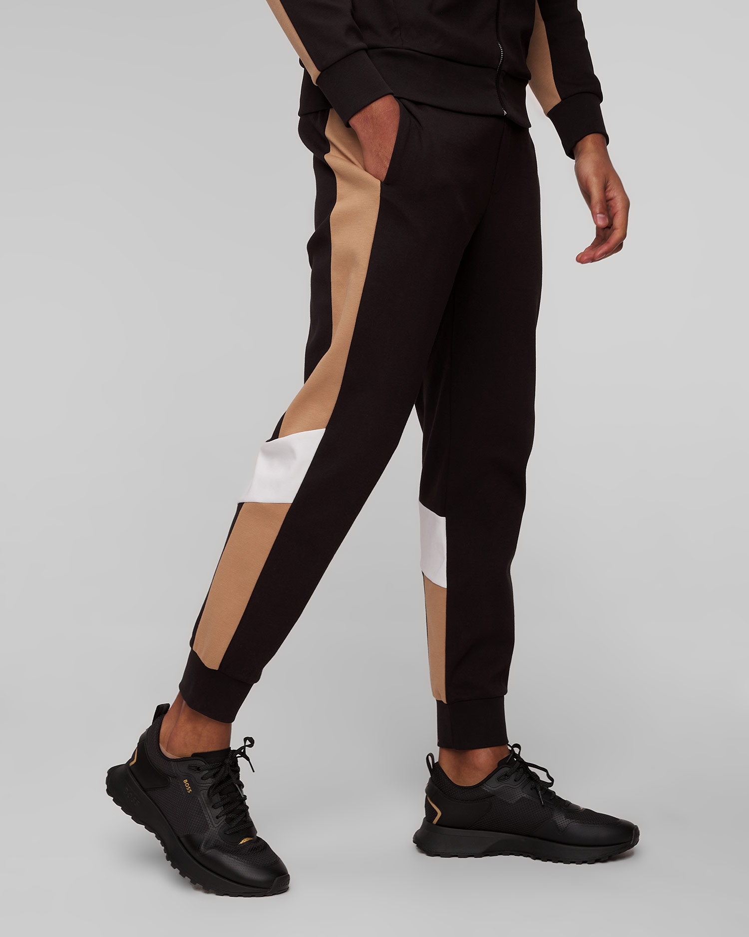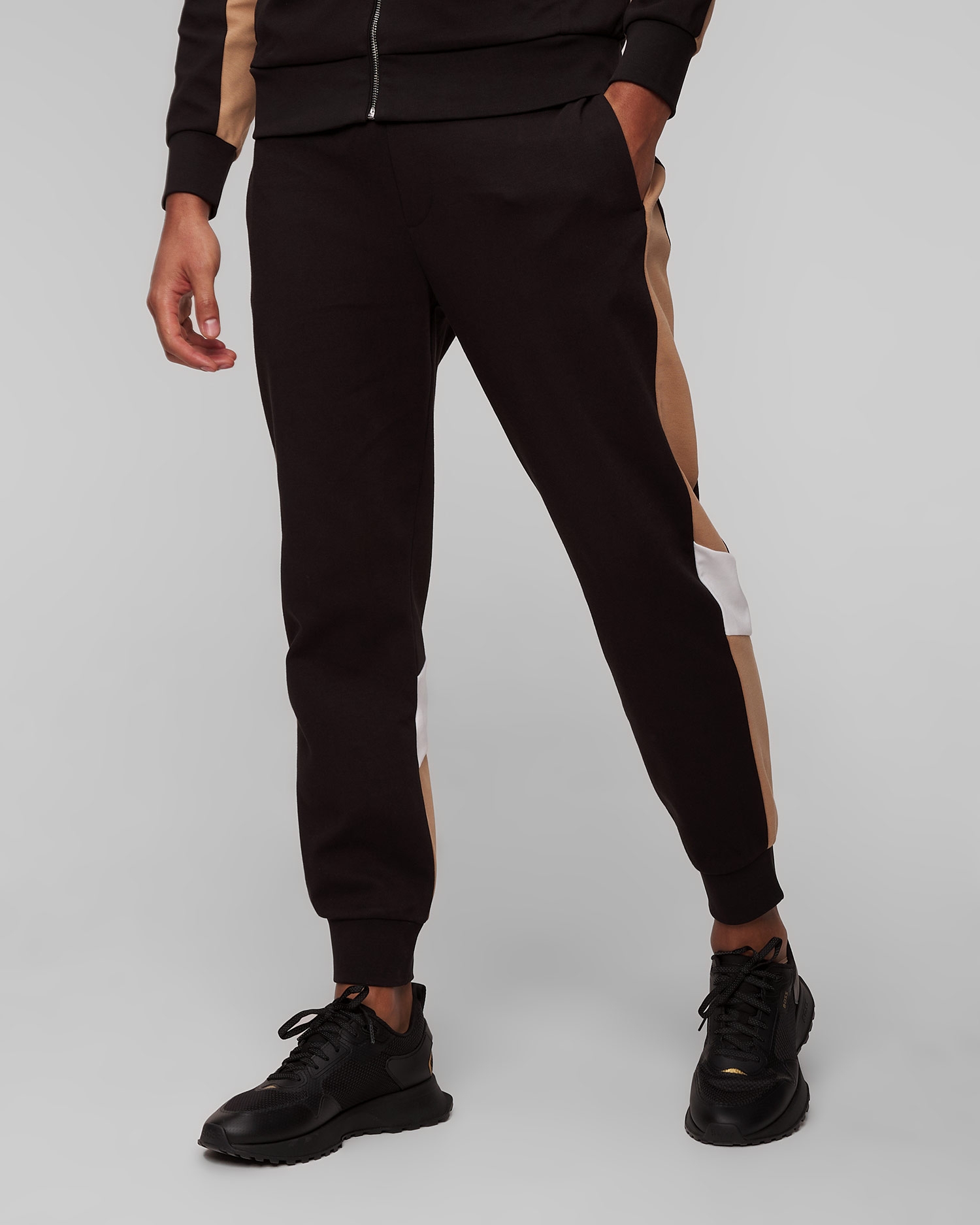 The Hugo Boss Larsen men's colour-block trousers are comfortable and versatile. Cut in a regular fit, with an elasticated waistband with binding. The legs are finished with a ribbed hem. Made of stretch cotton, they will ensure comfort.