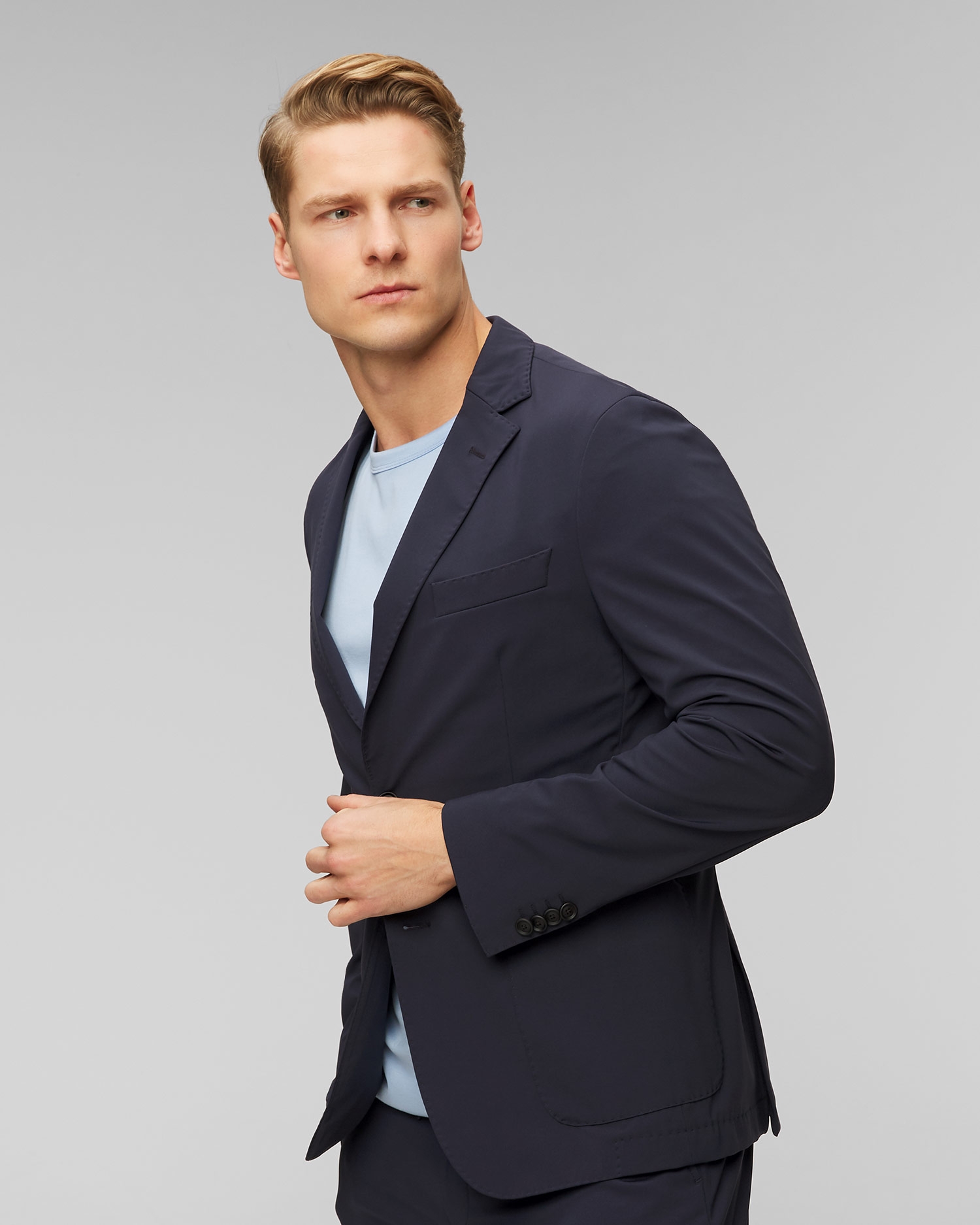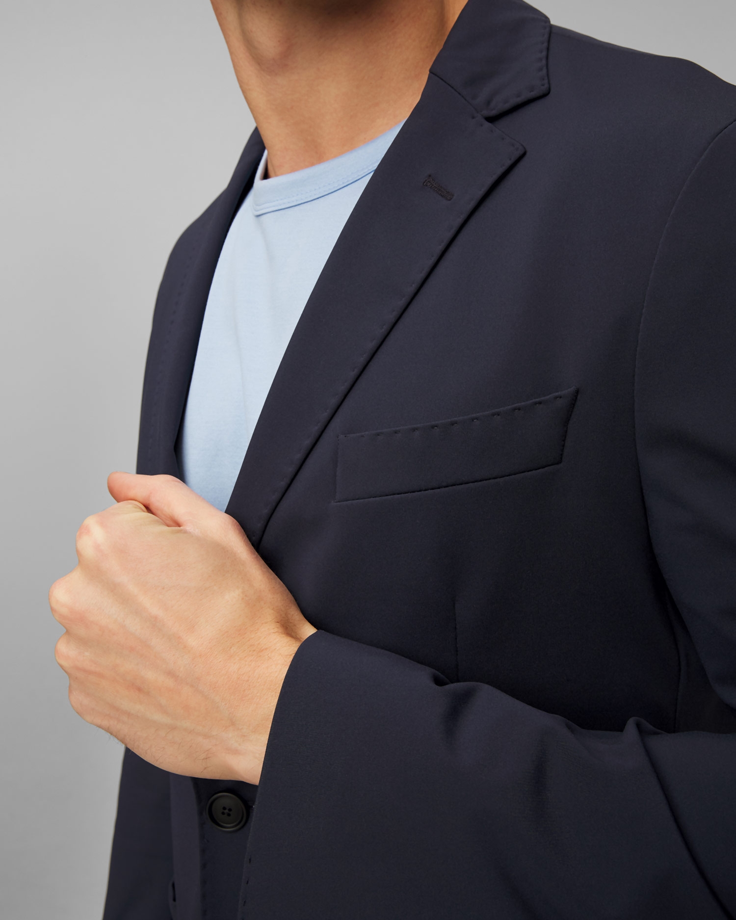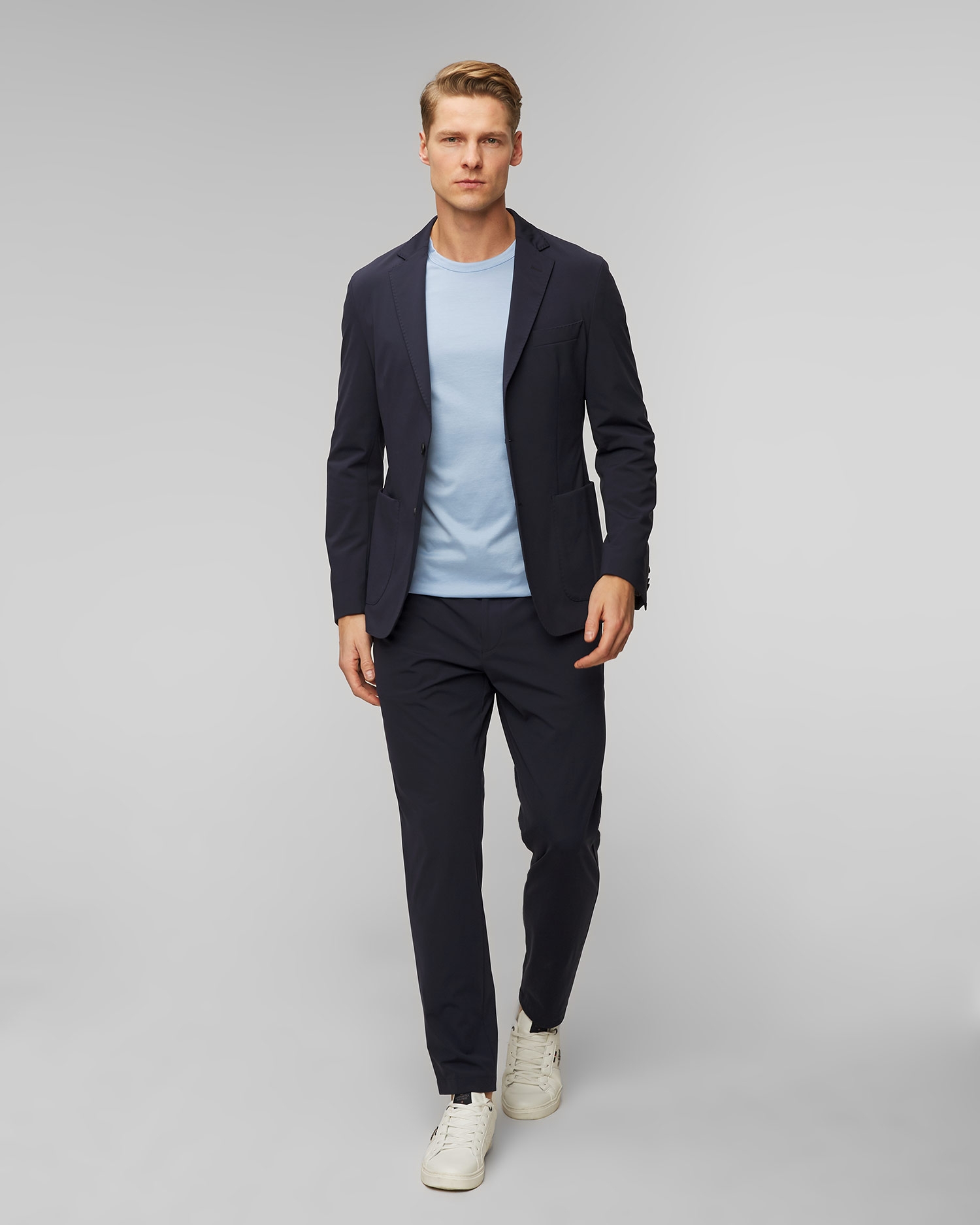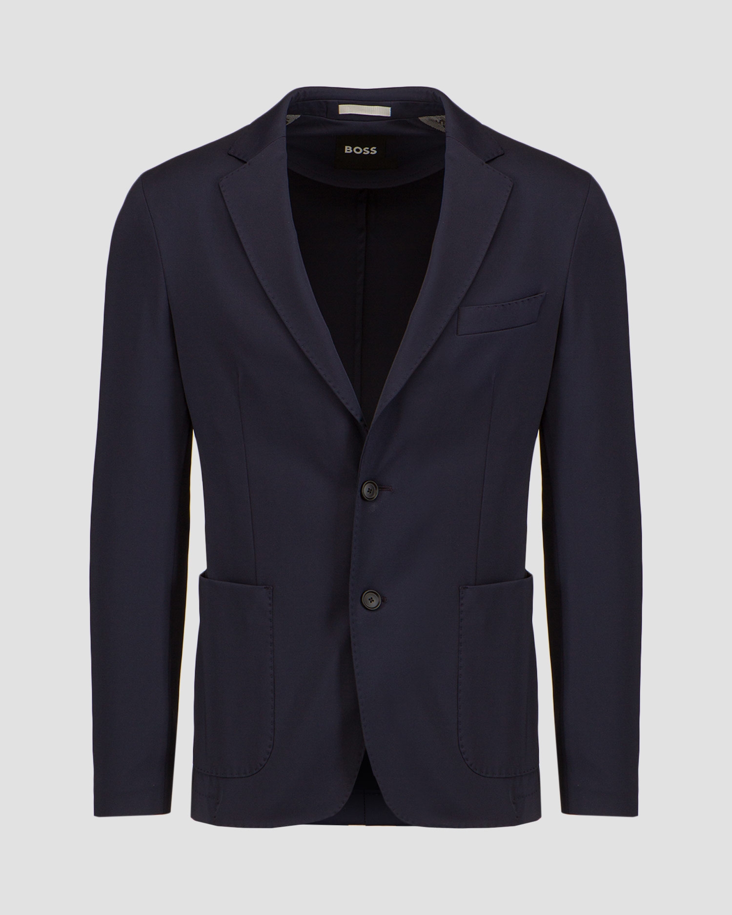 The Hugo Boss P Hanry men's blazer is single-breasted, slim-fit and made from jersey with functional stretch. It features open lapels and a two-button placket. It has two patch pockets and one with a piping on the chest. Unlined.