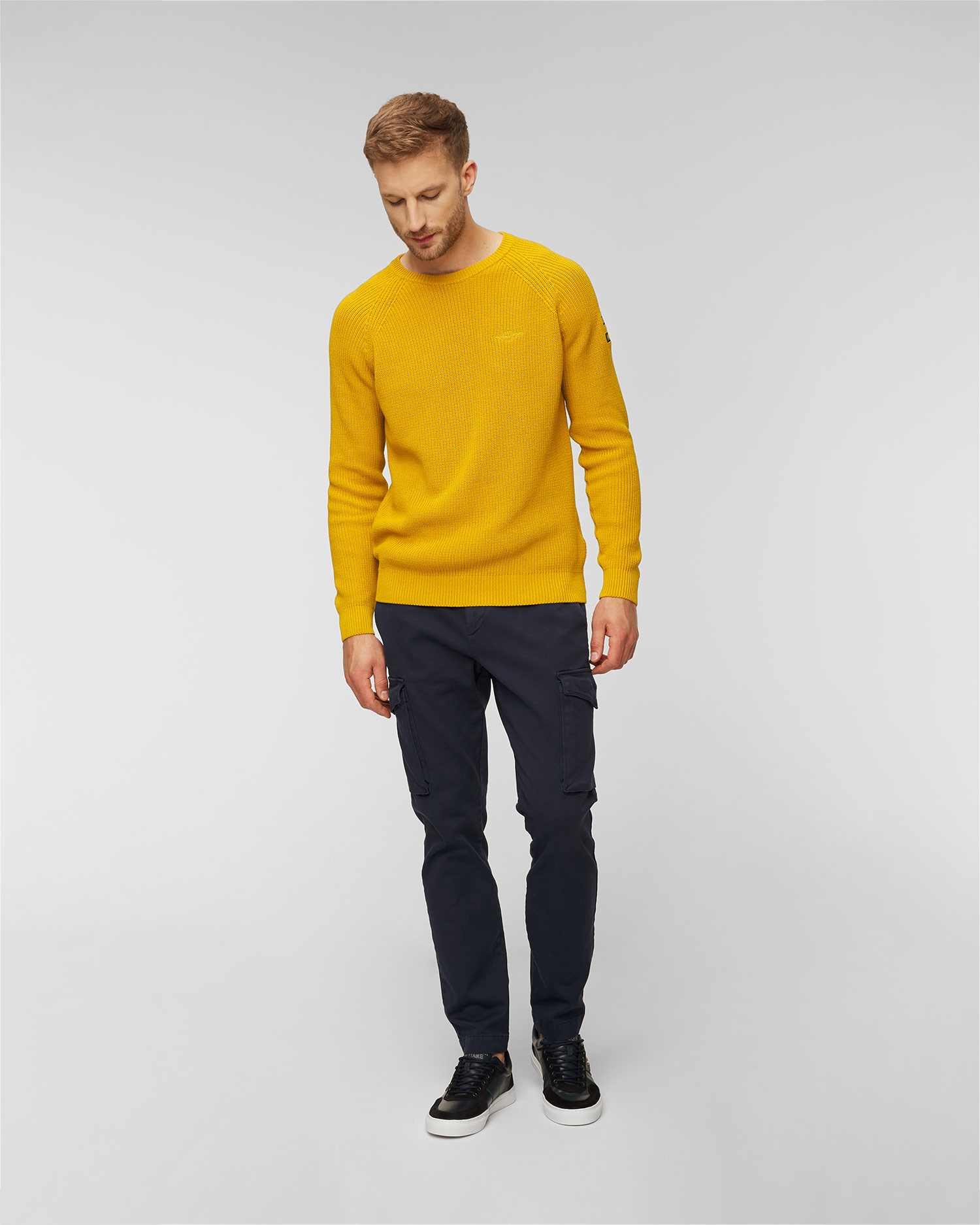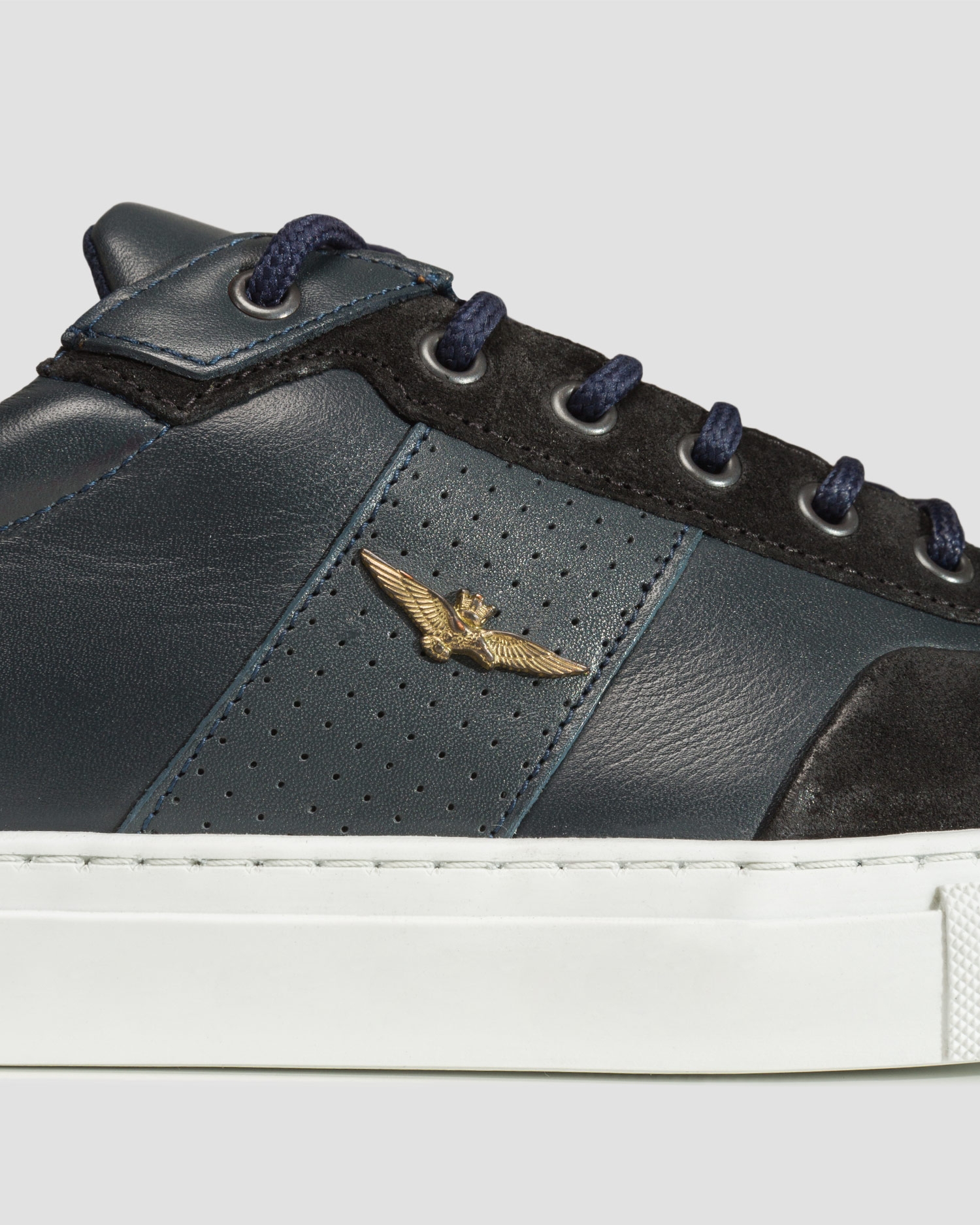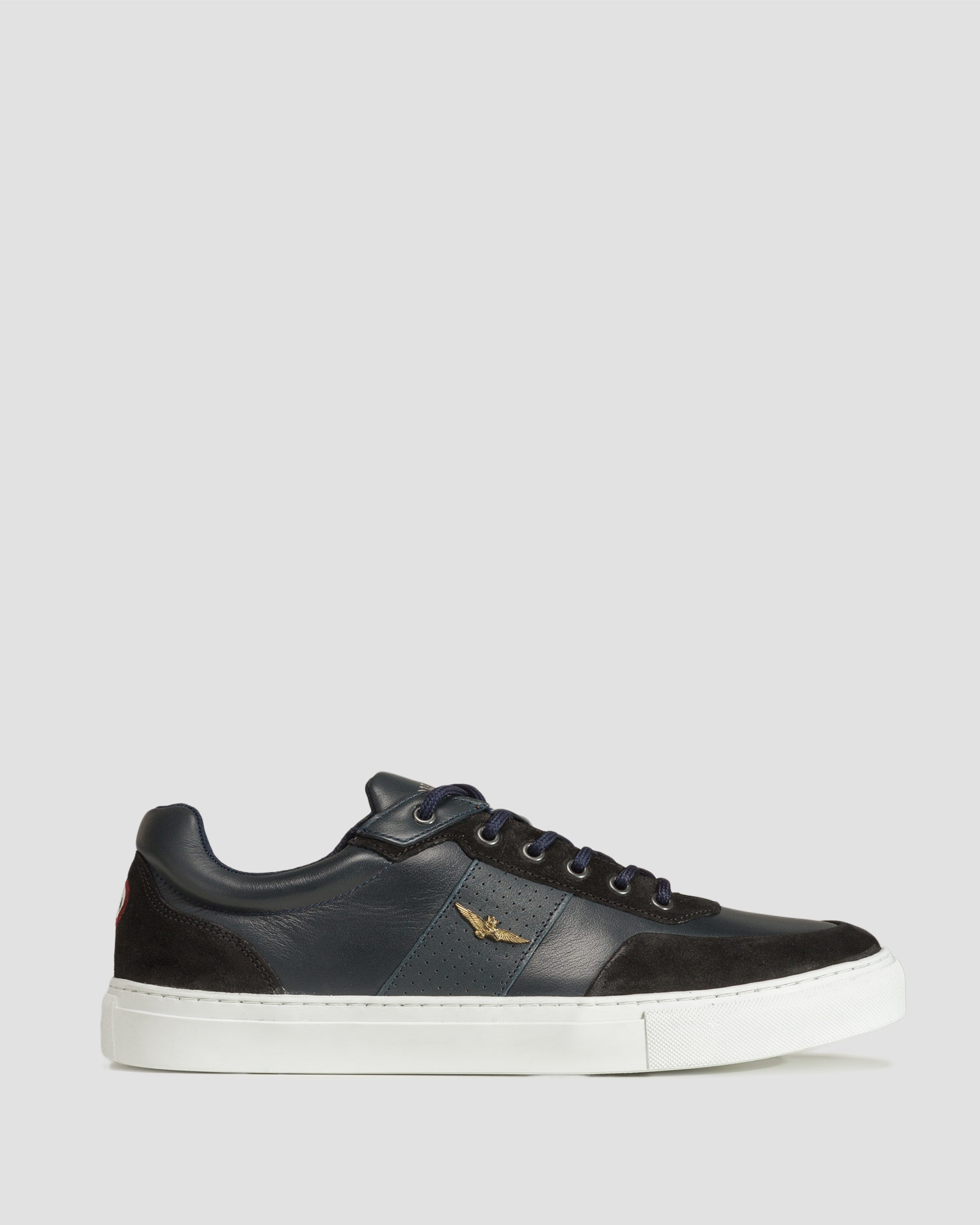 Men's Aeronautica Militare navy blue shoes. Timeless shoes that will complete your everyday city outfit. Sneakers with a low upper, made of natural cowhide leather, which is further enhanced with stylish inserts with small eyelets. They catch the eye with decorative branded details that add a military touch. Shoes with a rubber sole, equipped with an insole made of foam that remembers the shape of the foot, so they fit properly, providing comfort and convenience during daily use.