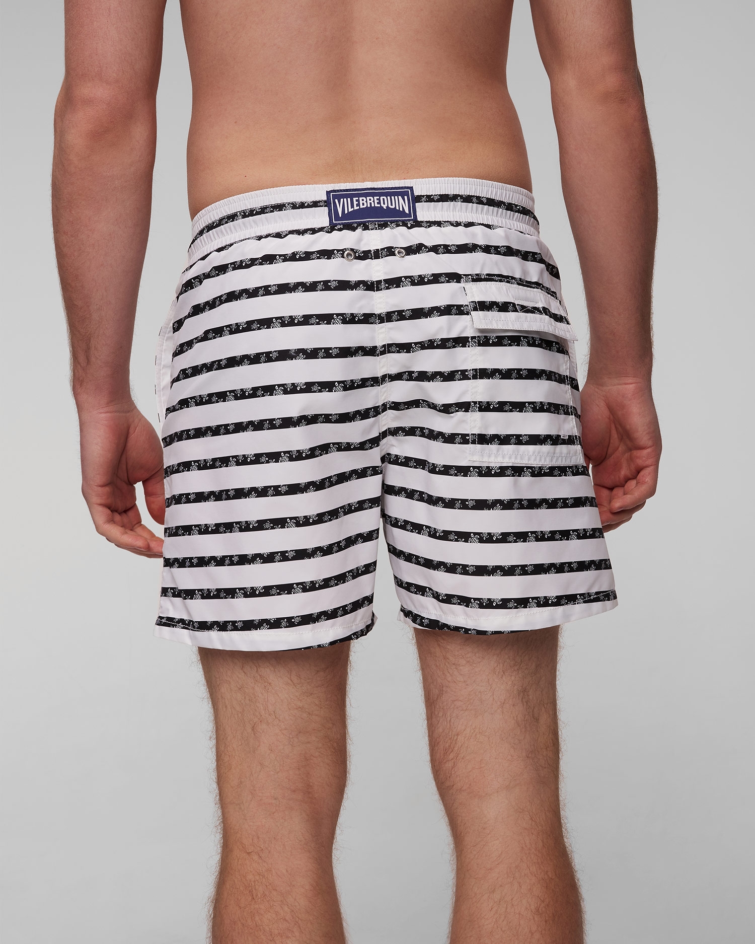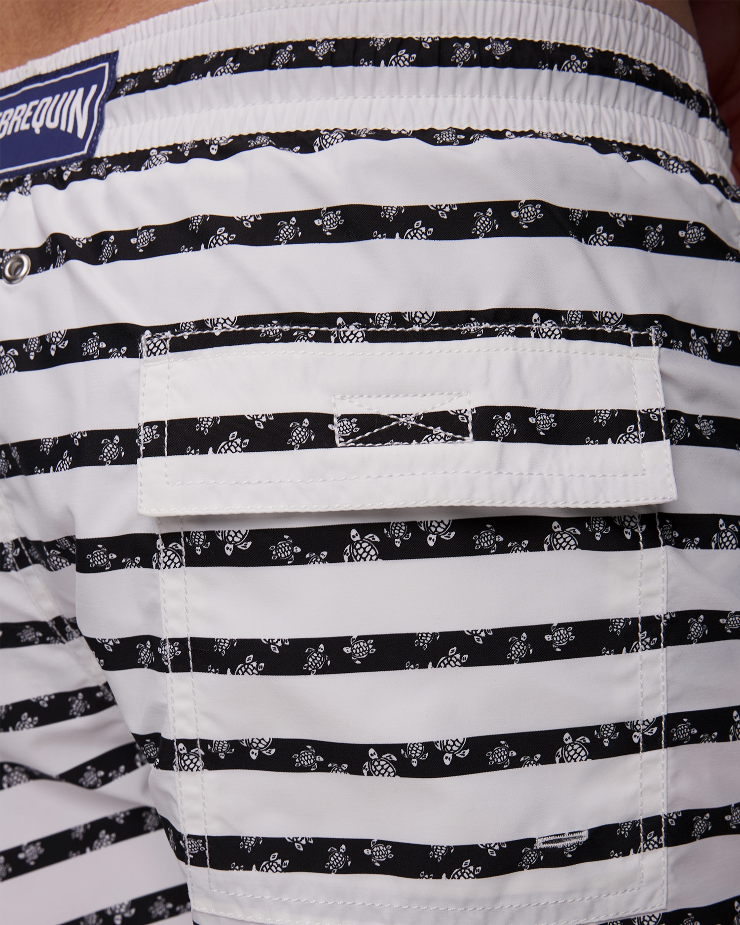 Vilebrequin Moorea men's swim shorts in contrasting stripes and sea turtles. Classic cut with two side pockets and a patch pocket on the back. Elastic waistband, adjustable with braided cord with logo engraved on aglets. Brand name patch on the back, with two wicking rivets below.