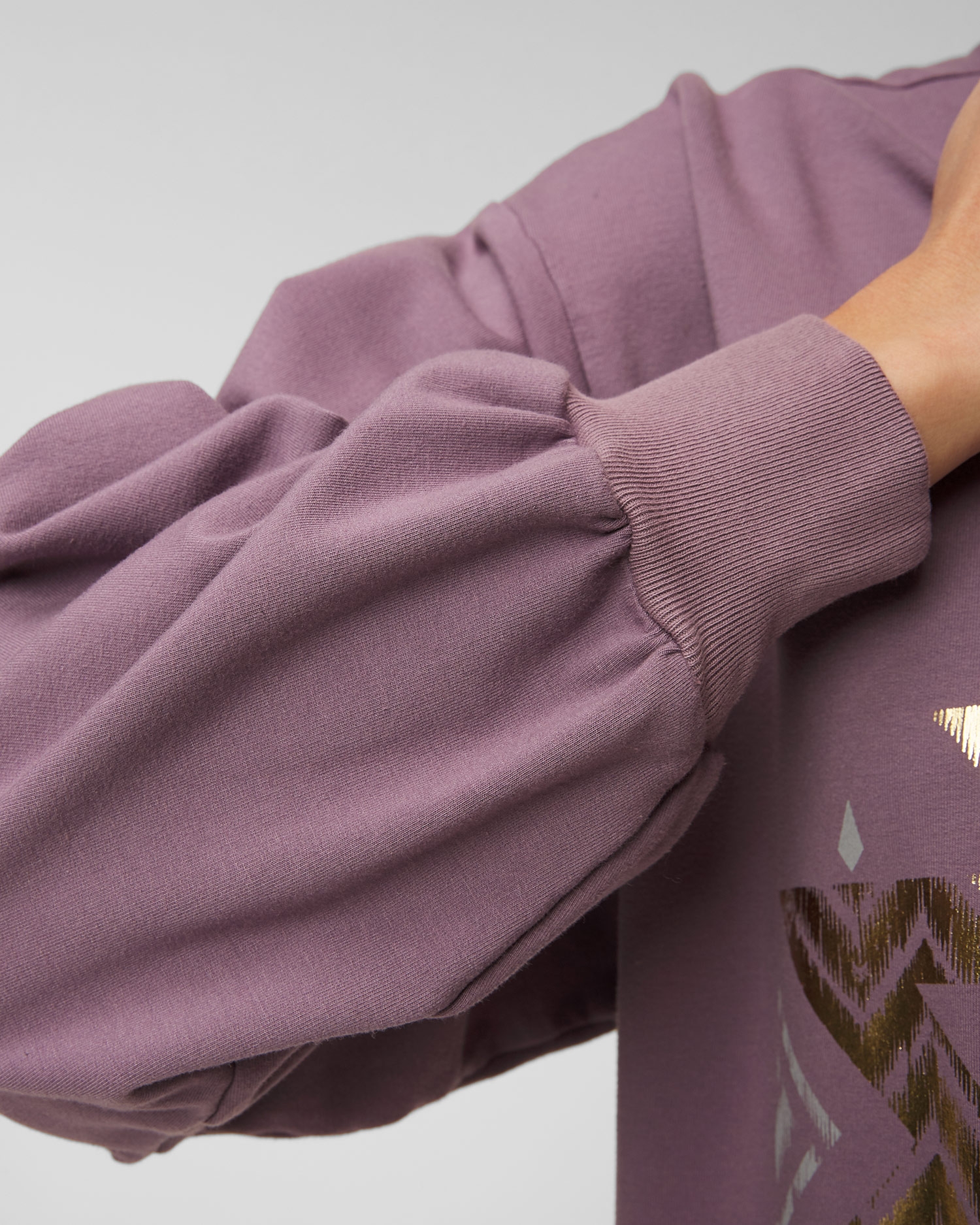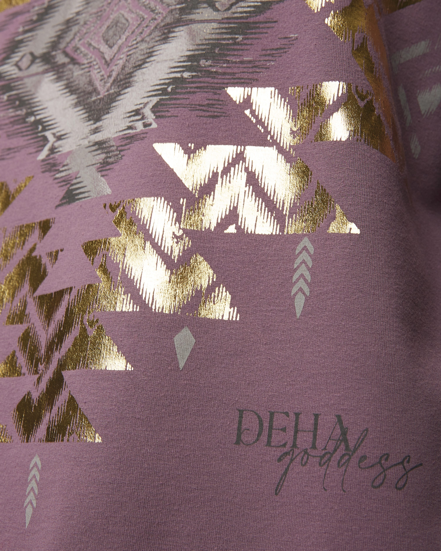 Deha's sweatshirt with a silver and gold Aztec print on the front is a versatile and elegant piece that will work for both everyday wear and yoga practice. The simple, loose-fitting cut with side slits and a lowered shoulder line and balloon sleeves ensures comfort. Modal addition makes the sweatshirt very soft and warm, which gives a pleasant feeling to the skin.