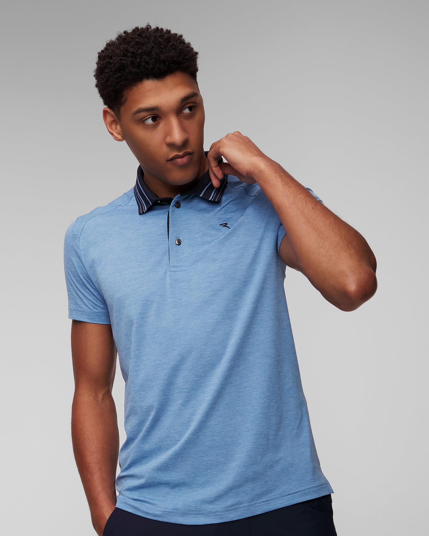 Chervo Aperol men's polo in a minimalist style that combines elegance and sporty vibe, which is highlighted by the melange fabric. Made of soft and delicate technical fabric with quick-drying properties. DryMatic treatment ensures efficient moisture wicking and freshness throughout the day. The sunscreen protects the skin from UVA and UVB rays. Ribbed shirt collar in contrasting color. Embroidered logo on the chest.