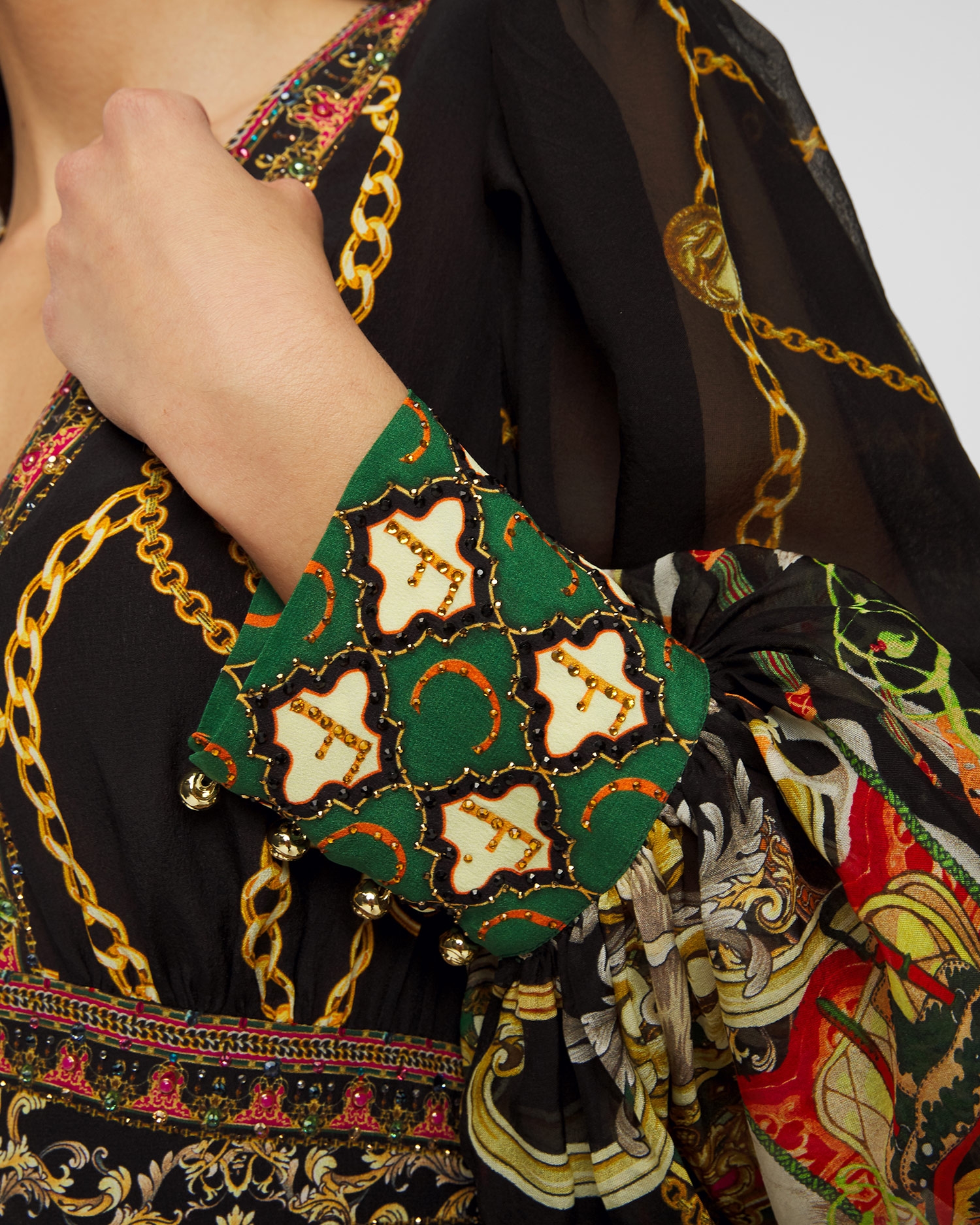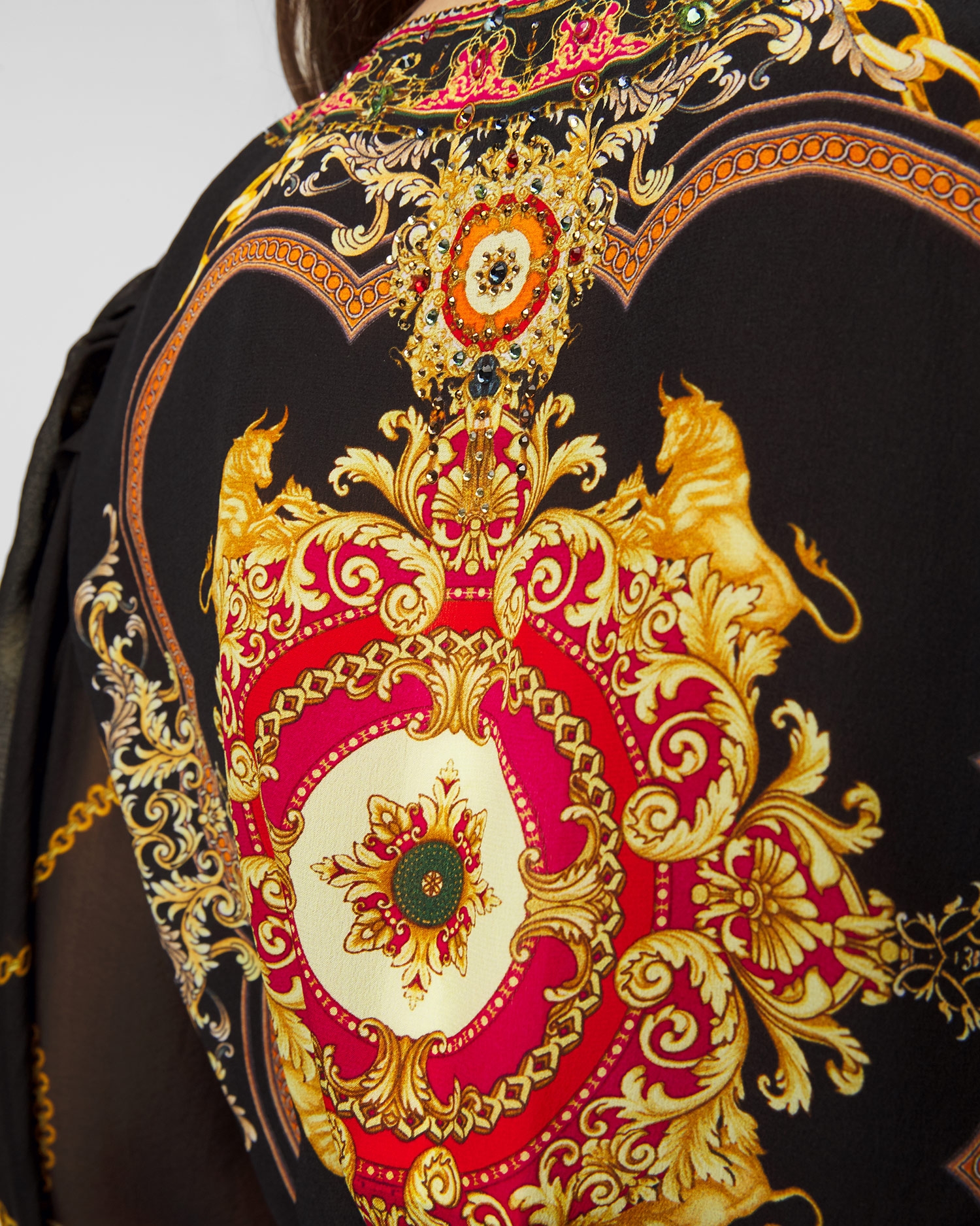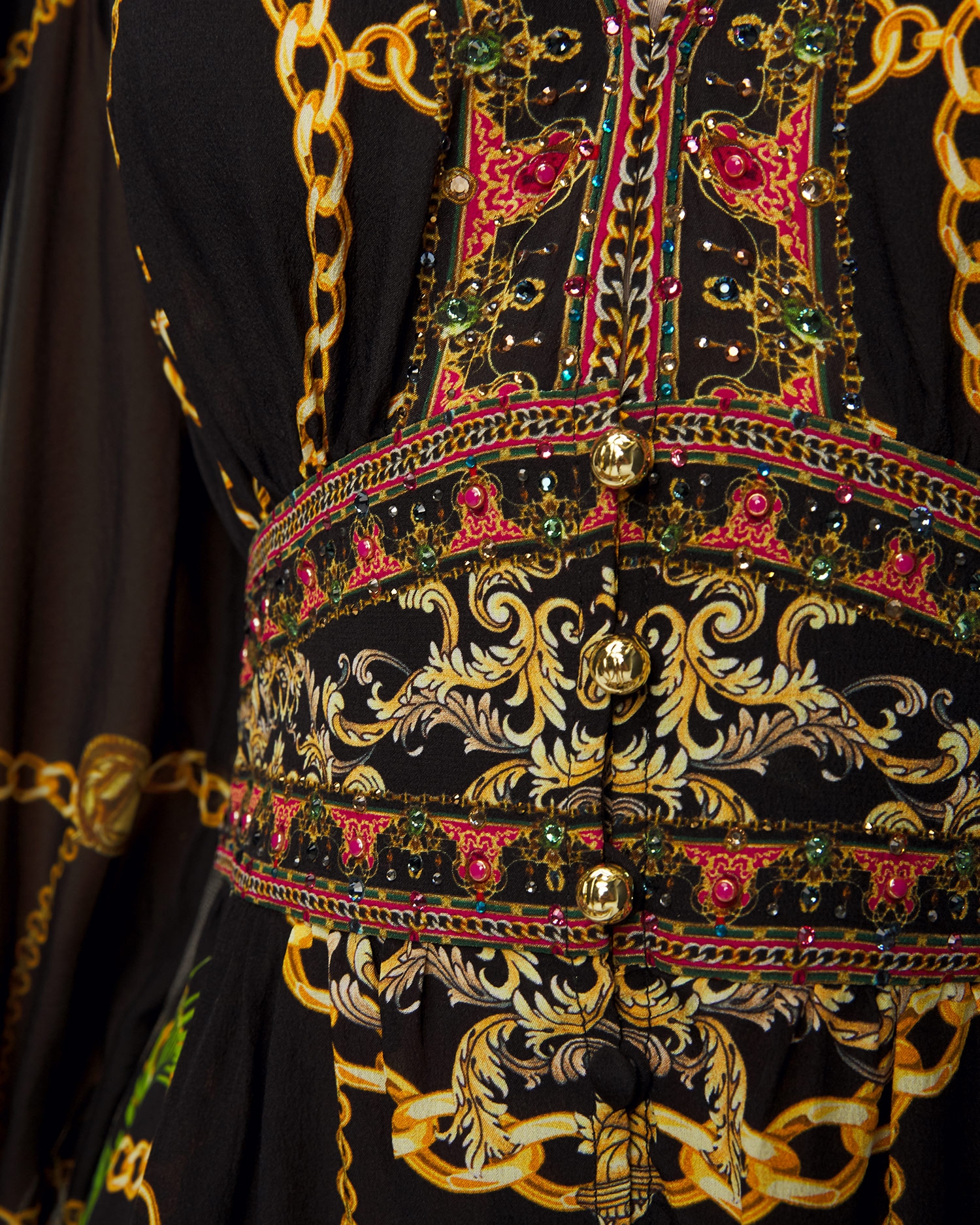 Camilla Button Front Frill Silk Dress. Original design with architectural motifs and mosaic elements. Decorated with leaves, flamenco lace, golden flowers that resemble the royal Palacio of the era, where passion meets power, and puts sensuality as the highest currency. Gilded royal coats of arms and equestrian motifs, intertwined with a mesh of gold chains and vibrant emerald green leaves.