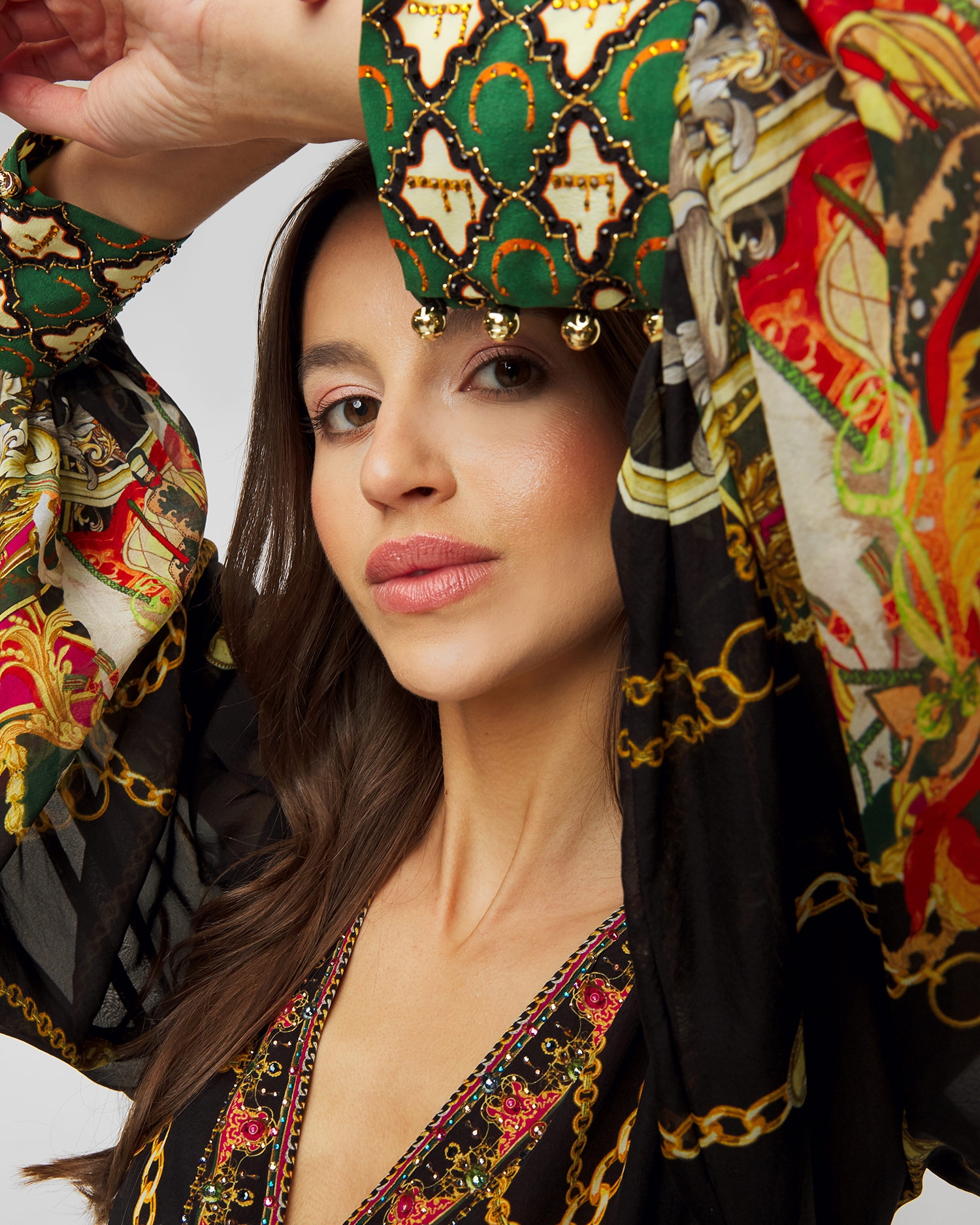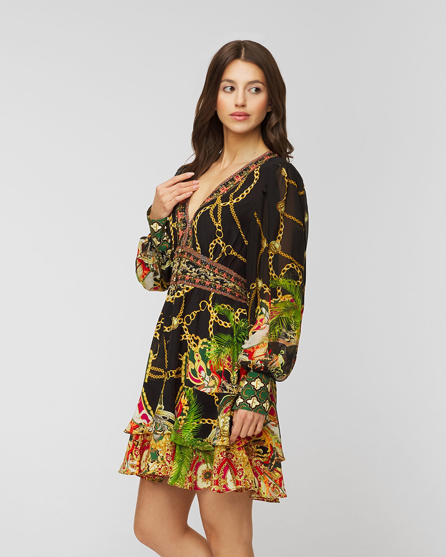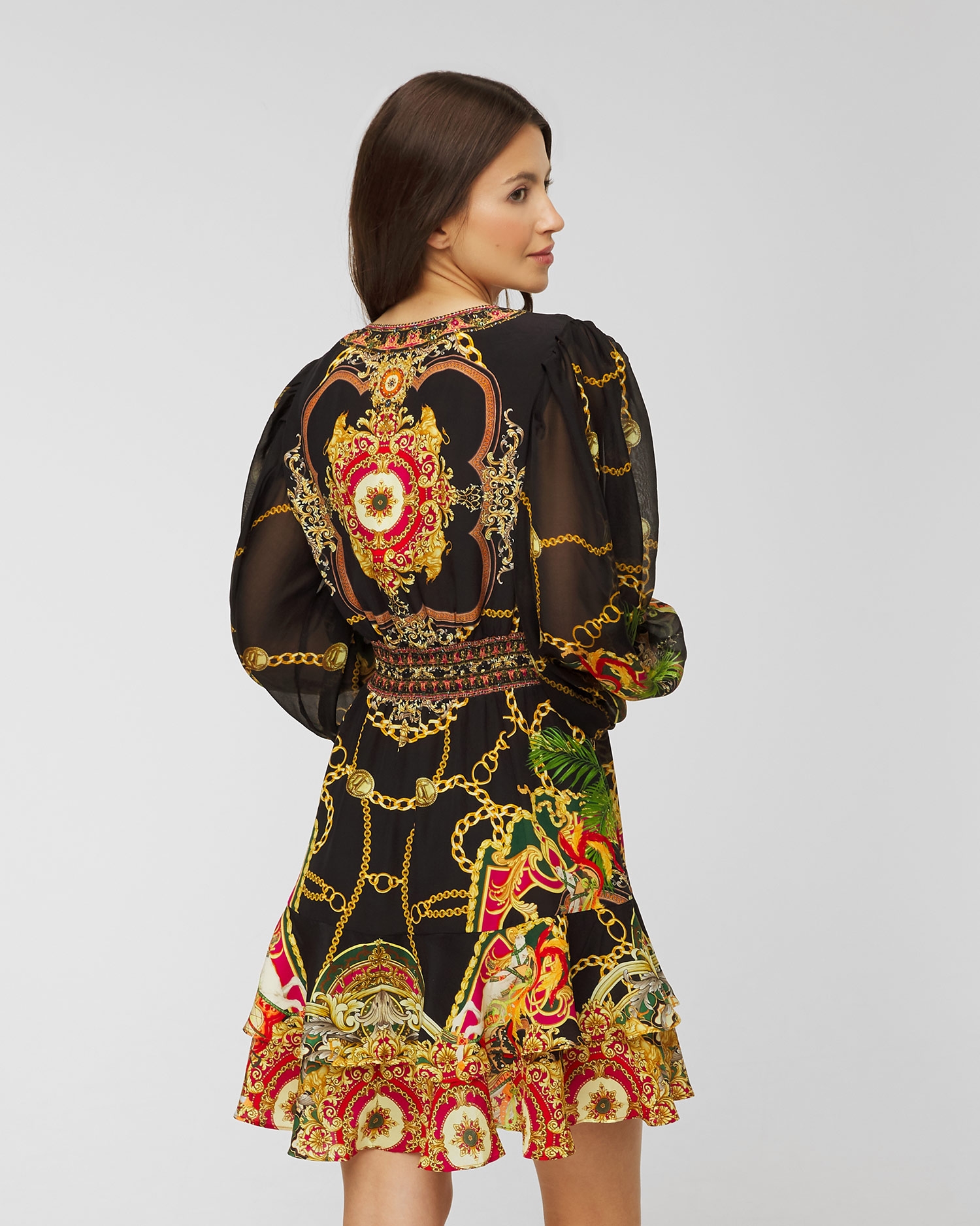 Camilla Button Front Frill Silk Dress. Original design with architectural motifs and mosaic elements. Decorated with leaves, flamenco lace, golden flowers that resemble the royal Palacio of the era, where passion meets power, and puts sensuality as the highest currency. Gilded royal coats of arms and equestrian motifs, intertwined with a mesh of gold chains and vibrant emerald green leaves.