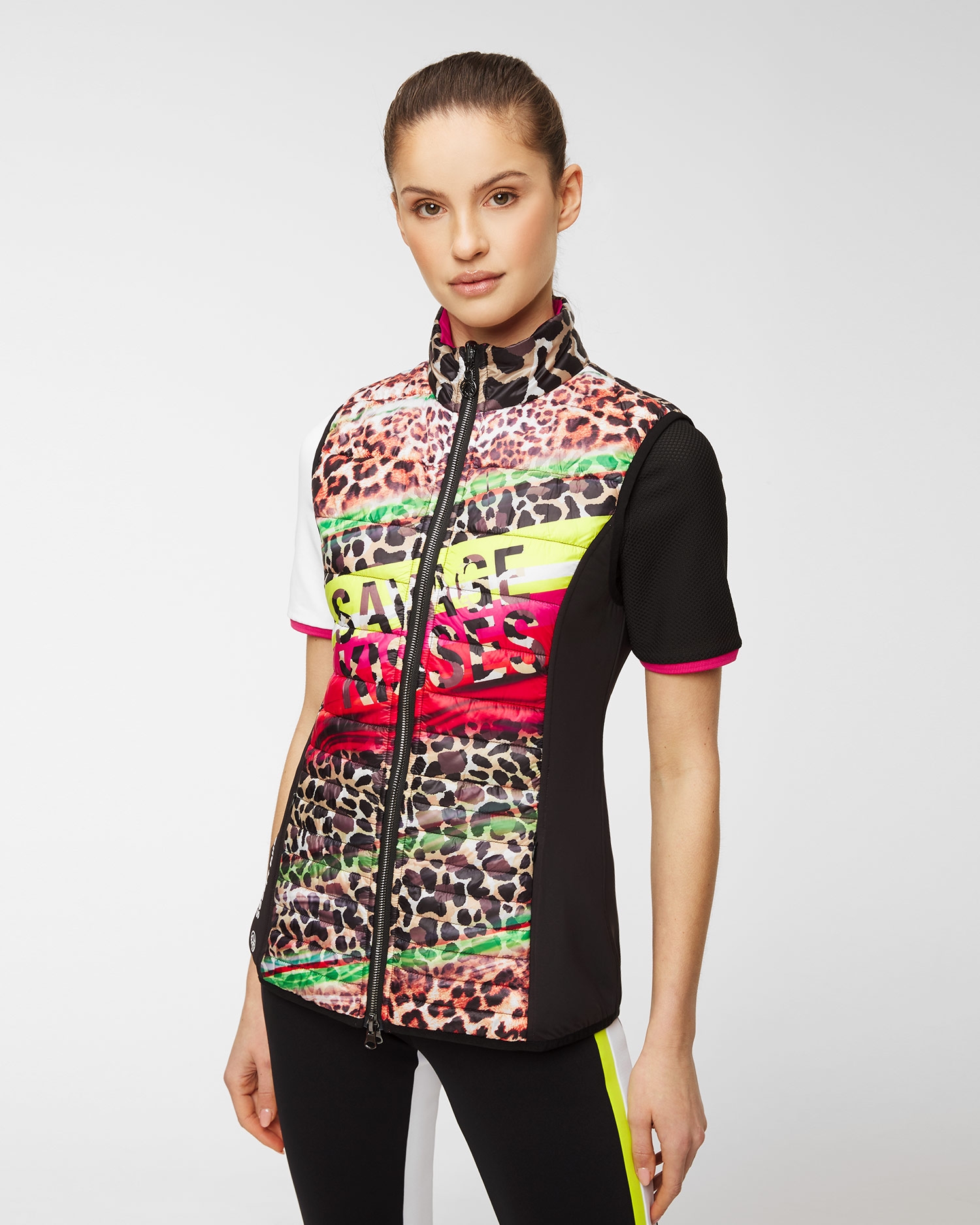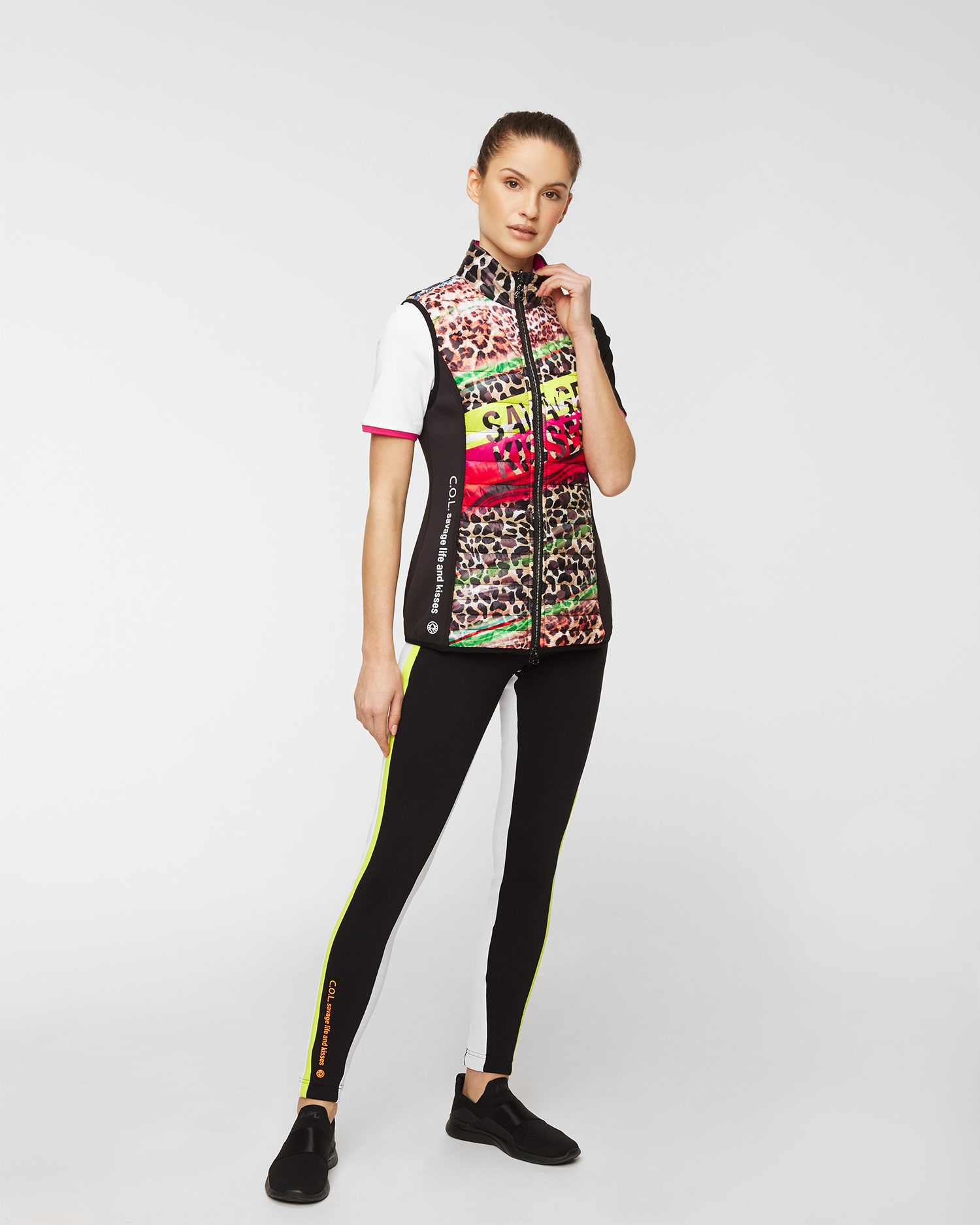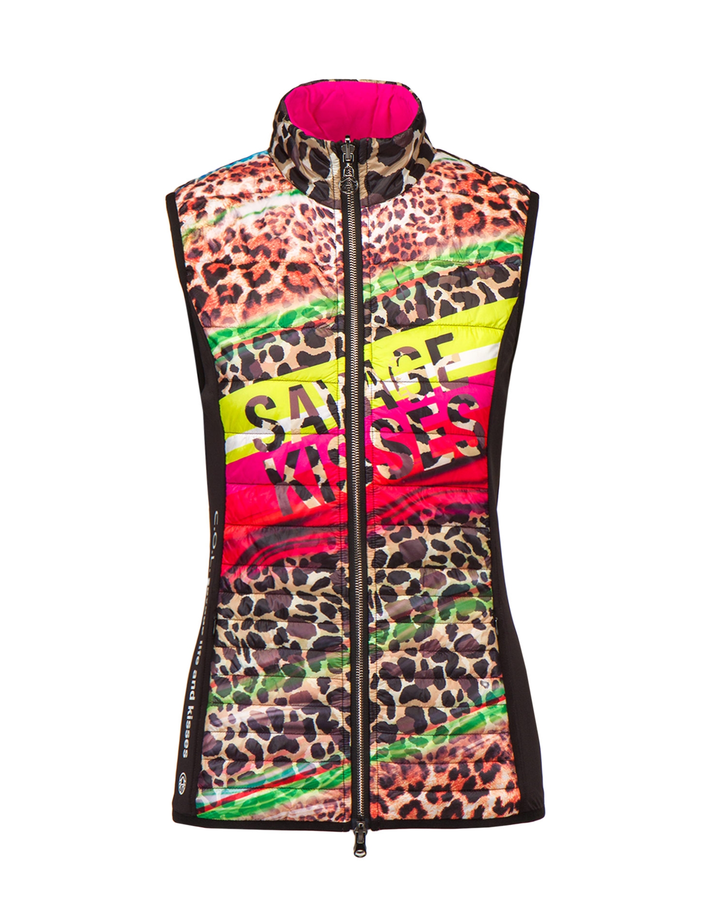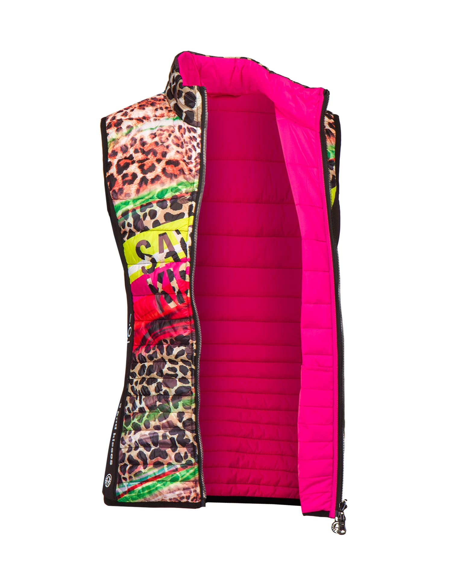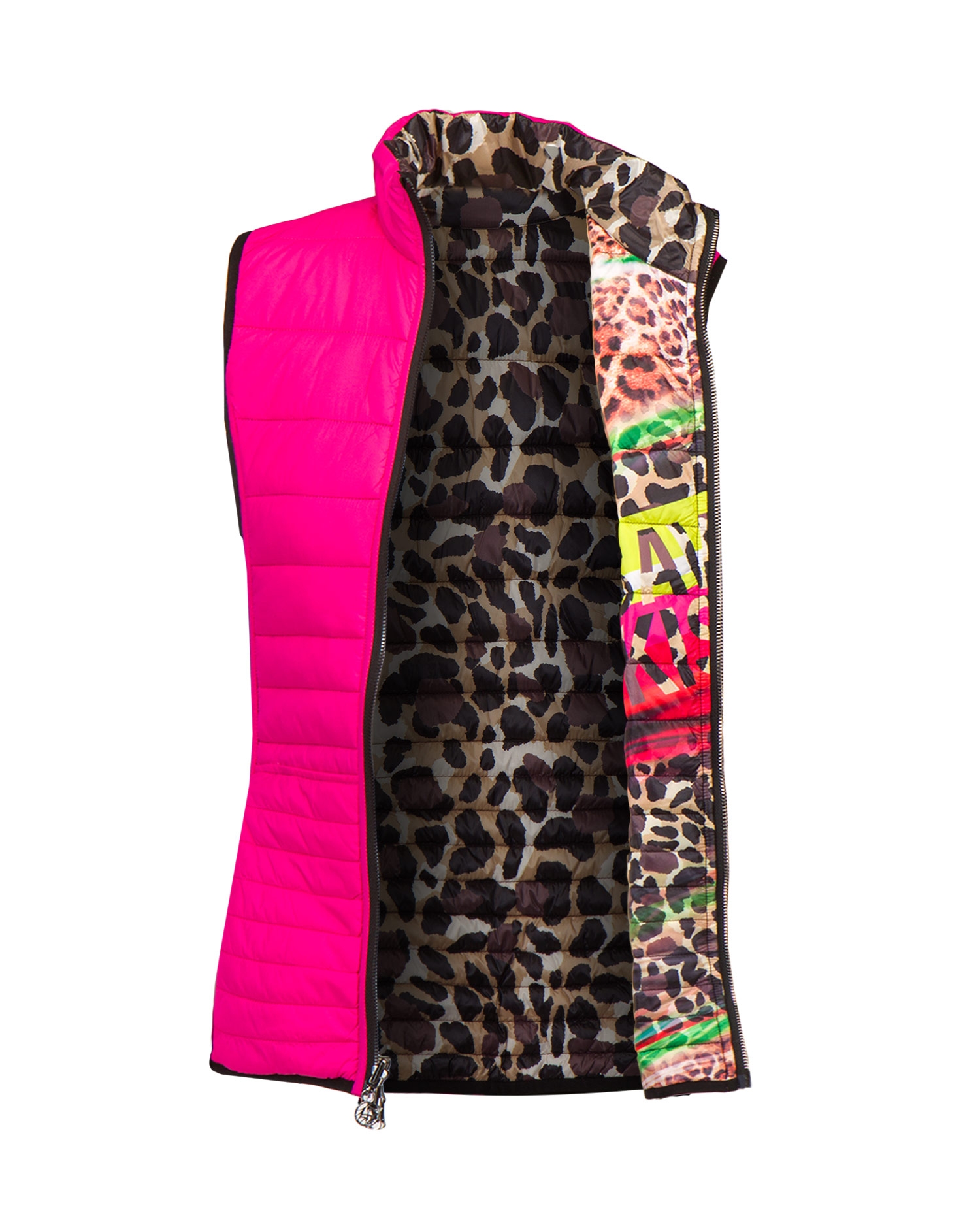 SPORTALM Alane reversible gilet from Savage Jungle Course collection. Power stretch panels for comfort and slimmer silhuette. Fuchsia side with orange prints. The other side is decorated with an animal print and rainbow elements. Functional two way zip closure on the front. Sleeves finished with elastic edging. Two side pockets with hidden zip closures.