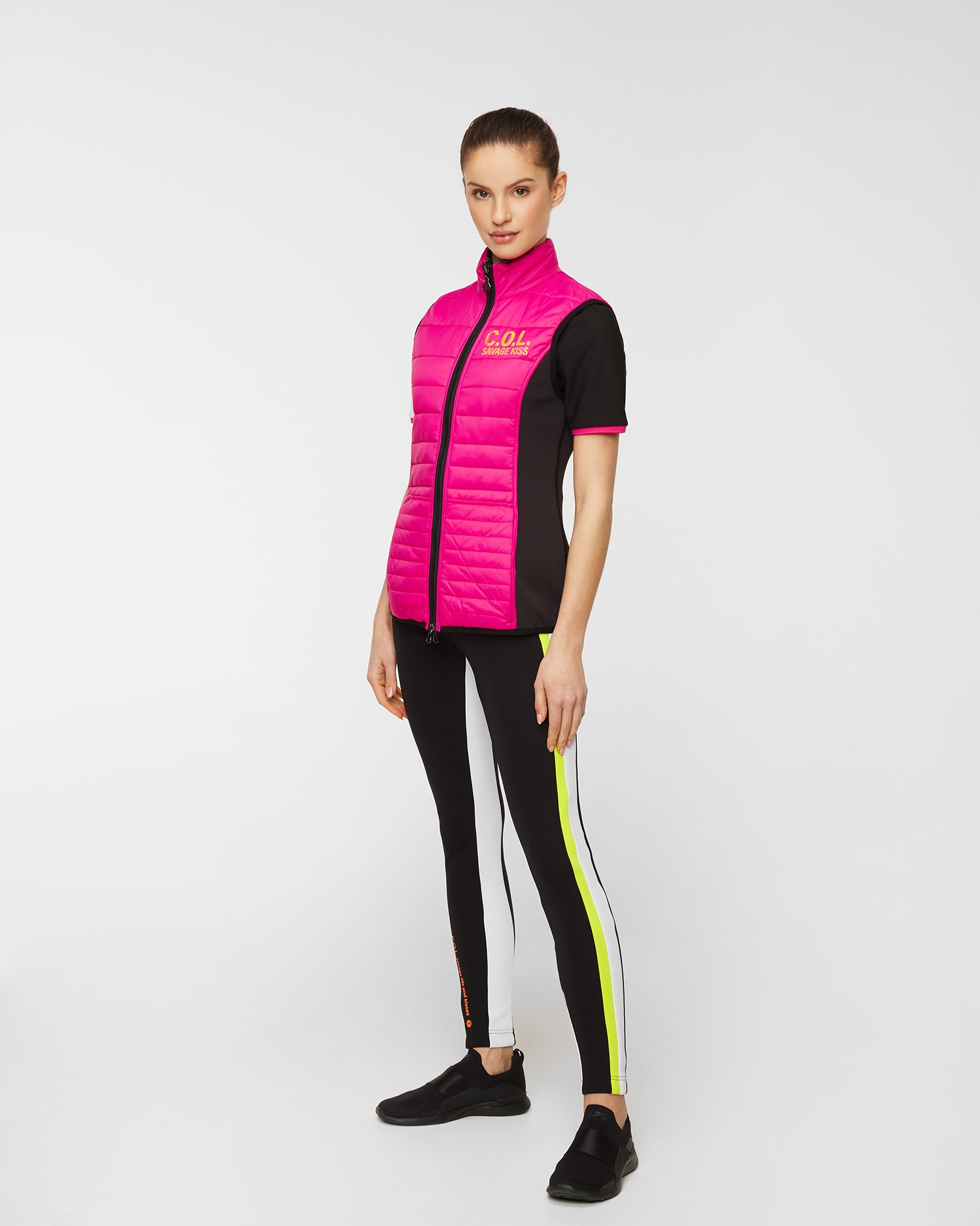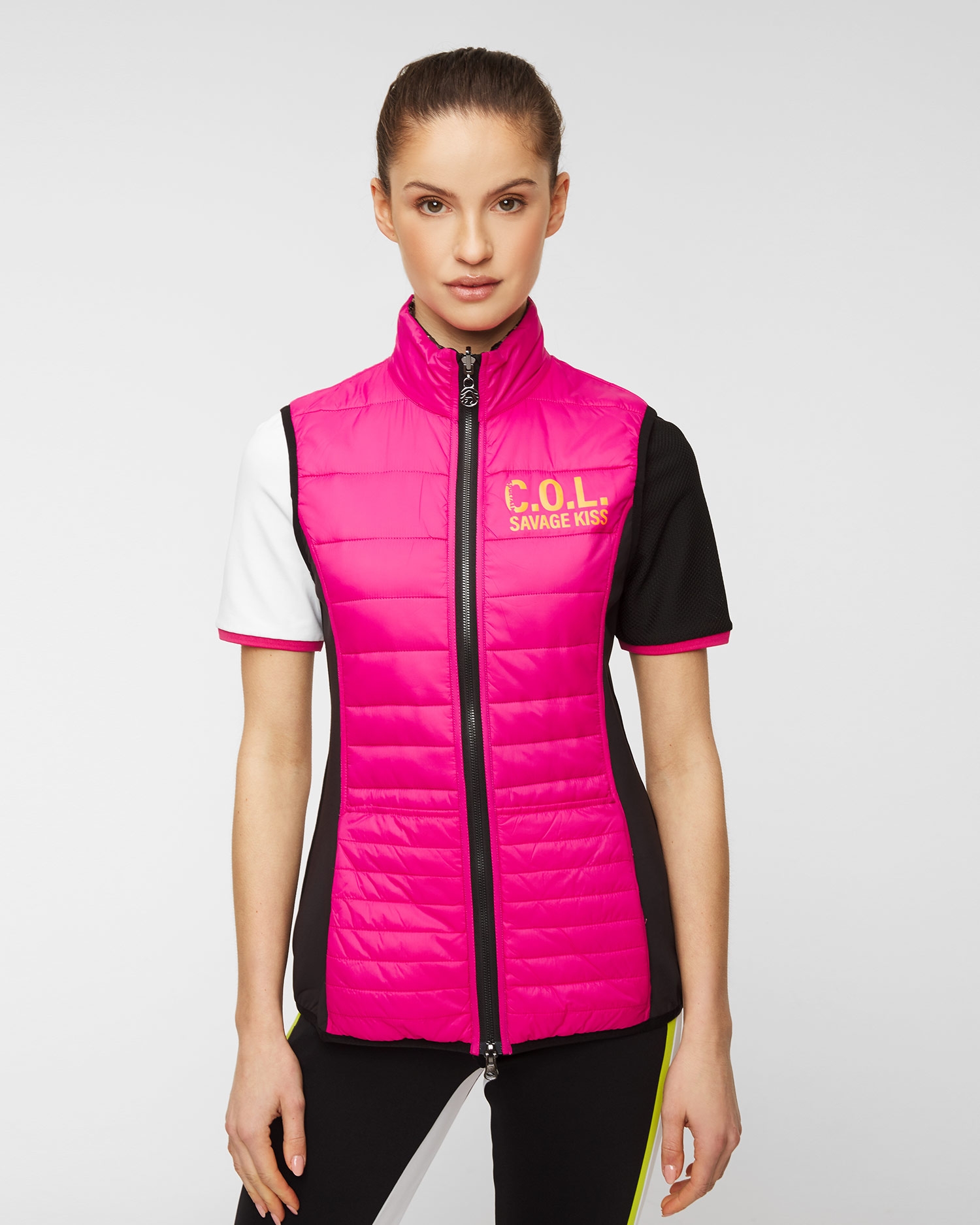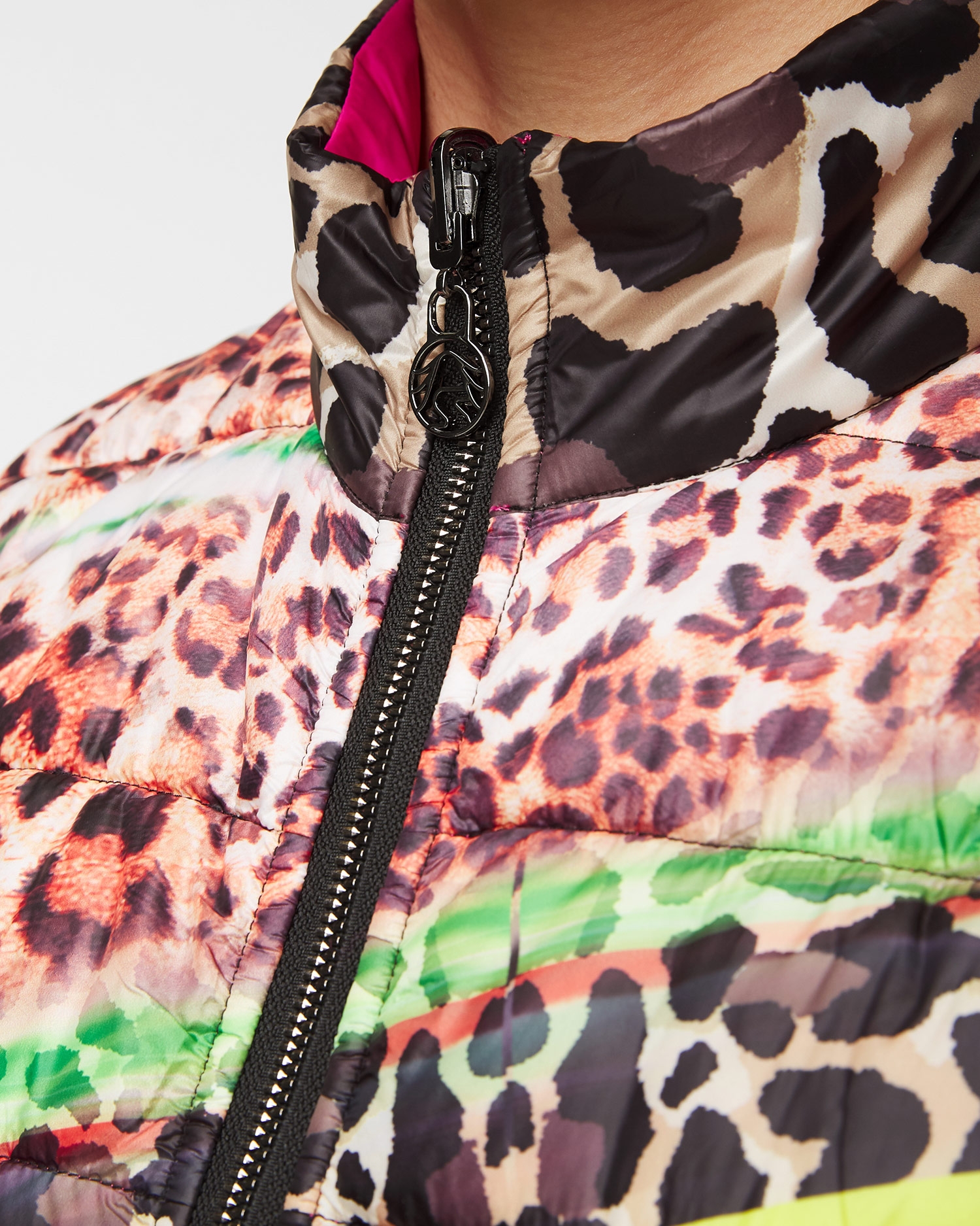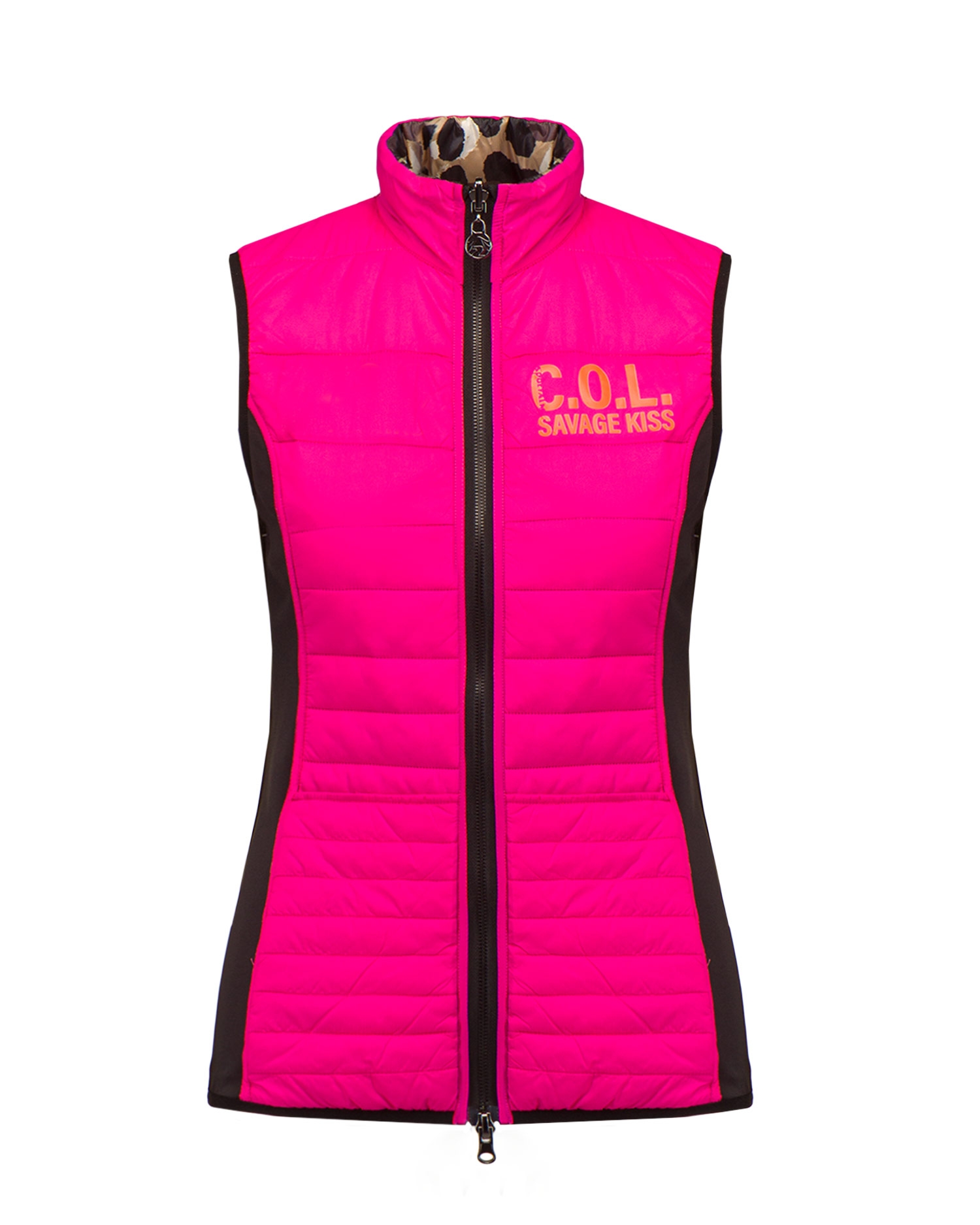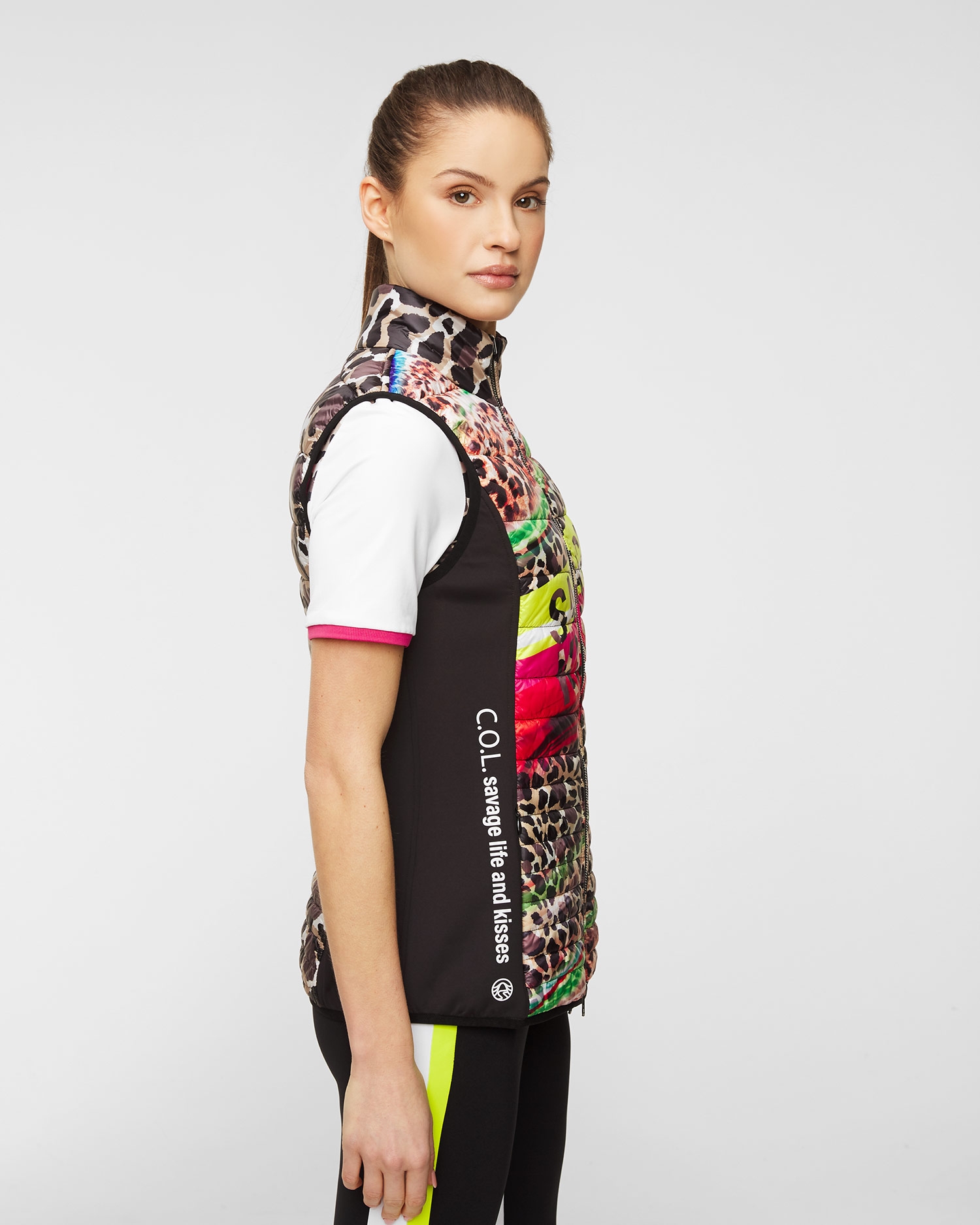 SPORTALM Alane reversible gilet from Savage Jungle Course collection. Power stretch panels for comfort and slimmer silhuette. Fuchsia side with orange prints. The other side is decorated with an animal print and rainbow elements. Functional two way zip closure on the front. Sleeves finished with elastic edging. Two side pockets with hidden zip closures.