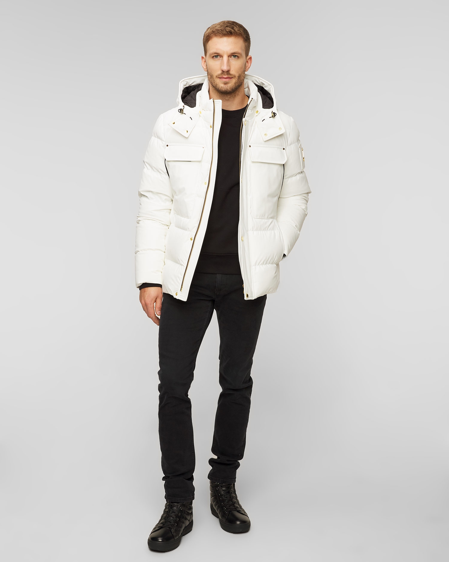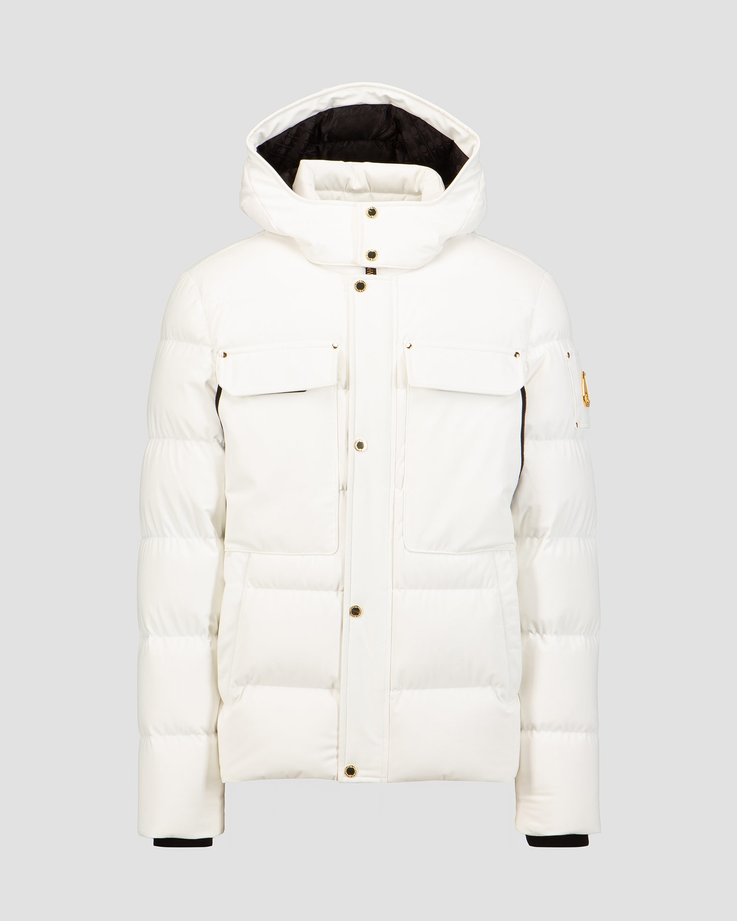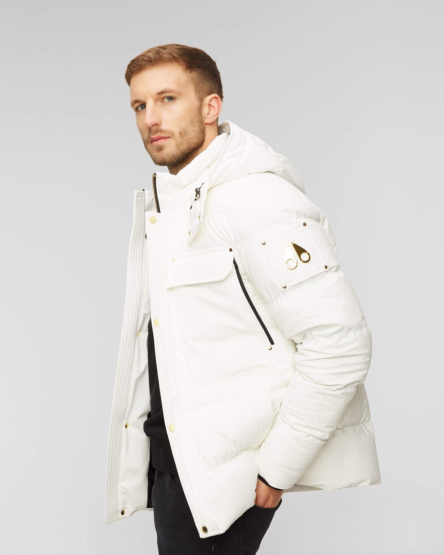 The white Moose Knuckles Skillman Jacket for men is a modern take on the Moose Knuckles Skillman Jacket, designed to provide ultimate comfort on cold winter days. It's made from a durable, waterproof Nyluxe fabric which, together with a filling made from a blend of natural goose down and feathers, will provide maximum protection from adverse weather conditions. The tailored fit construction ensures that the jacket sits snugly and comfortably on the body, working perfectly with every movement. The practical character of the model is emphasised by the numerous pockets - two patch pockets on the chest, two waist pockets and two internal zip pockets. The long sleeves are finished with an internal drawstring for extra protection against the cold. The jacket fastens at the front with a two-way zip. Features a detachable hood with individual adjustment via drawstrings. Decorated with a minimalist accent in the form of a metal logo sewn on the left sleeve.