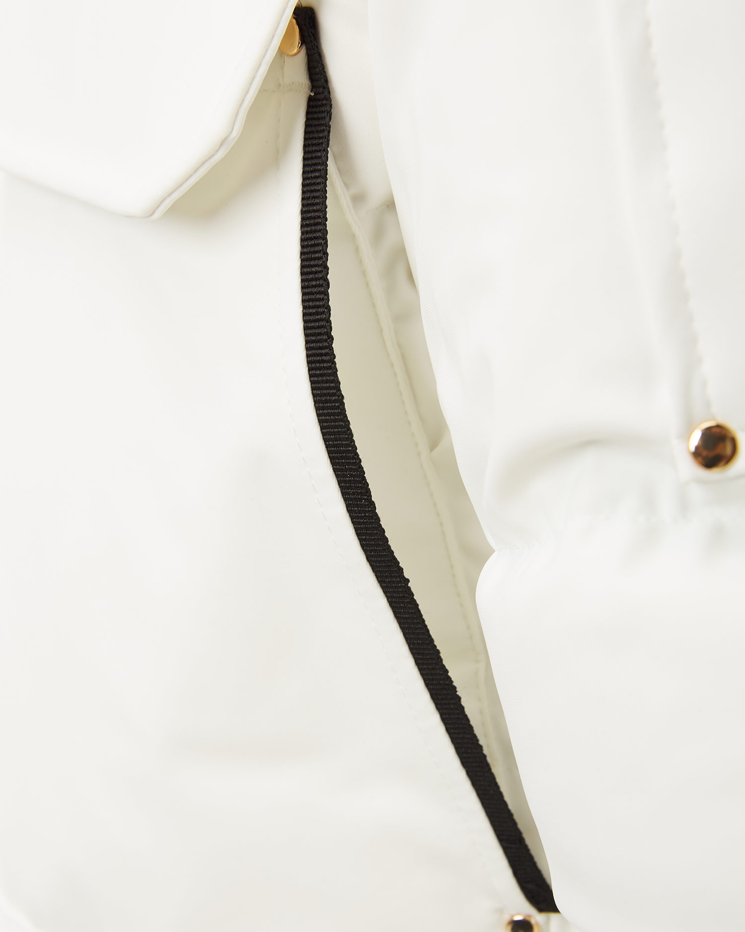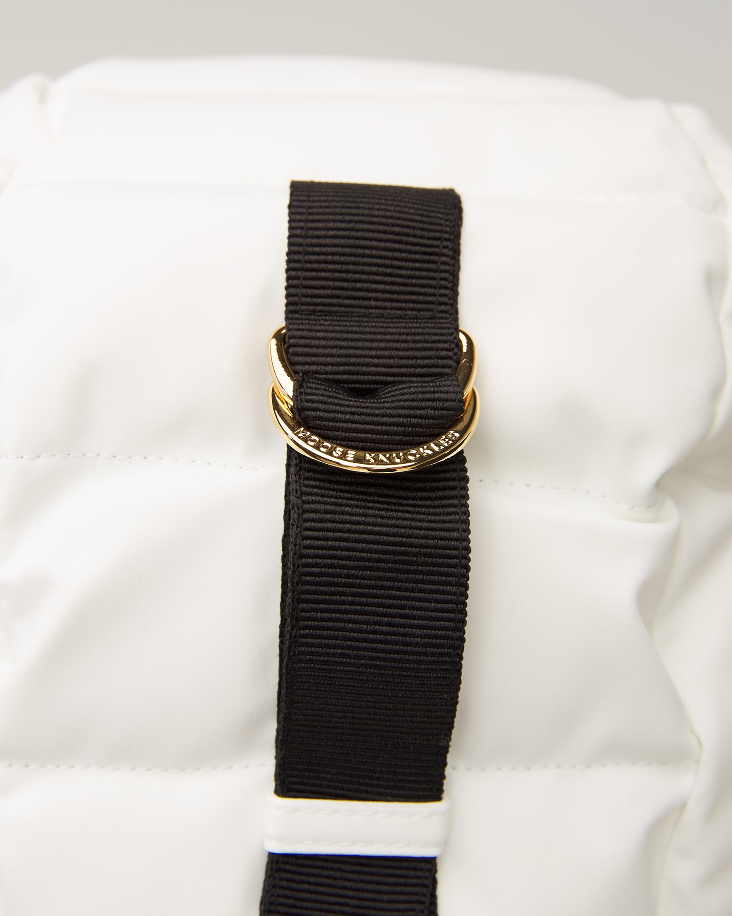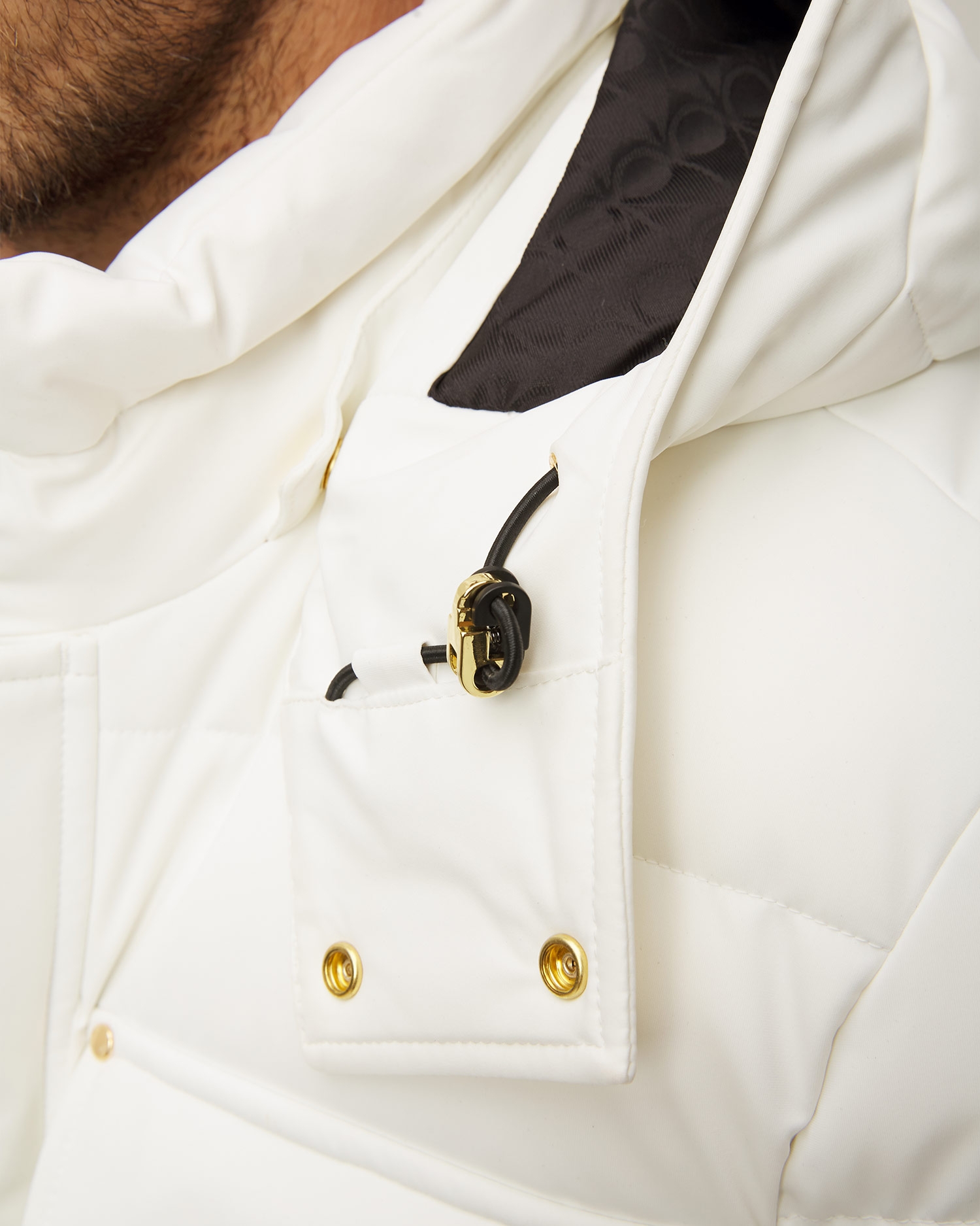 The white Moose Knuckles Skillman Jacket for men is a modern take on the Moose Knuckles Skillman Jacket, designed to provide ultimate comfort on cold winter days. It's made from a durable, waterproof Nyluxe fabric which, together with a filling made from a blend of natural goose down and feathers, will provide maximum protection from adverse weather conditions. The tailored fit construction ensures that the jacket sits snugly and comfortably on the body, working perfectly with every movement. The practical character of the model is emphasised by the numerous pockets - two patch pockets on the chest, two waist pockets and two internal zip pockets. The long sleeves are finished with an internal drawstring for extra protection against the cold. The jacket fastens at the front with a two-way zip. Features a detachable hood with individual adjustment via drawstrings. Decorated with a minimalist accent in the form of a metal logo sewn on the left sleeve.