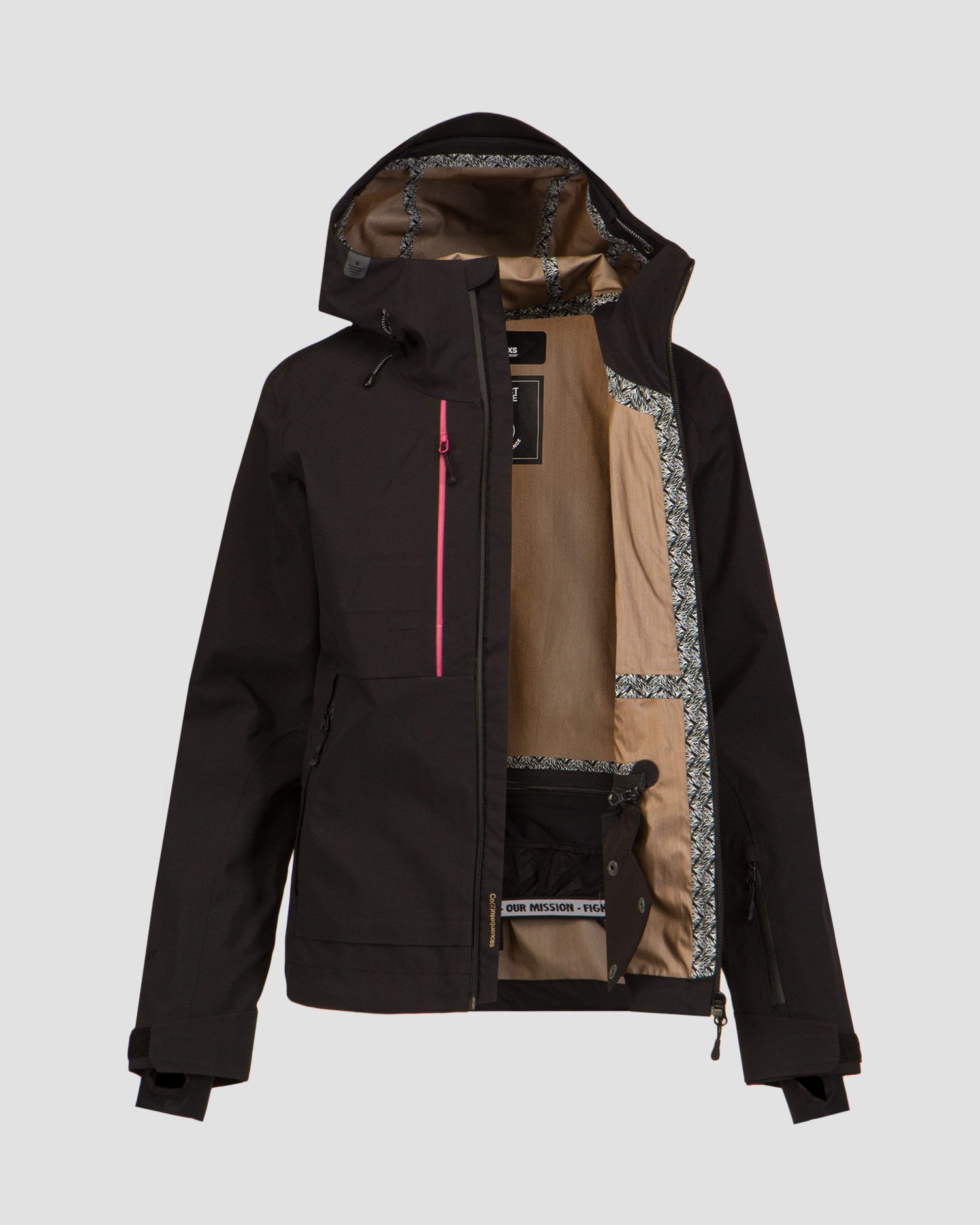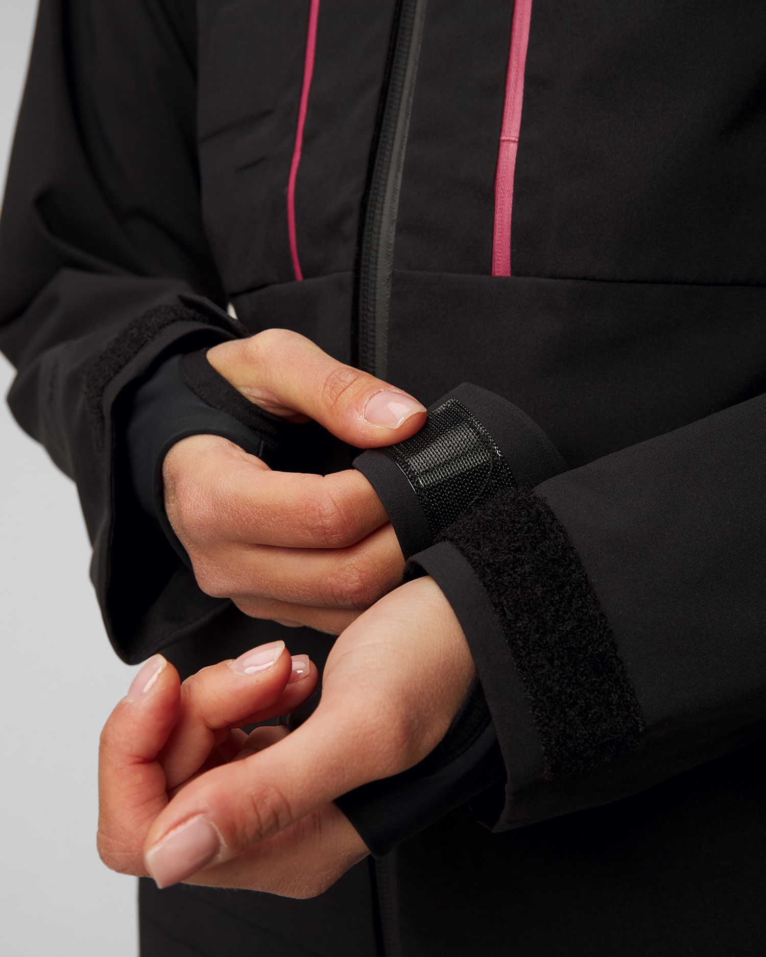 The jacket is closed all the way with a reliable waterproof YKK® zip. The jacket also has two hand pockets, two chest pockets and a small sleeve pocket for a ski pass, all fastened with a waterproof zip. One chest pocket also contains a wipe for cleaning goggles.