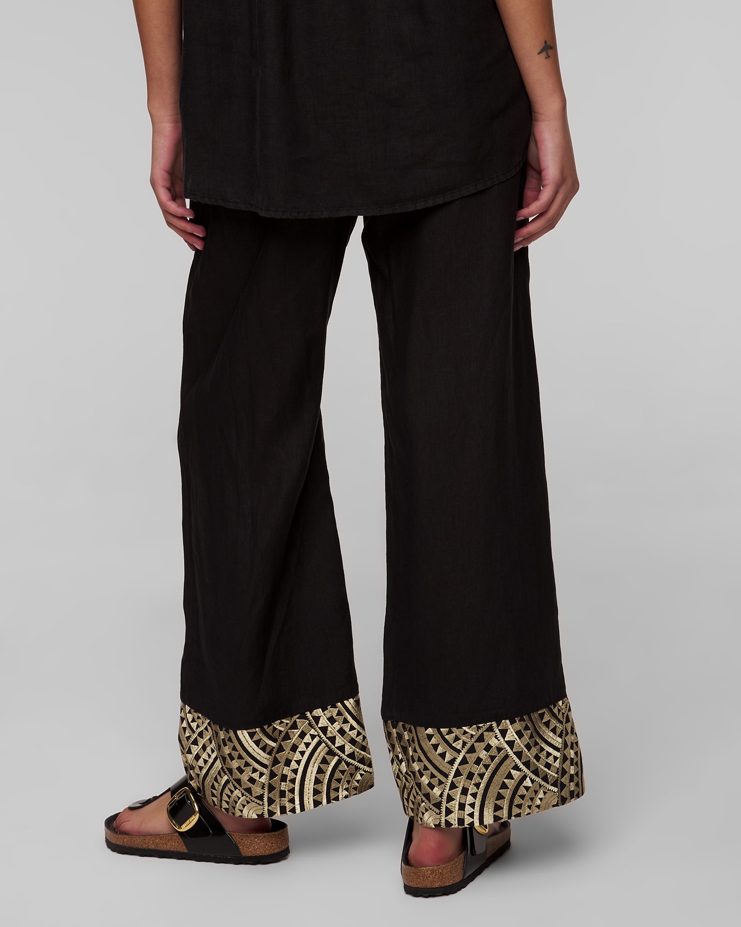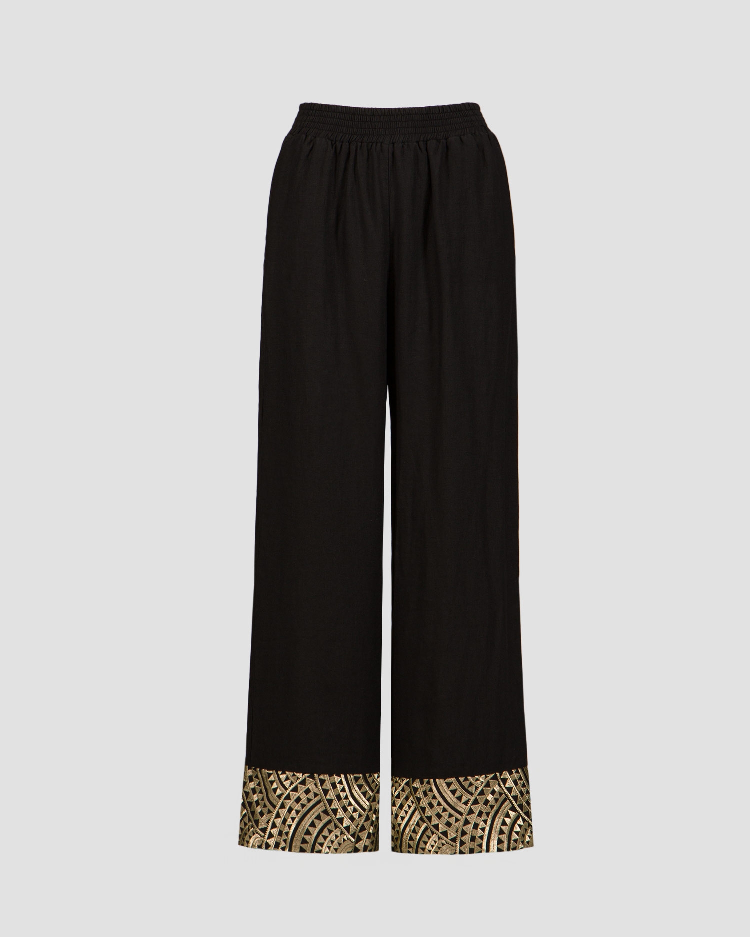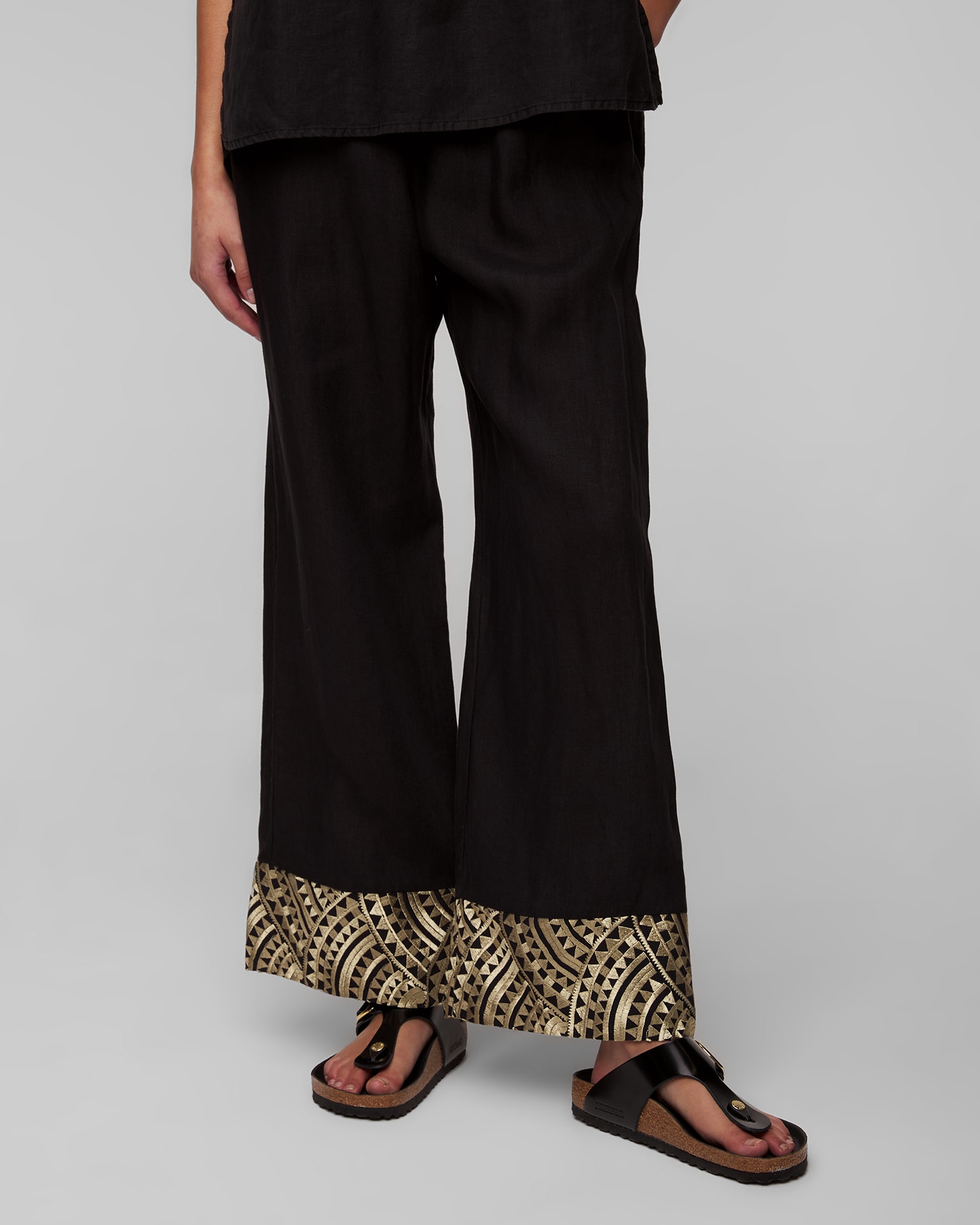 The grey Kori women's linen trousers are a proposal with which you will create a unique summer styling. They are distinguished by their original construction with a casual cut with wide legs and their unique finishing, which creates a hand-embroidered design. The trousers are made from an extremely light and airy linen fabric. Thanks to its natural breathability and moisture-absorbing properties, the fabric will ensure comfort on hot days. The high waist with an elasticated waistband will ensure that the trousers fit properly to the silhouette while ensuring comfort.