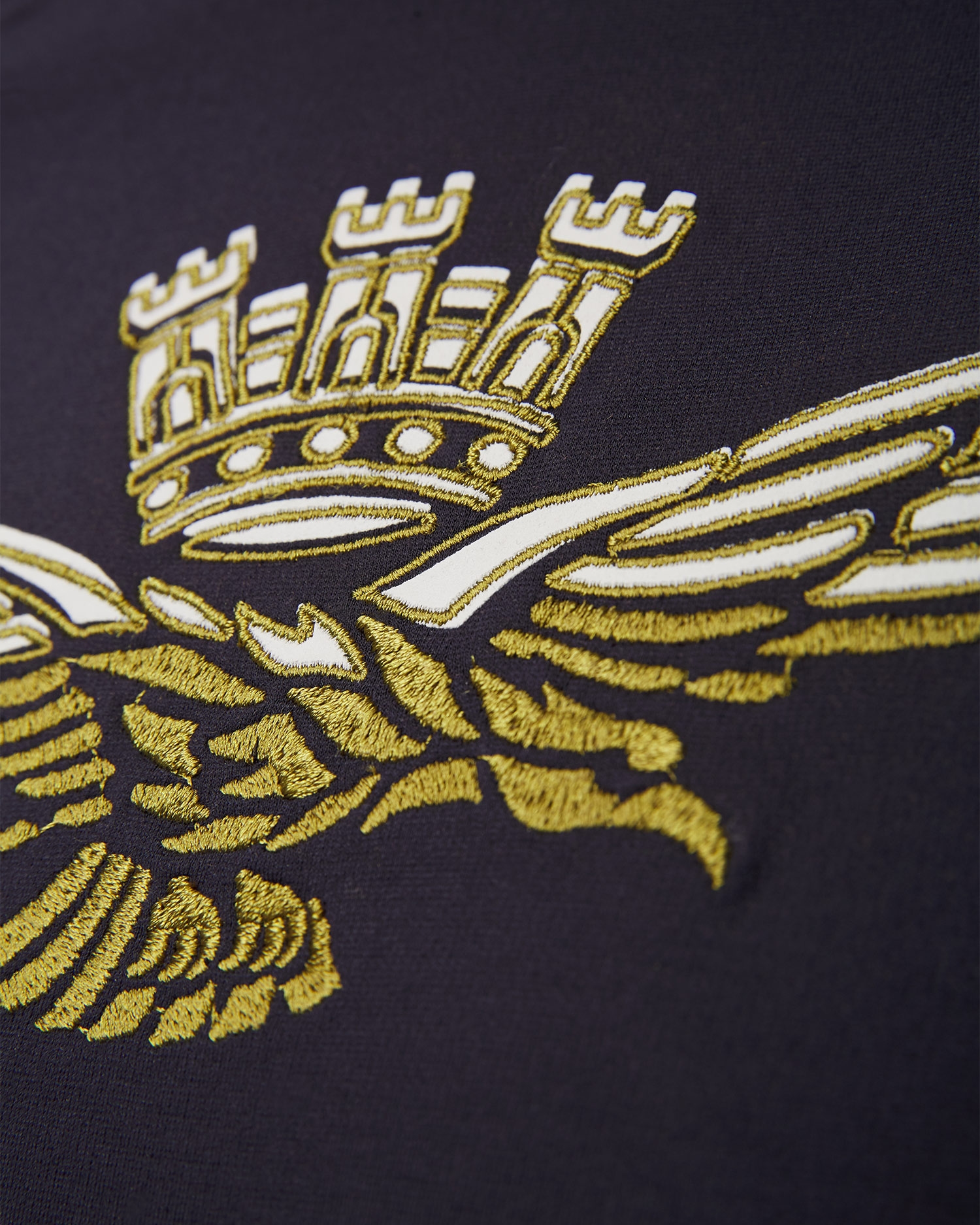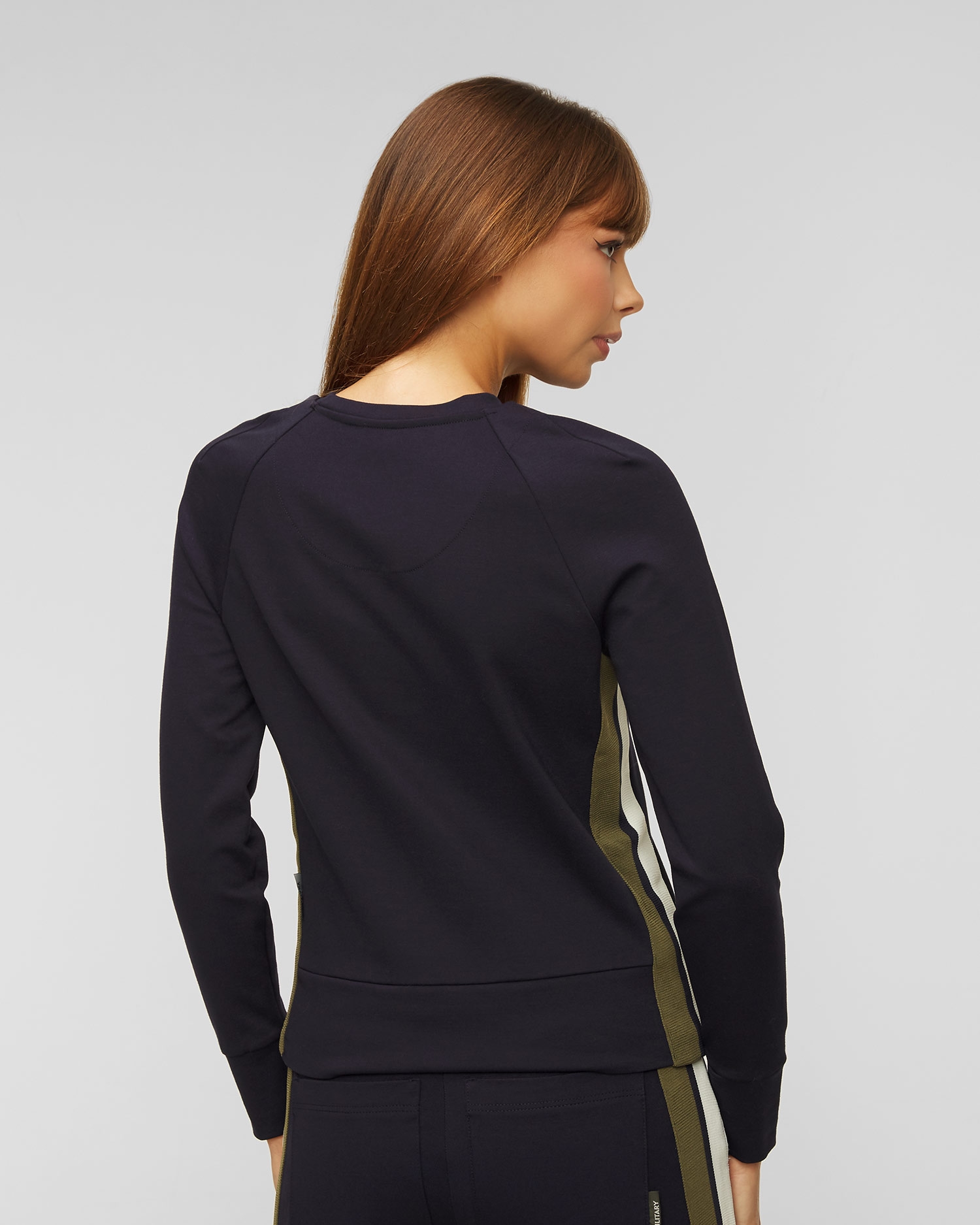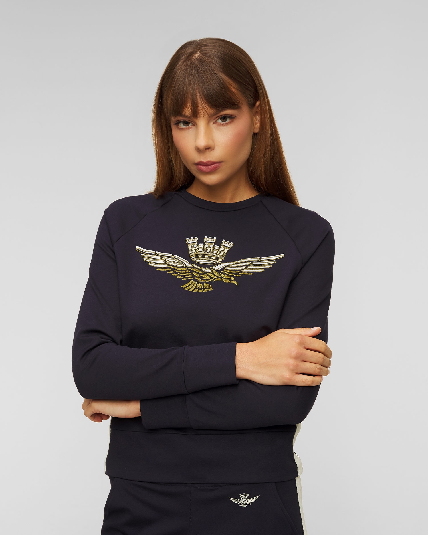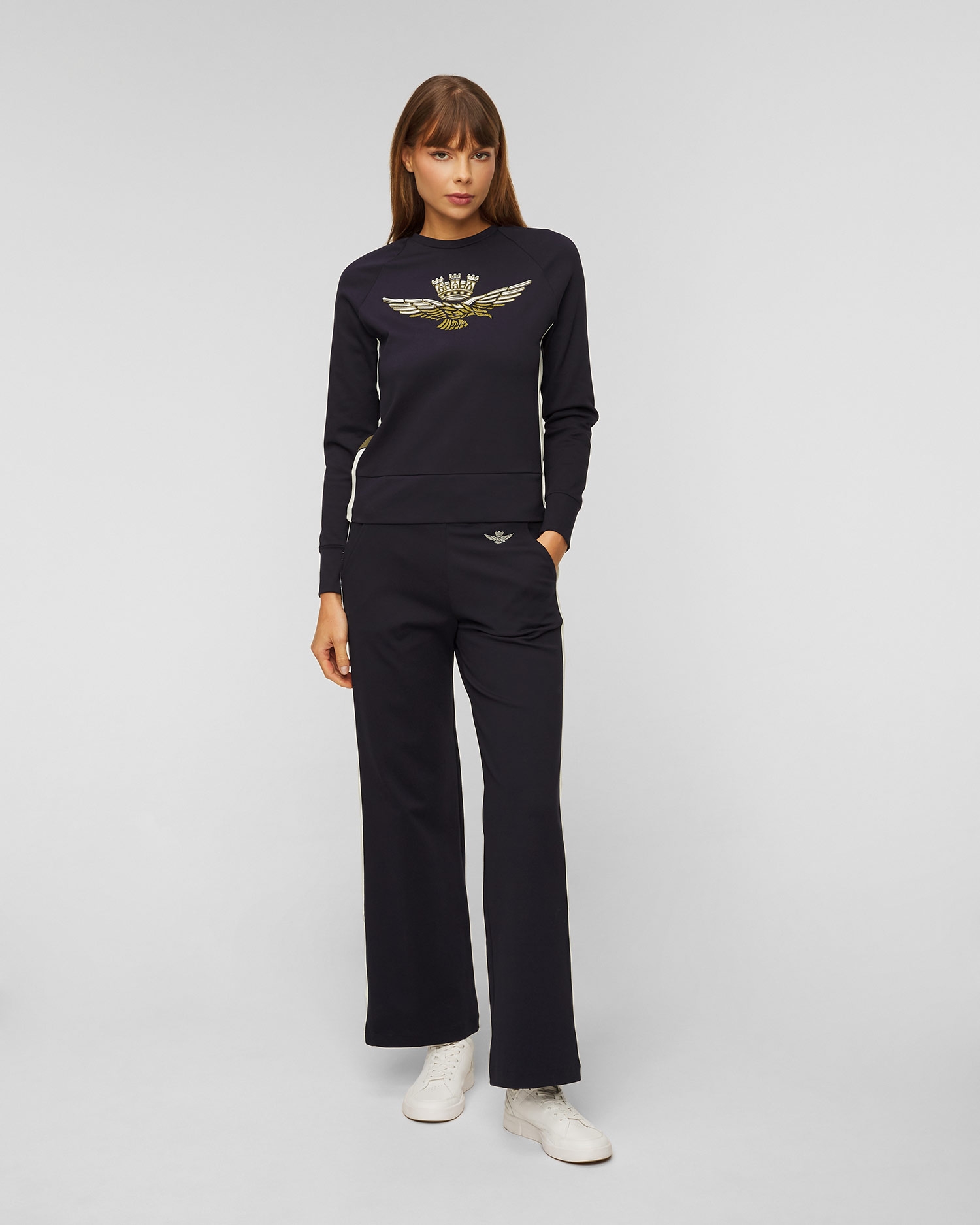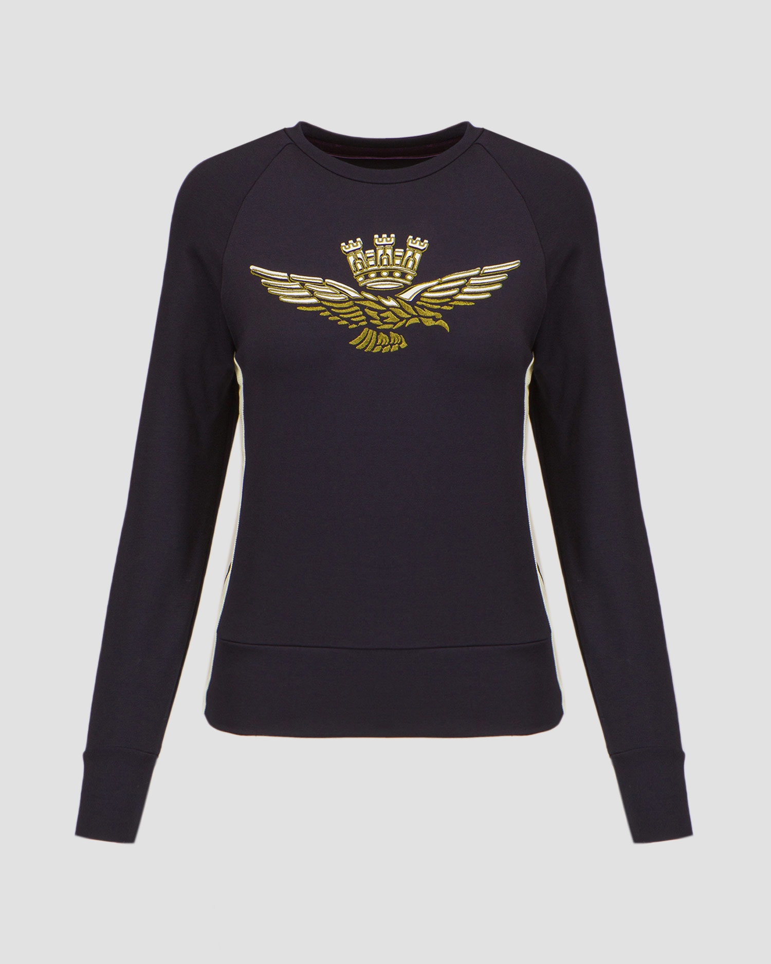 The Aeronautica Militare women's sweatshirt will be perfect as part of a casual outfit. It's made from a stretchy viscose fabric that will keep you comfortable during your favourite activities, thanks to its natural breathability and moisture-absorbing properties. The close-fitting cut and ribbed trims at the hem and cuffs ensure a perfect fit while providing comfort and complete freedom of movement. Blouse with round neckline. Decorated with an embroidered appliqué in the shape of the brand's logo on the front and contrasting inserts on the sides, which emphasise its sporty character.