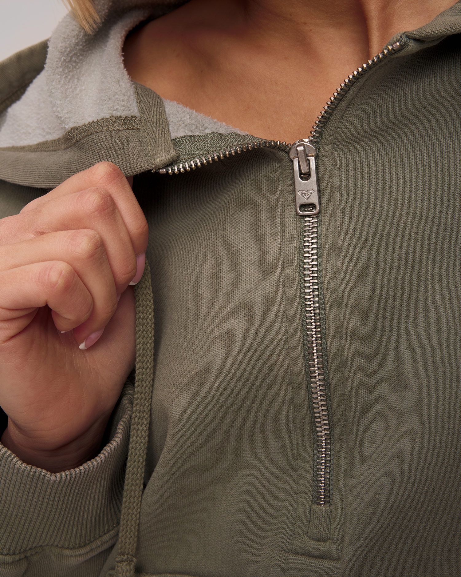 Roxy women's sweatshirt is a comfortable piece with a casual short cut that you'll love to wear after a surfing. Made of thick cotton yarn with a small addition of polyester, which provides durability and smoothness. Sort zip closure. The hood is adjustable with drawstrings. Sleeves finished with ribbings.