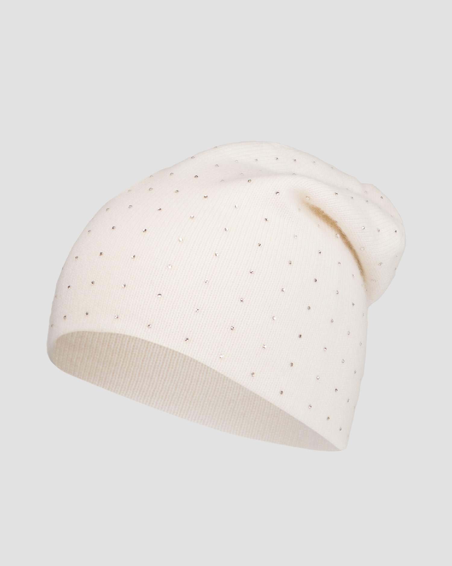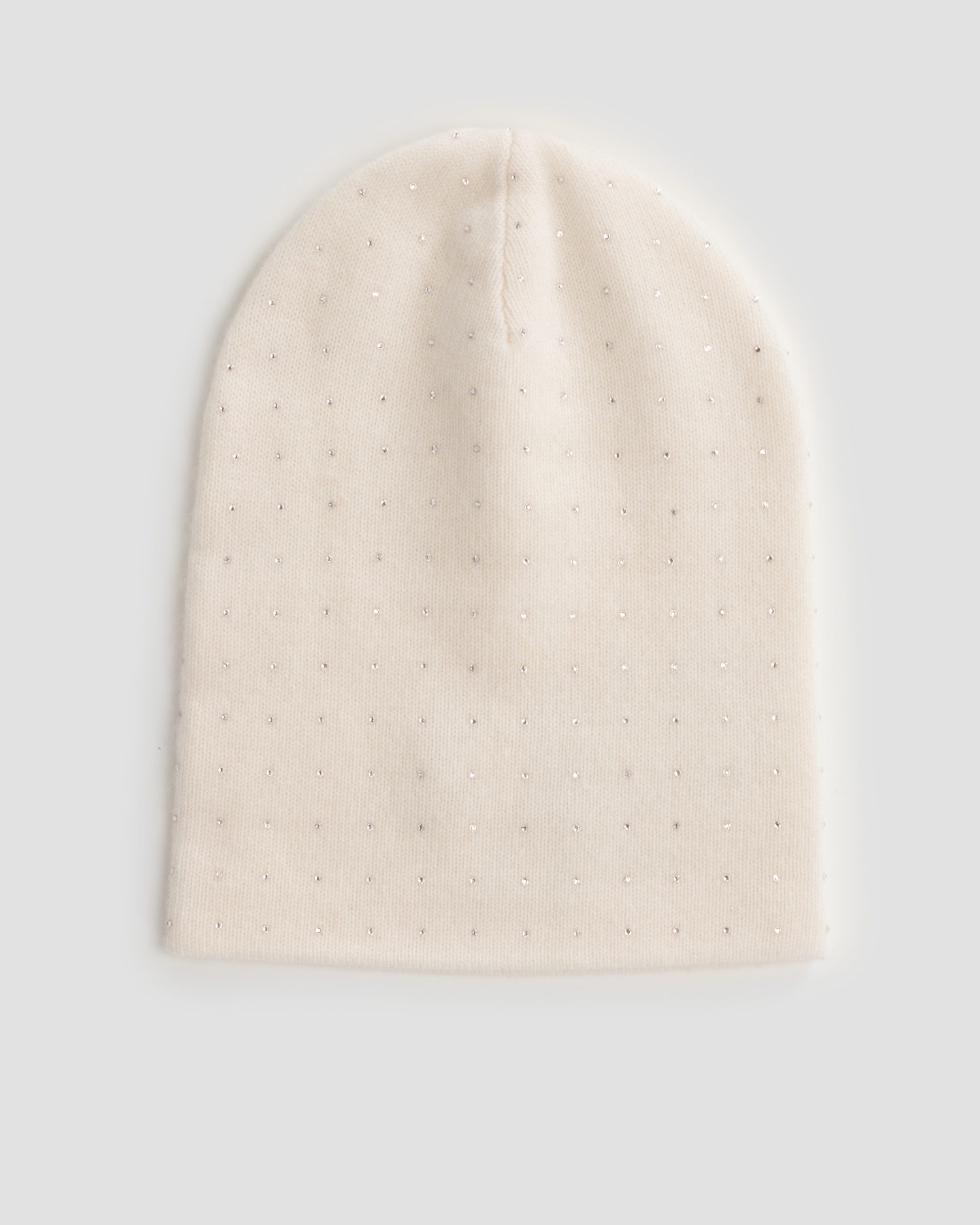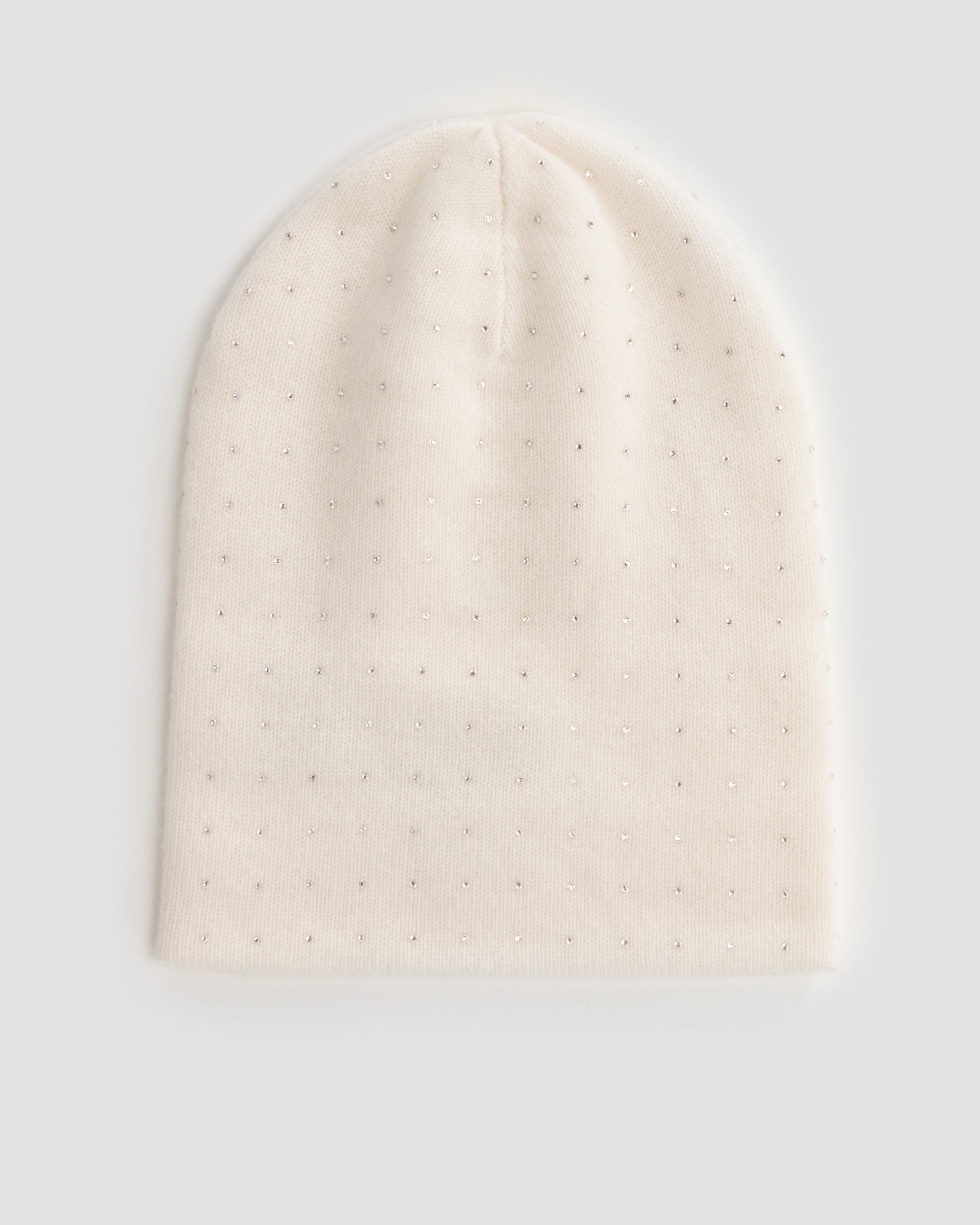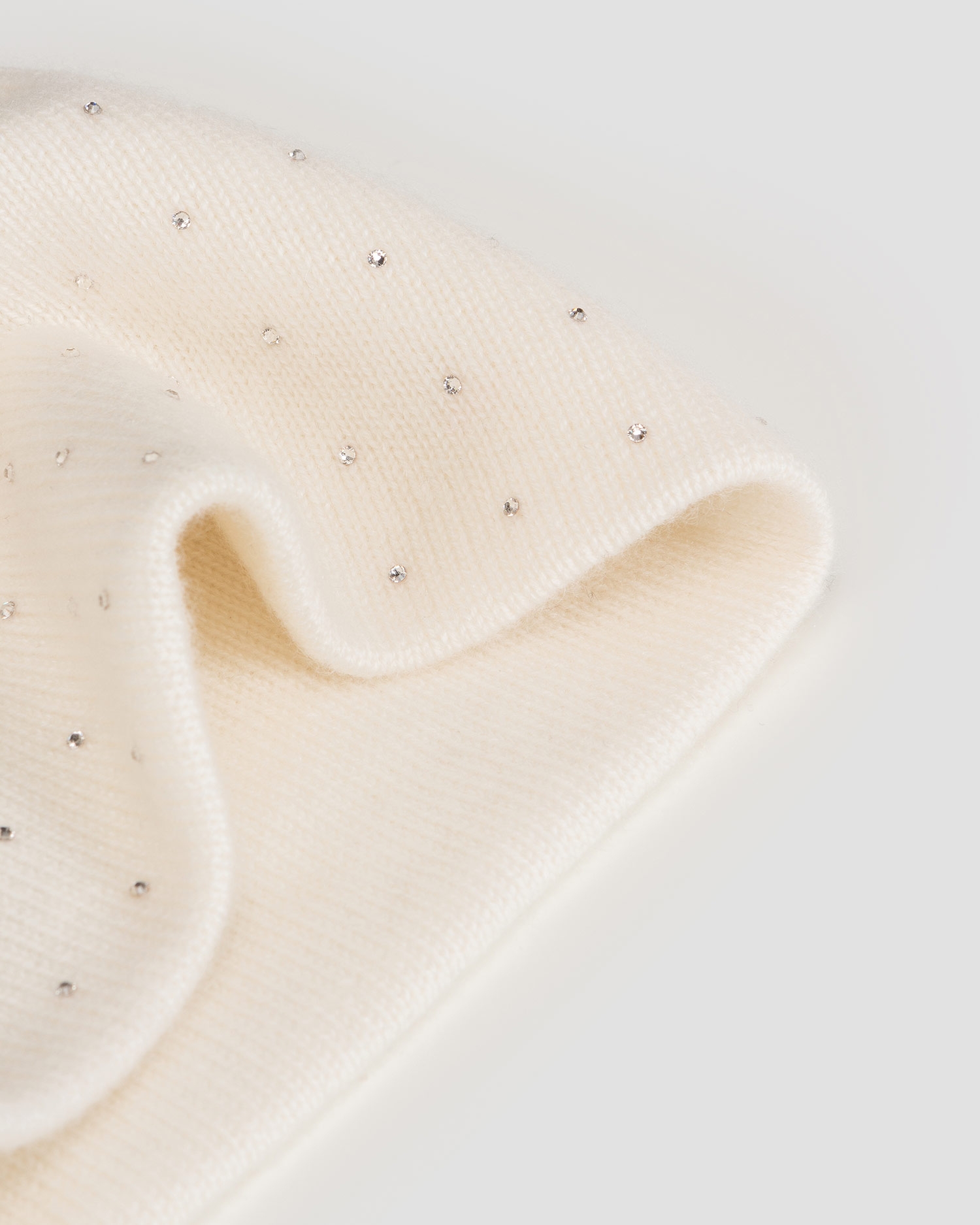 The white William Sharp women's cashmere beanie will complement everyday winter styling. It is made from extremely soft and fine cashmere with natural breathability and thermoregulation properties to keep you comfortable in cold temperatures. With a classic design, the cap is decorated with hand-sewn Swarovski crystals that add a luxurious touch to the proposal.