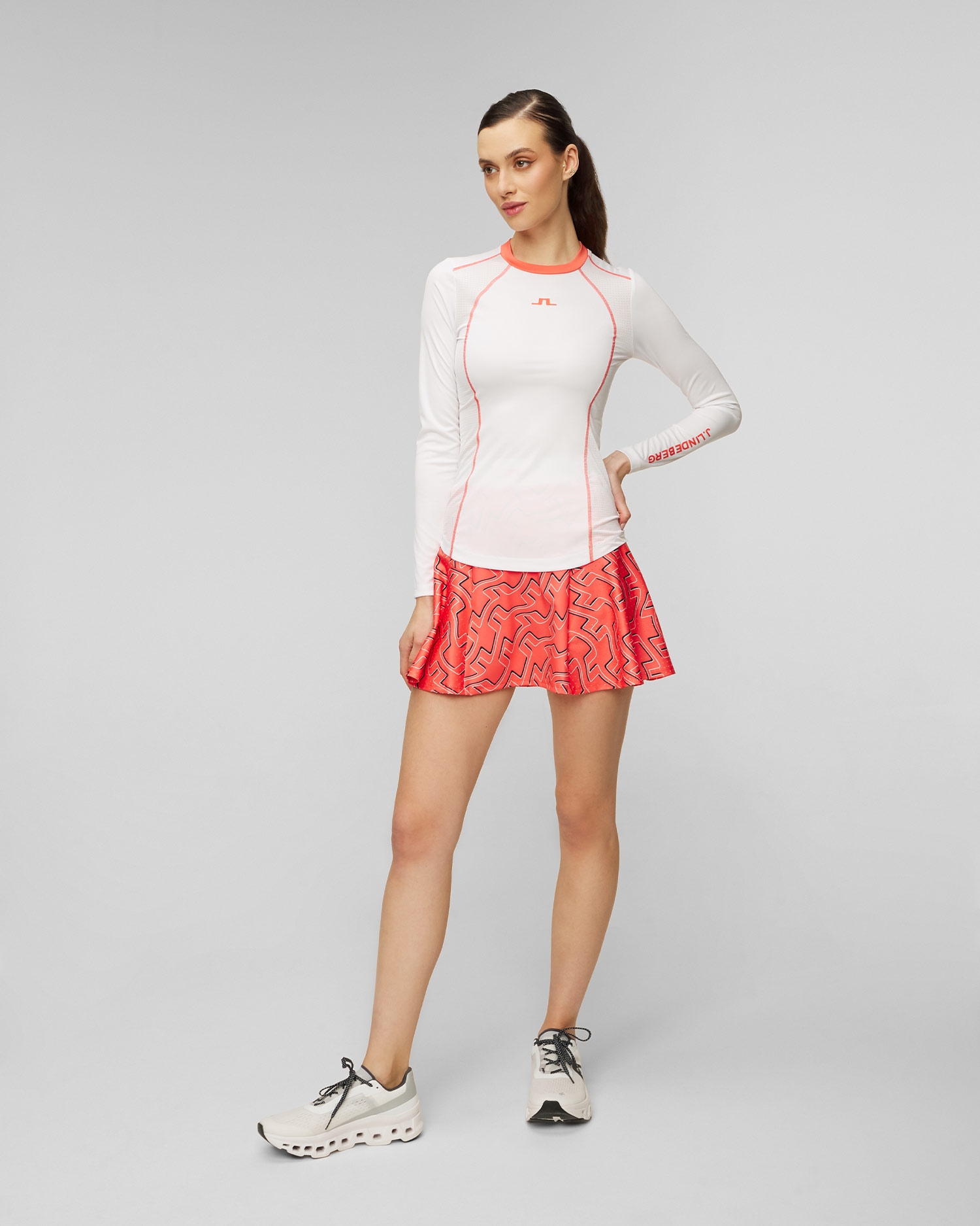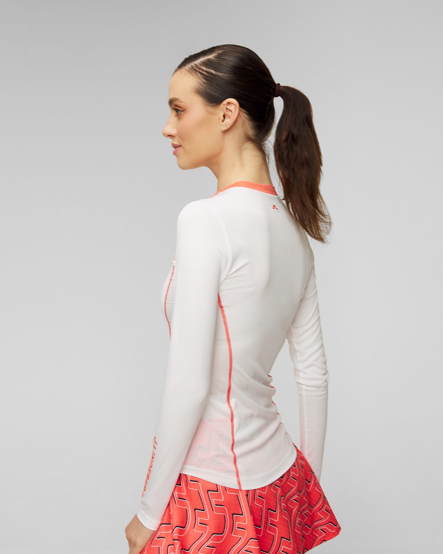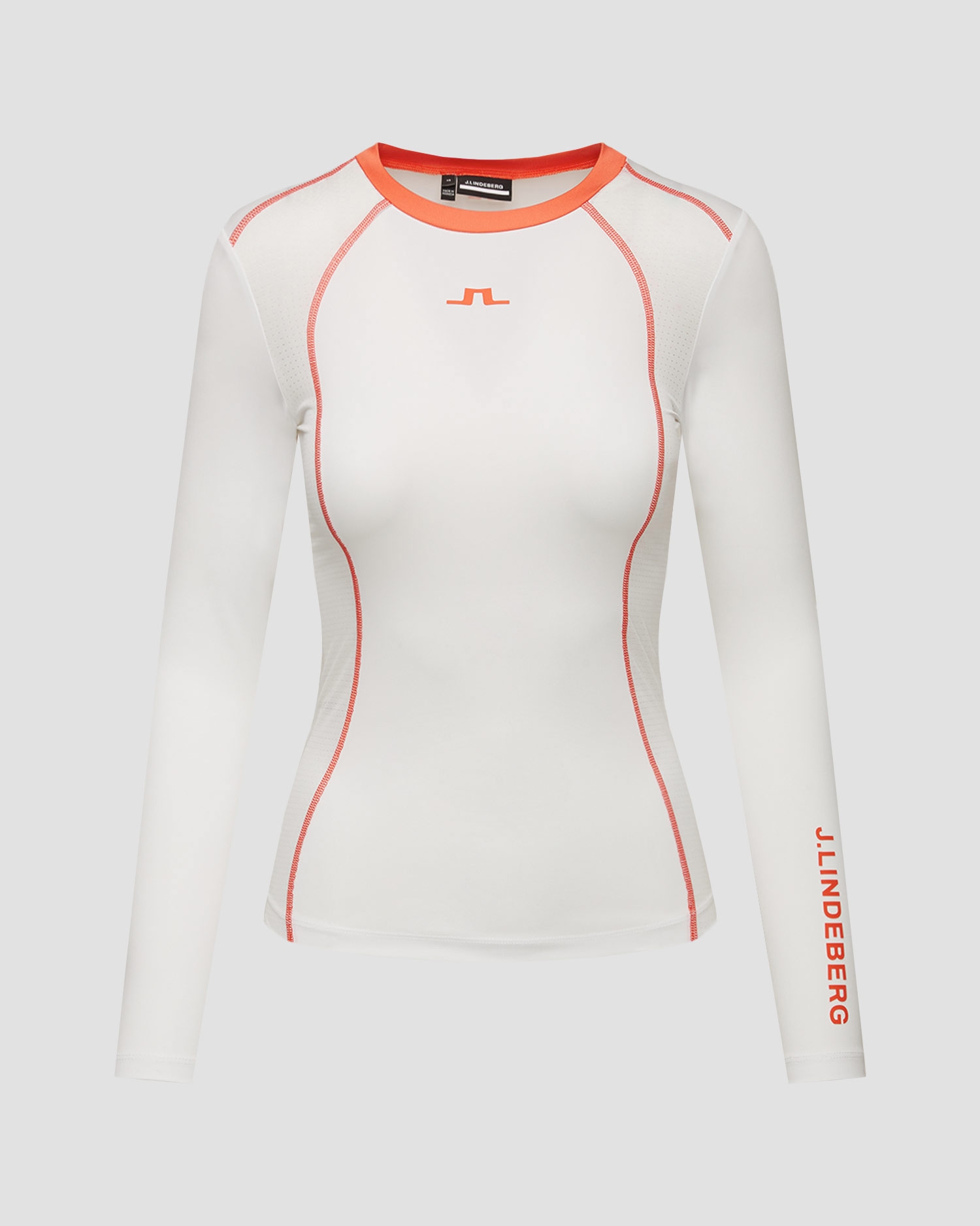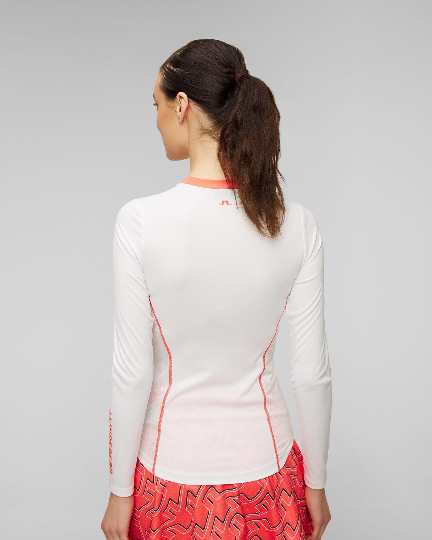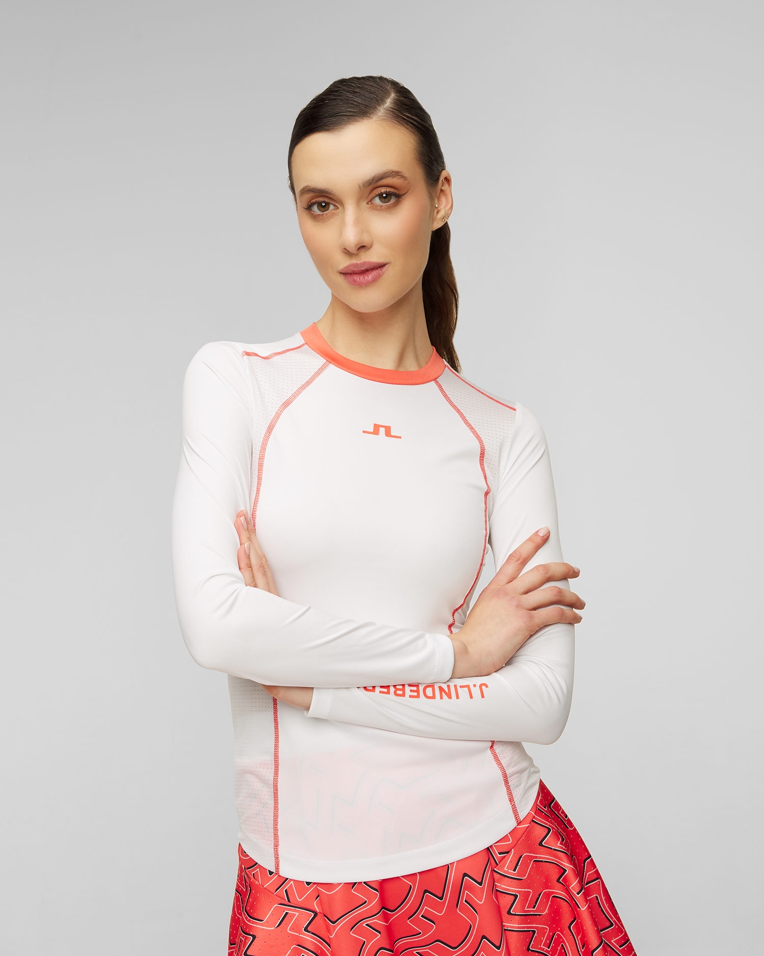 The white J.Lindeberg Amelia women's sports top with long sleeves is a versatile proposal for active women, which will complement sporty styling. It's made from a high-quality, durable and moisture-wicking fabric with four-way stretch for a perfect fit while interacting with every movement you make. Mesh panels are sewn at the shoulder line for extra breathability. The top catches the eye with contrasting colour details, including decorative brand logo appliqués.