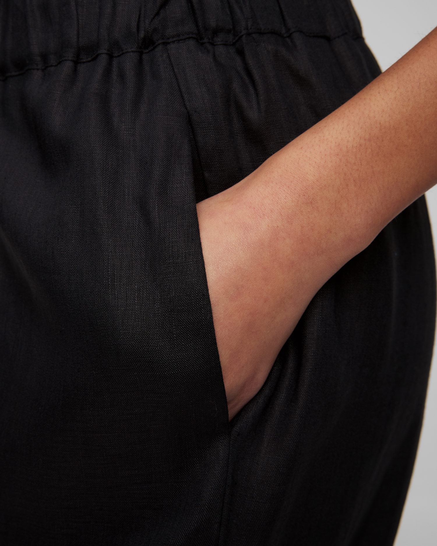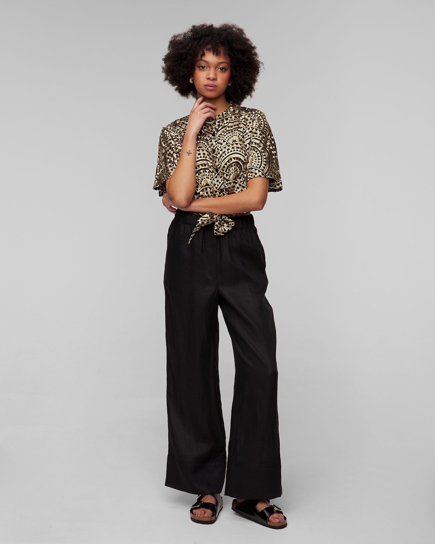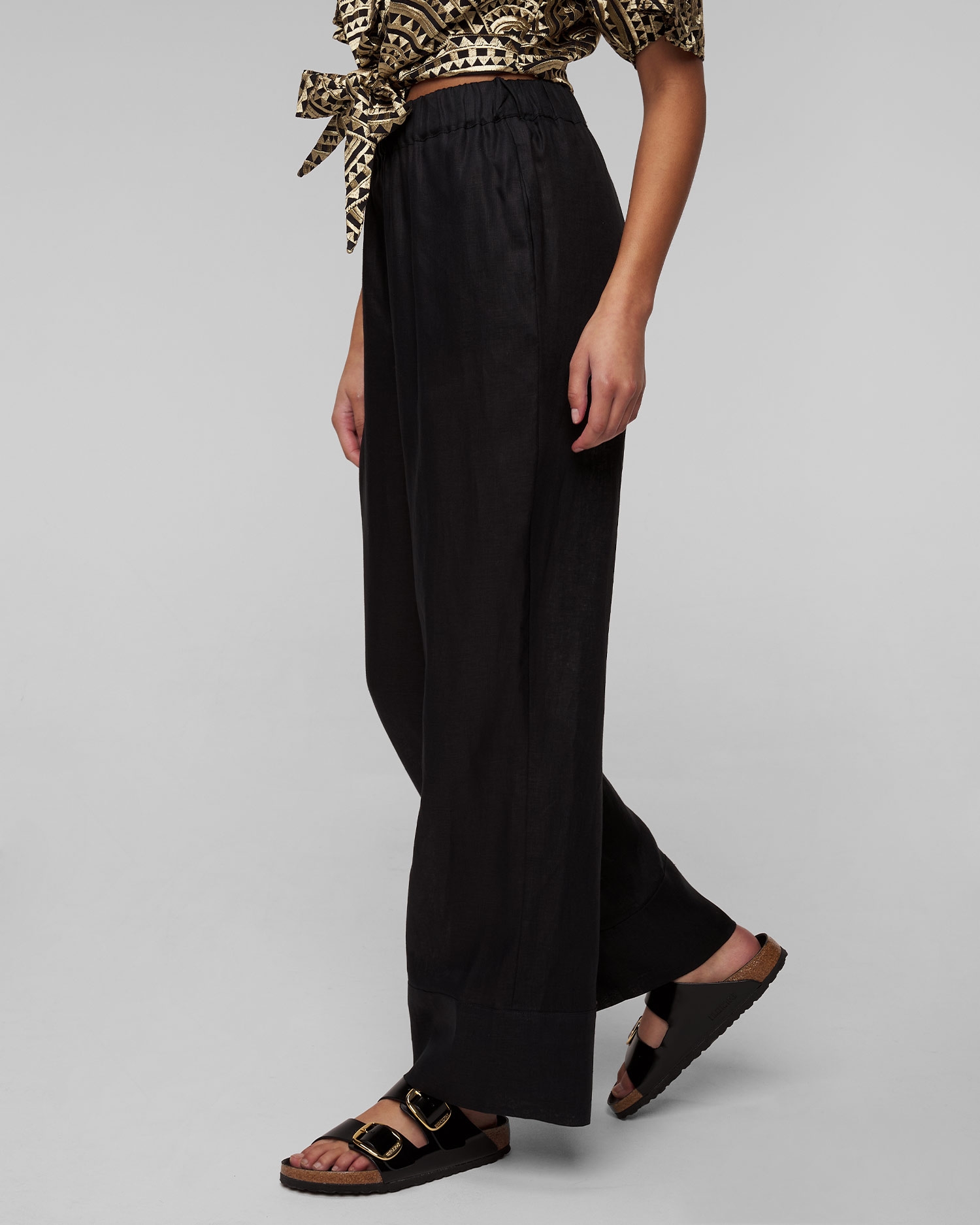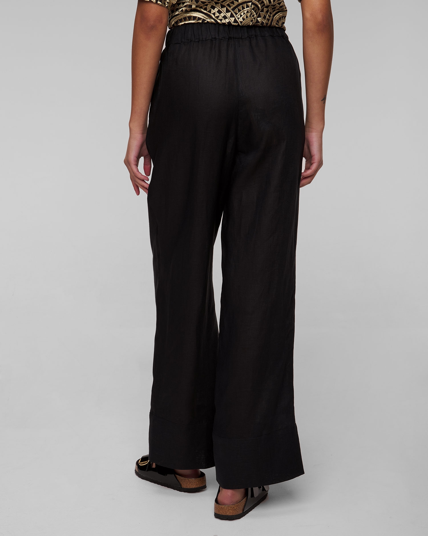 Le pantalon en lin noir pour femmes Kori sera parfait comme base de style pour l'été, offrant confort et look à la mode. Il est entièrement fabriqué en lin, qui présente des propriétés naturelles de respirabilité et d'absorption de l'humidité. Le matériau léger se caractérise en outre par une grande solidité et une résistance au frottement et à l'étirement. Pantalon à la coupe décontractée avec une taille haute et une ceinture élastiquée. Il se distingue par leurs jambes longues et larges, qui allongent efficacement la silhouette. La palette de couleurs neutres permet au pantalon de s'associer facilement au reste de votre garde-robe.