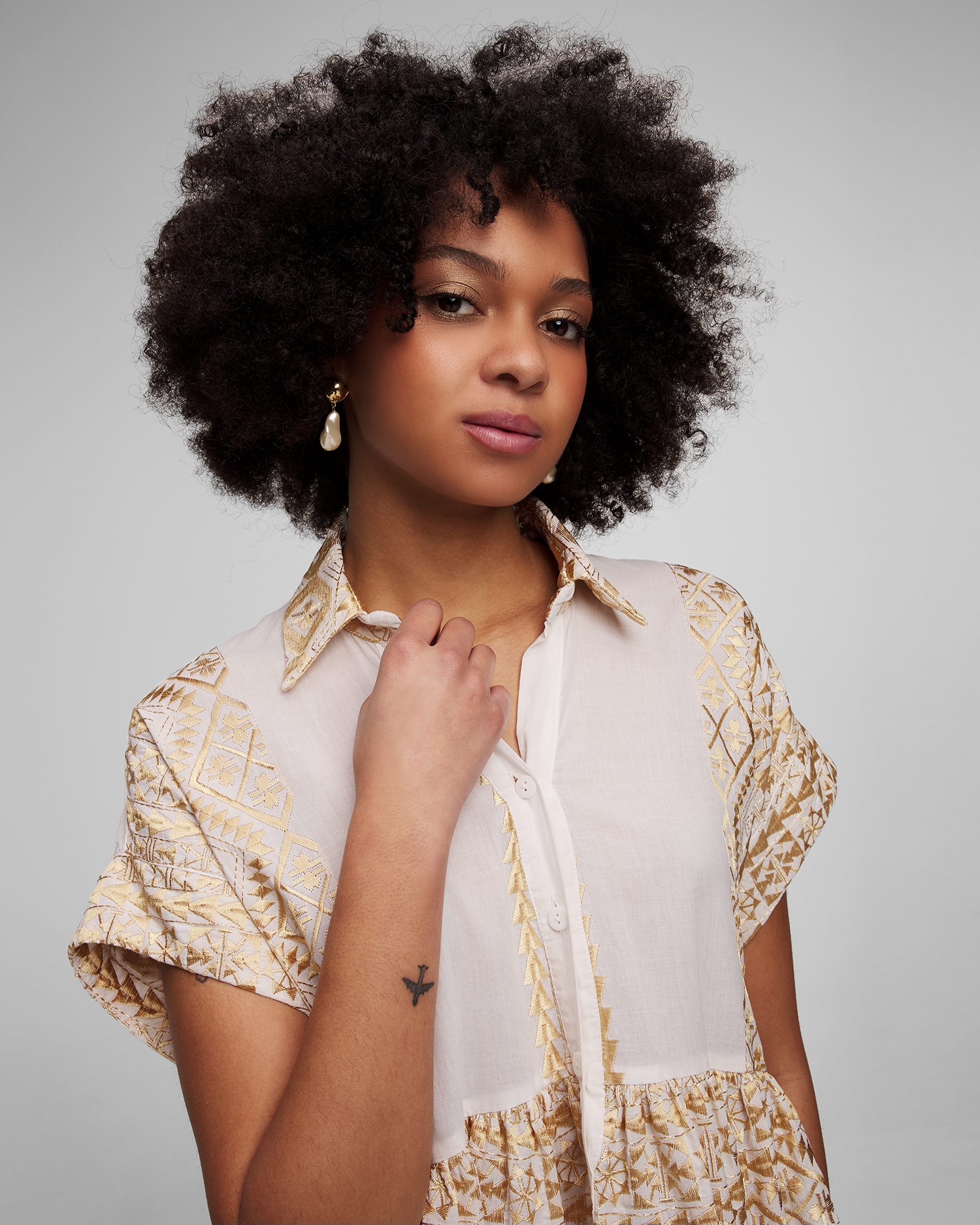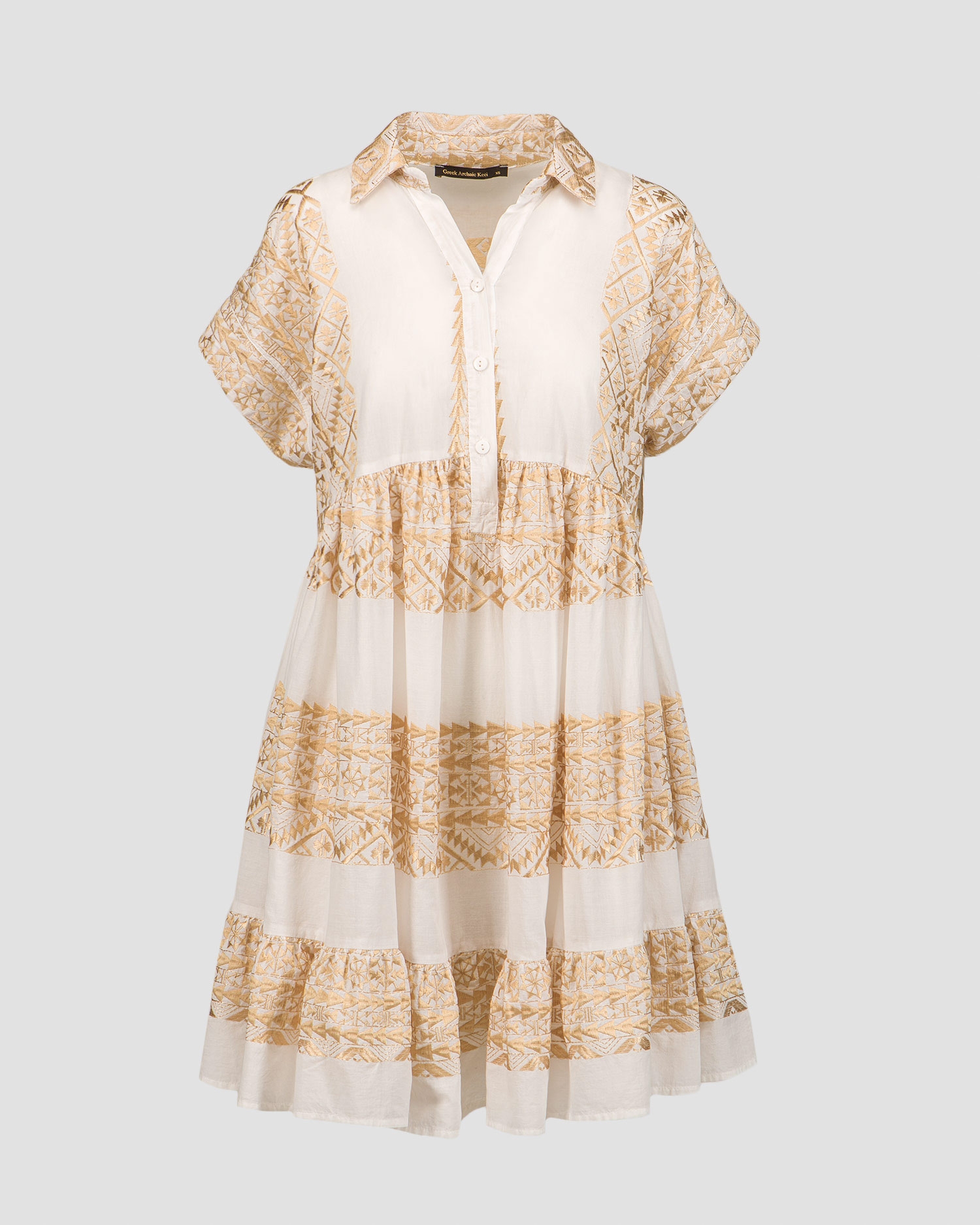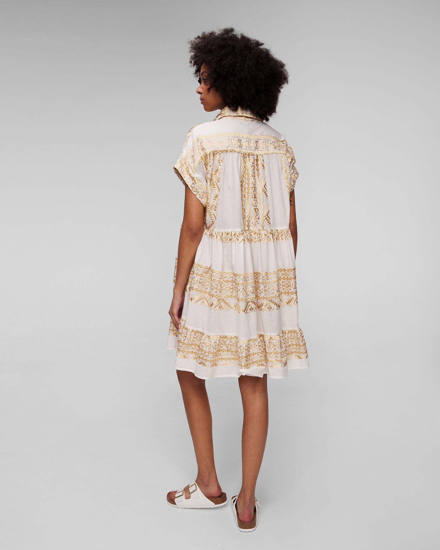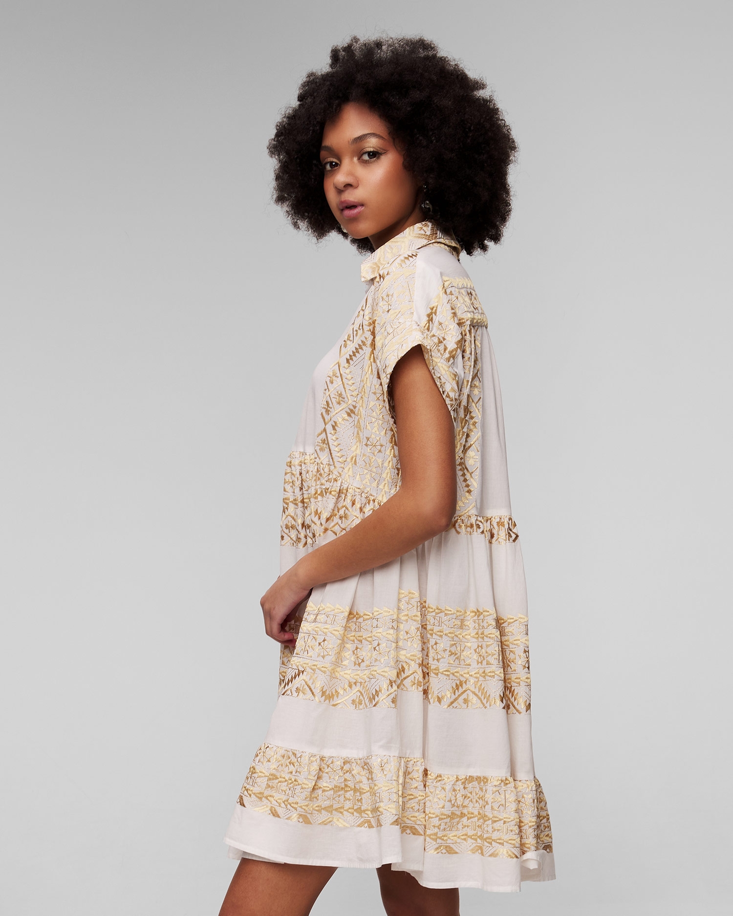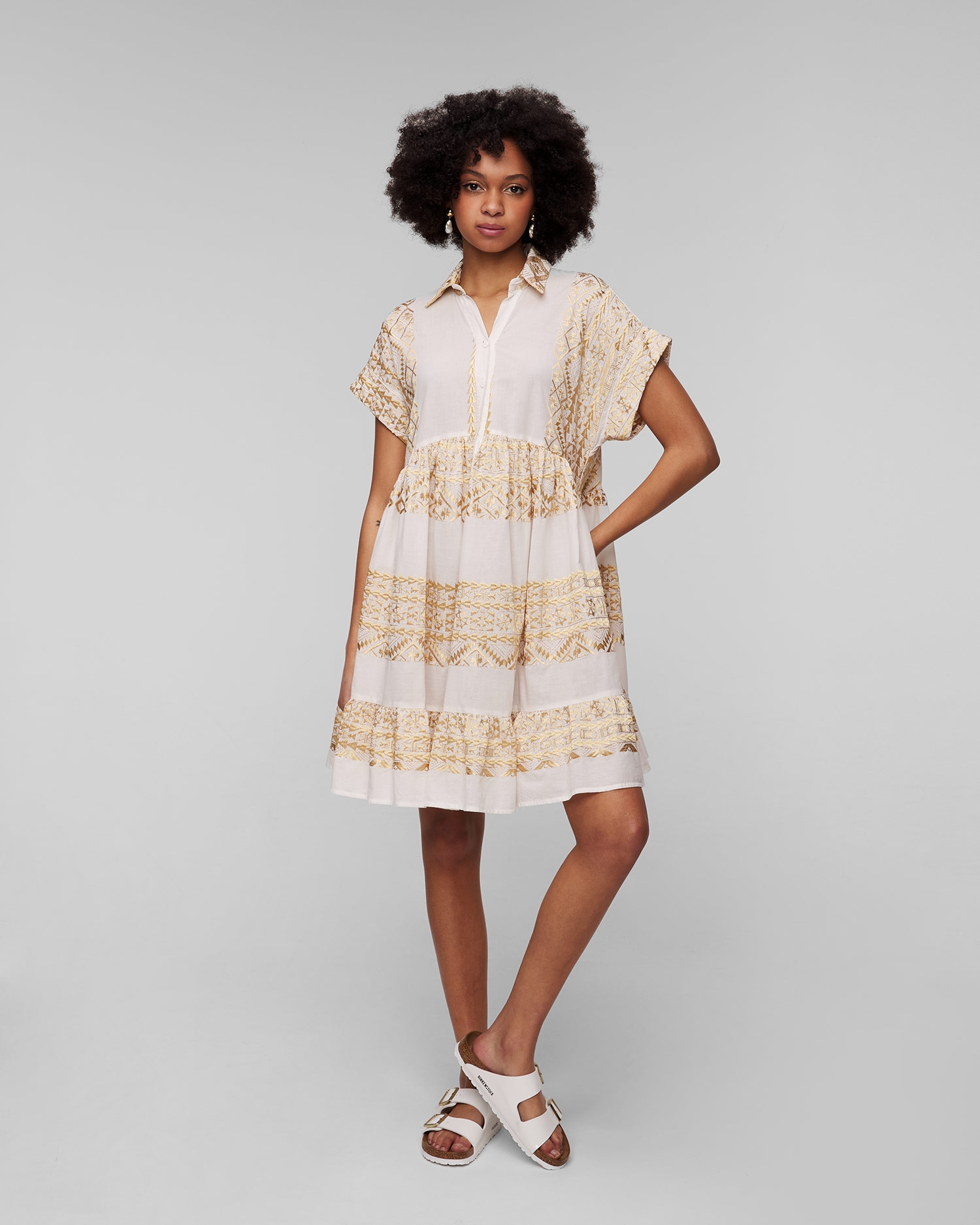La robe blanche pour femmes Kori est synonyme d'élégance estivale. Elle fonctionnera parfaitement comme base de style lors des journées plus chaudes, assurant confort et look élégant aussi bien en vacances qu'en ville. Elle est fabriqué à partir d'un tissu de coton extrêmement léger et respirant, avec des motifs ornés et brodés à la main qui rappellent la culture ancienne. La robe se caractérise par sa coupe décontractée, qui garantit le confort et une totale liberté de mouvement. Les manches courtes et le col boutonné classique ajoutent une touche intemporelle.