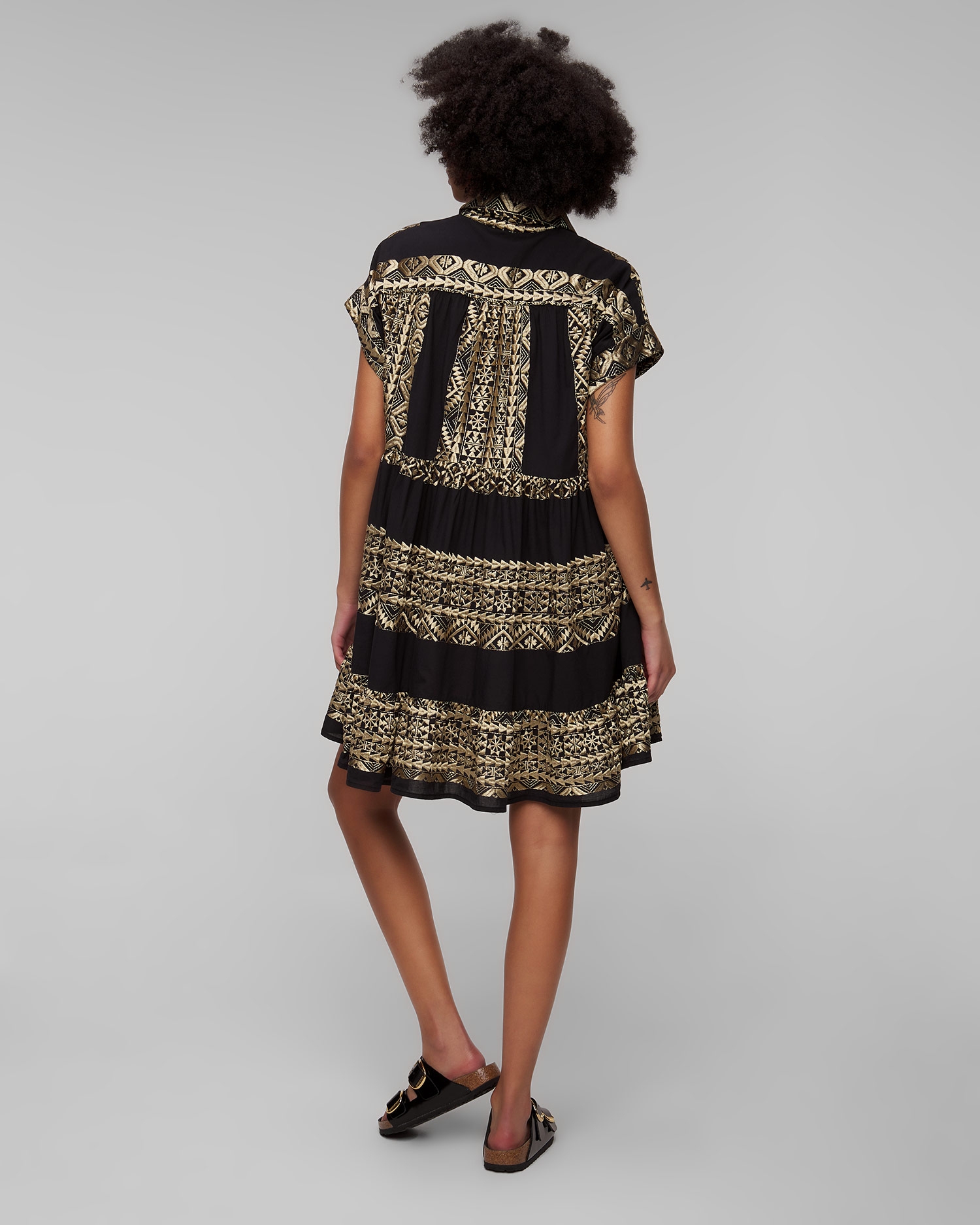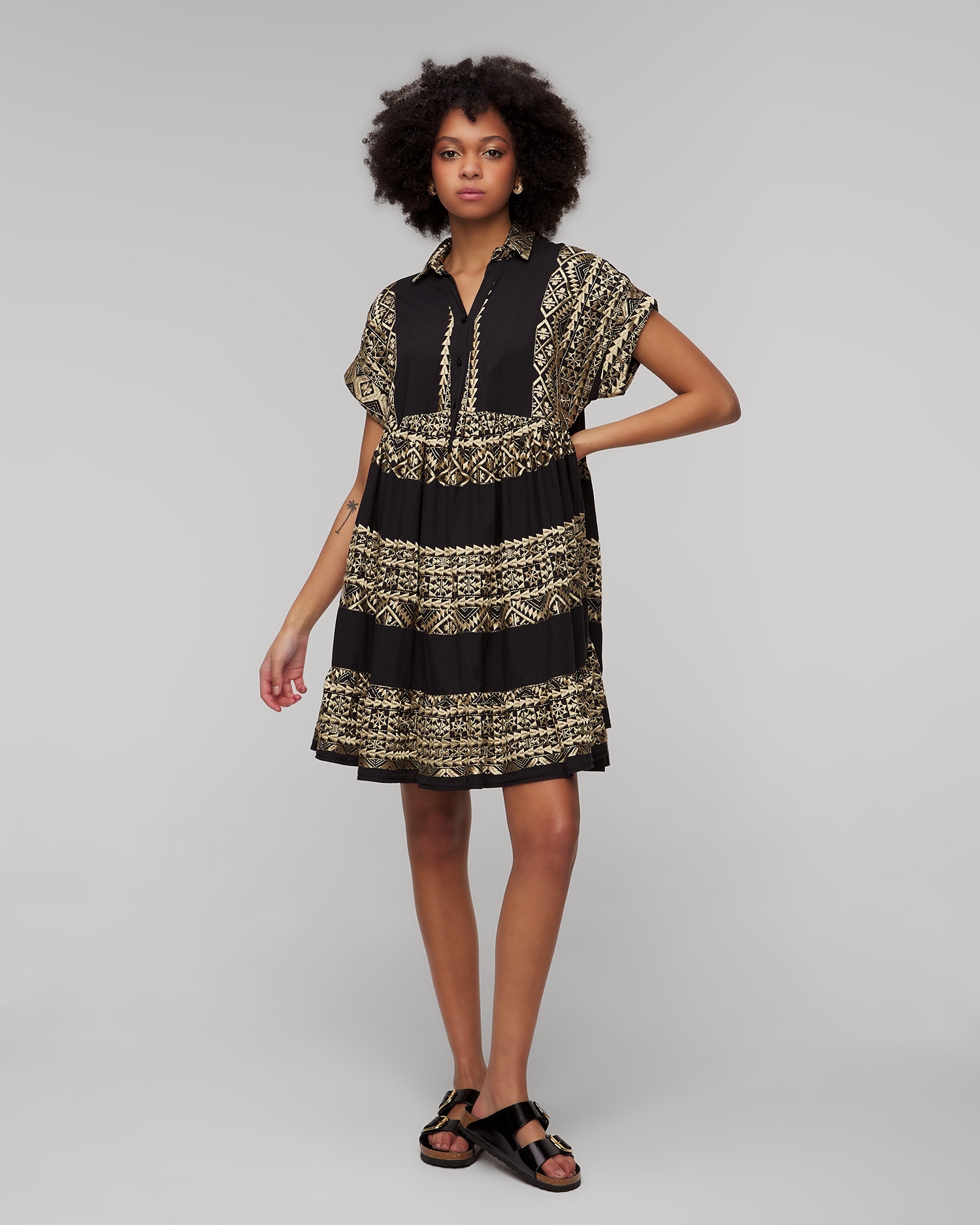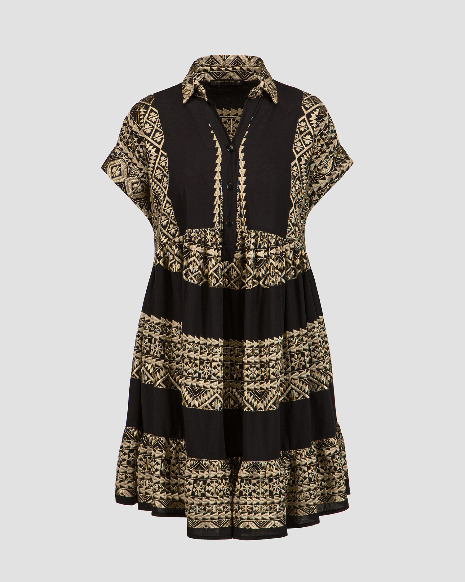 La robe noire pour femmes Kori est synonyme d'élégance estivale. Elle fonctionnera parfaitement comme base de style lors des journées plus chaudes, assurant confort et look élégant aussi bien en vacances qu'en ville. Elle est fabriqué à partir d'un tissu de coton extrêmement léger et respirant, avec des motifs ornés et brodés à la main qui rappellent la culture ancienne. La robe se caractérise par sa coupe décontractée, qui garantit le confort et une totale liberté de mouvement. Les manches courtes et le col boutonné classique ajoutent une touche intemporelle.