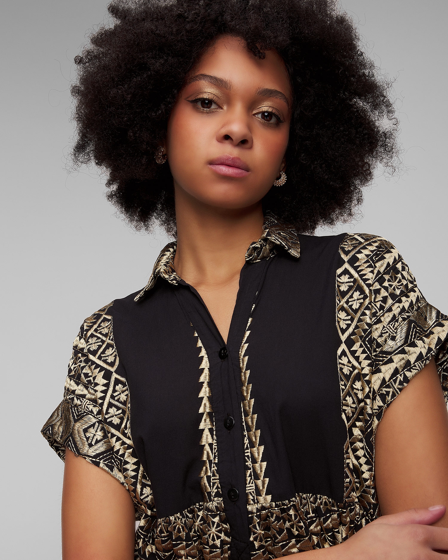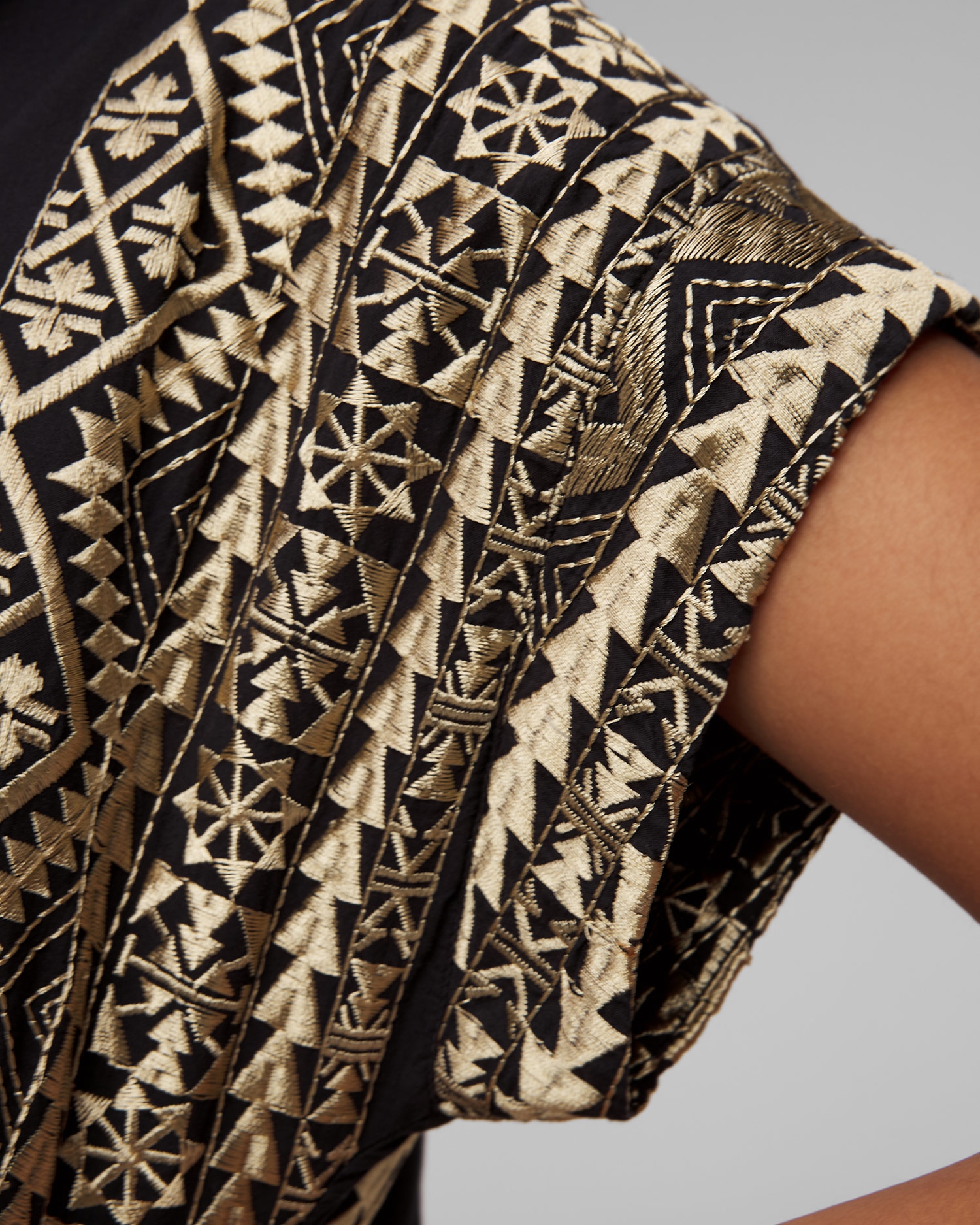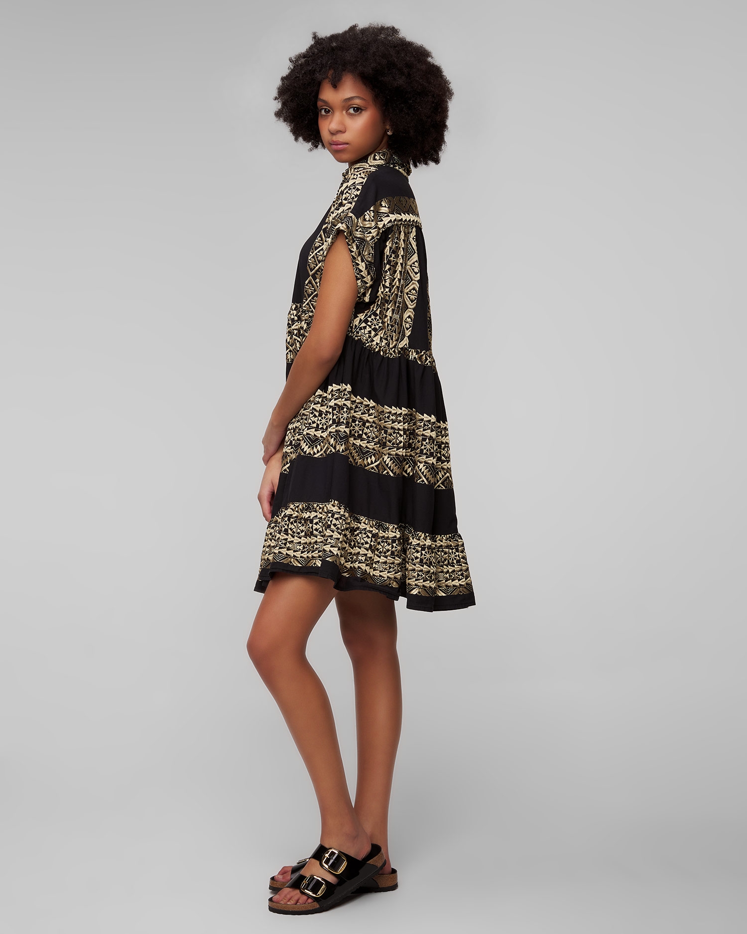 La robe noire pour femmes Kori est synonyme d'élégance estivale. Elle fonctionnera parfaitement comme base de style lors des journées plus chaudes, assurant confort et look élégant aussi bien en vacances qu'en ville. Elle est fabriqué à partir d'un tissu de coton extrêmement léger et respirant, avec des motifs ornés et brodés à la main qui rappellent la culture ancienne. La robe se caractérise par sa coupe décontractée, qui garantit le confort et une totale liberté de mouvement. Les manches courtes et le col boutonné classique ajoutent une touche intemporelle.