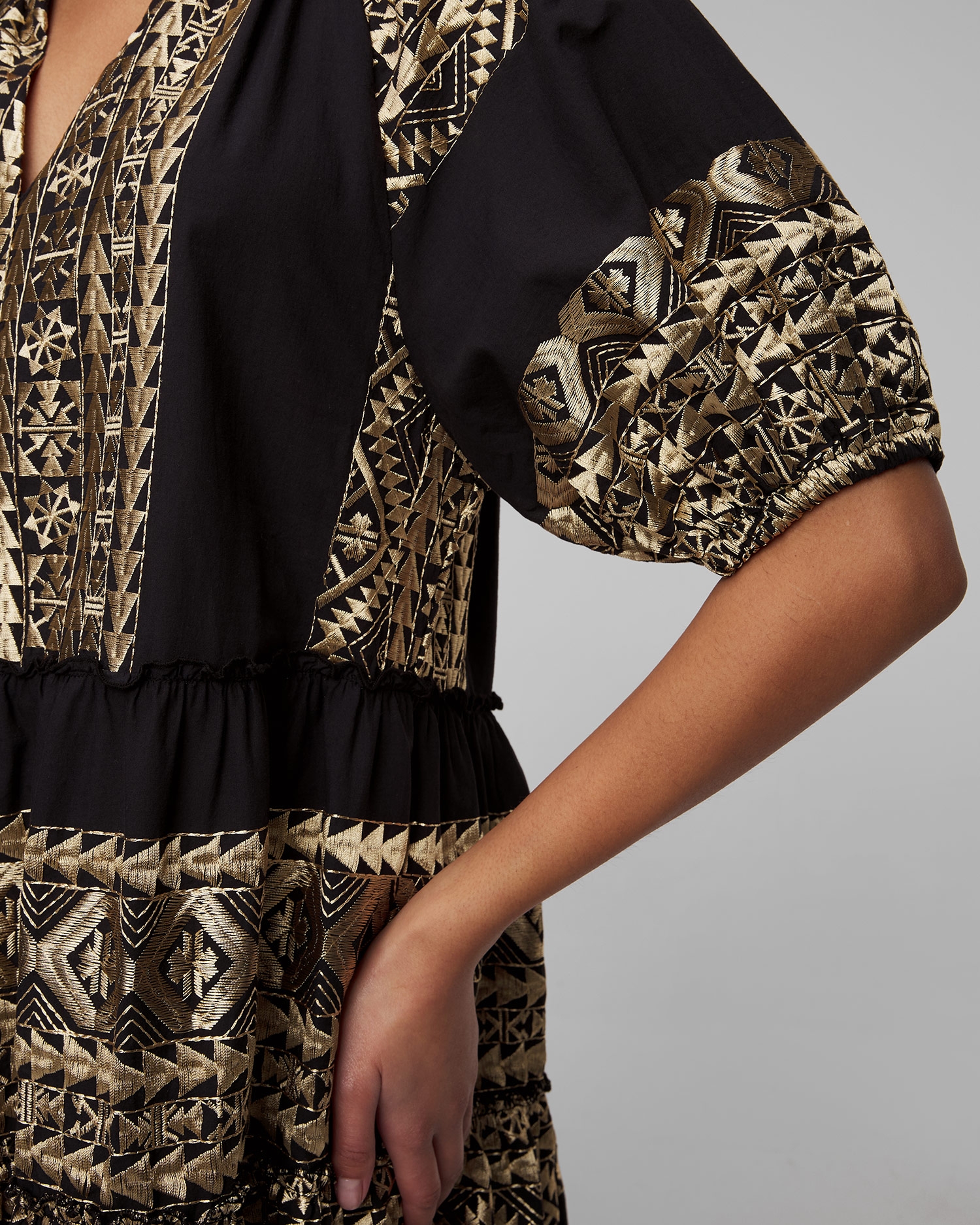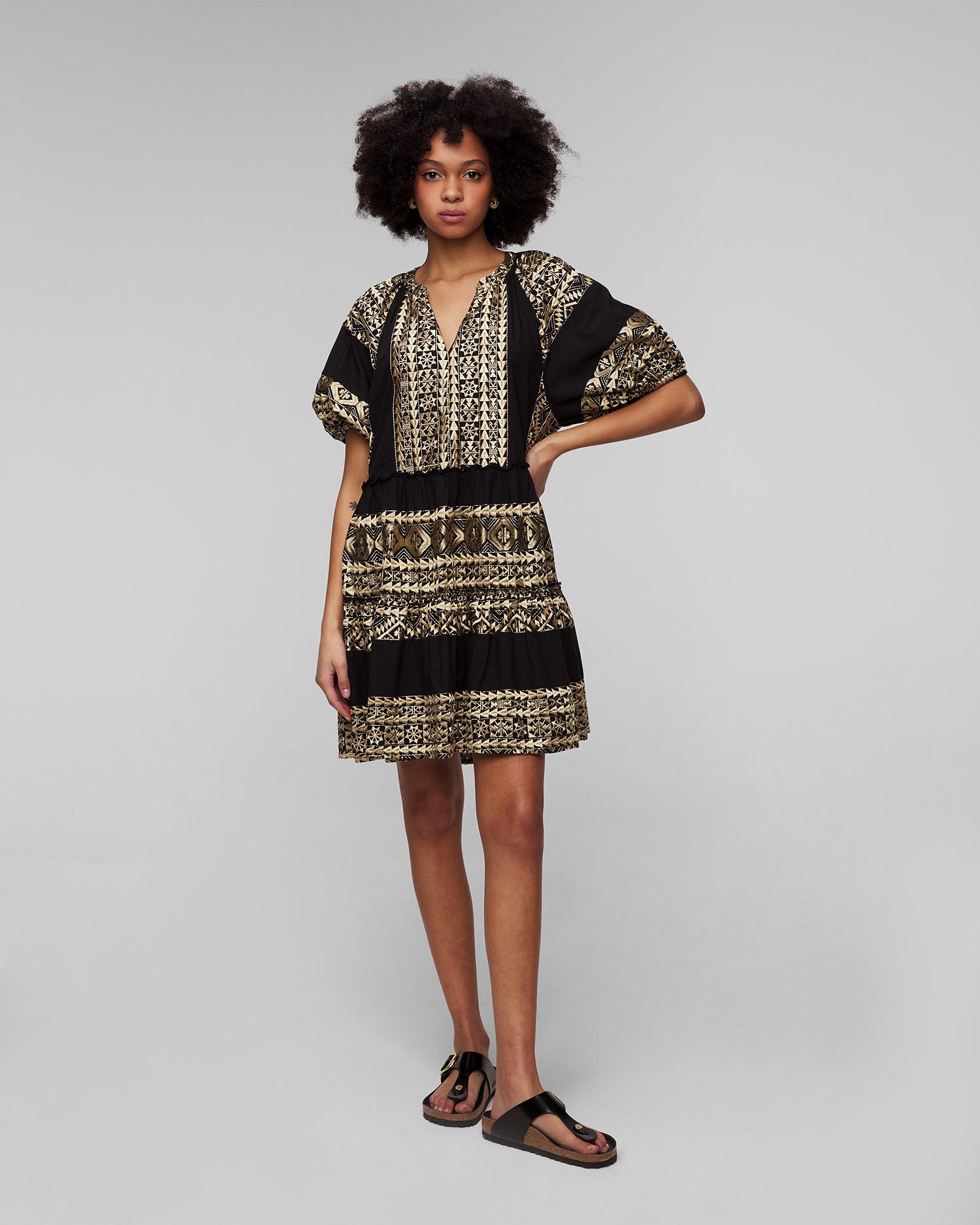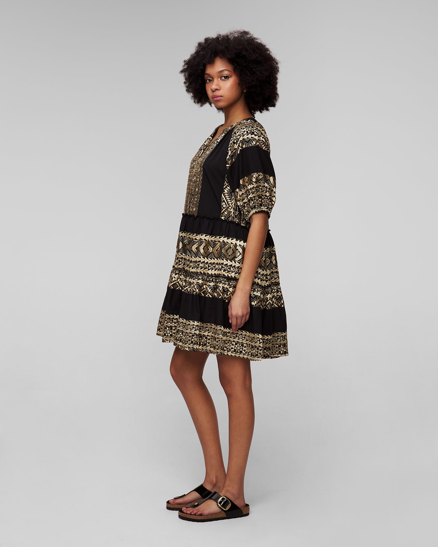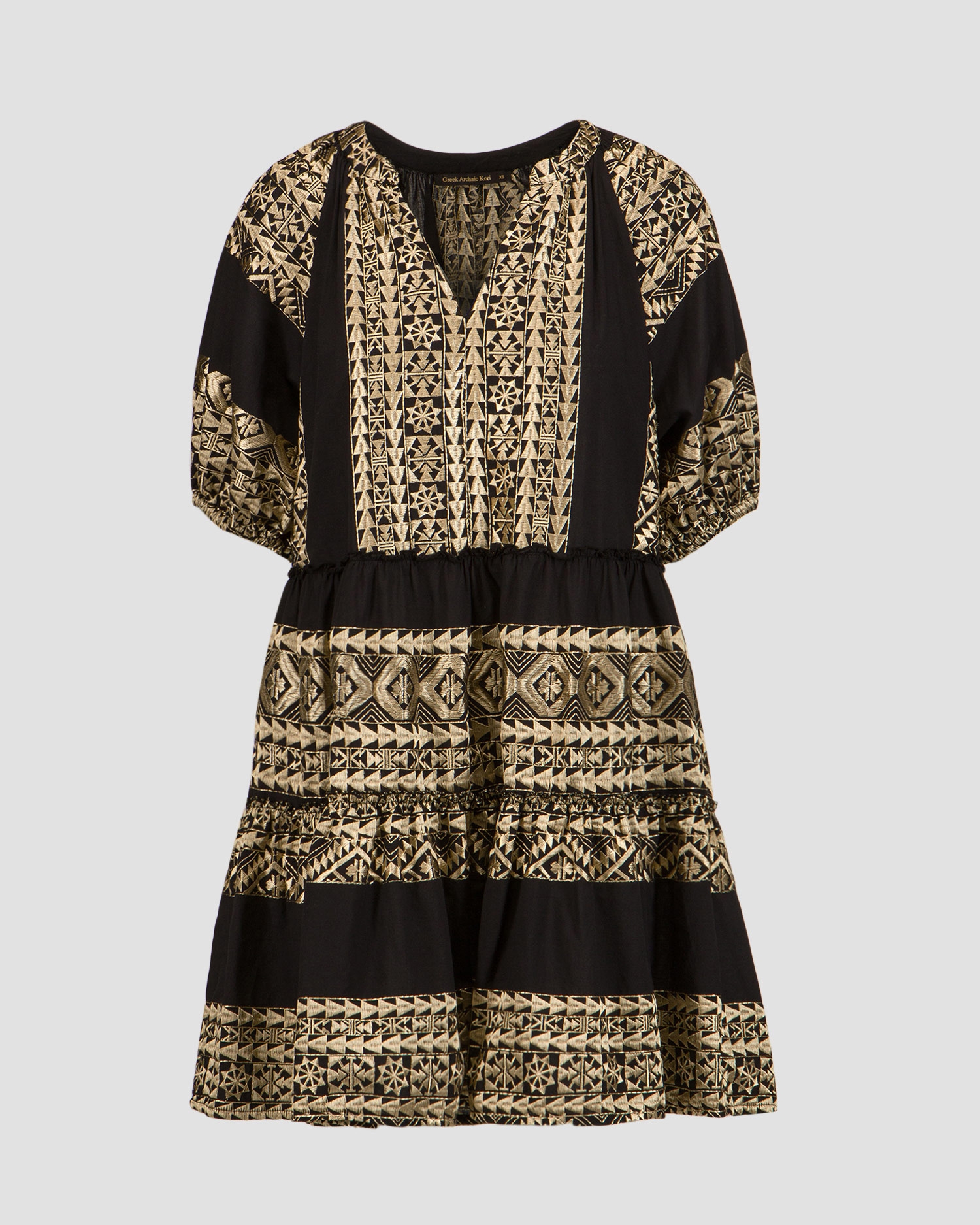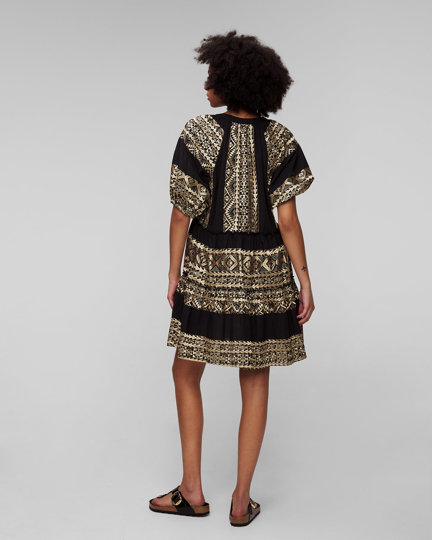 La robe noire pour femmes Kori est une proposition dans laquelle vous vous sentirez extrêmement féminine et élégante. Fabriquée à partir d'un tissu de coton aéré avec une respirabilité naturelle pour assurer un grand confort pendant les chaudes journées d'été. Robe à la coupe décontractée avec encolure en V et manches bouffantes. Elle attire l'attention par ses motifs ornés et brodés à la main. L'originalité de la robe est encore soulignée par la jupe qui se termine par un volant.