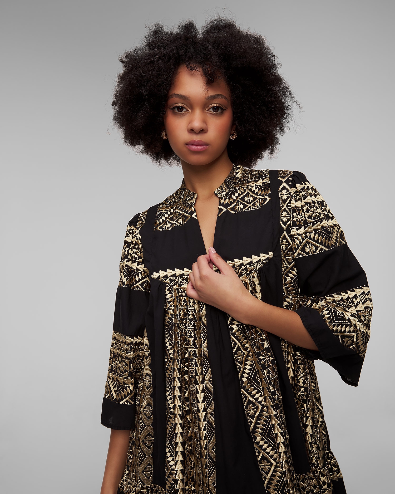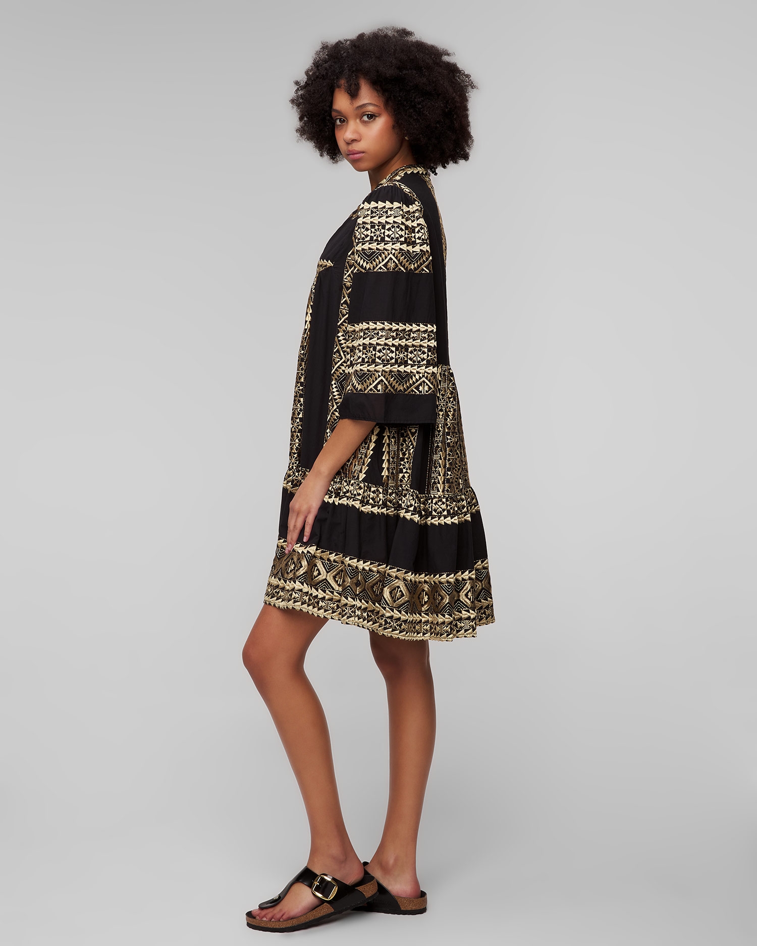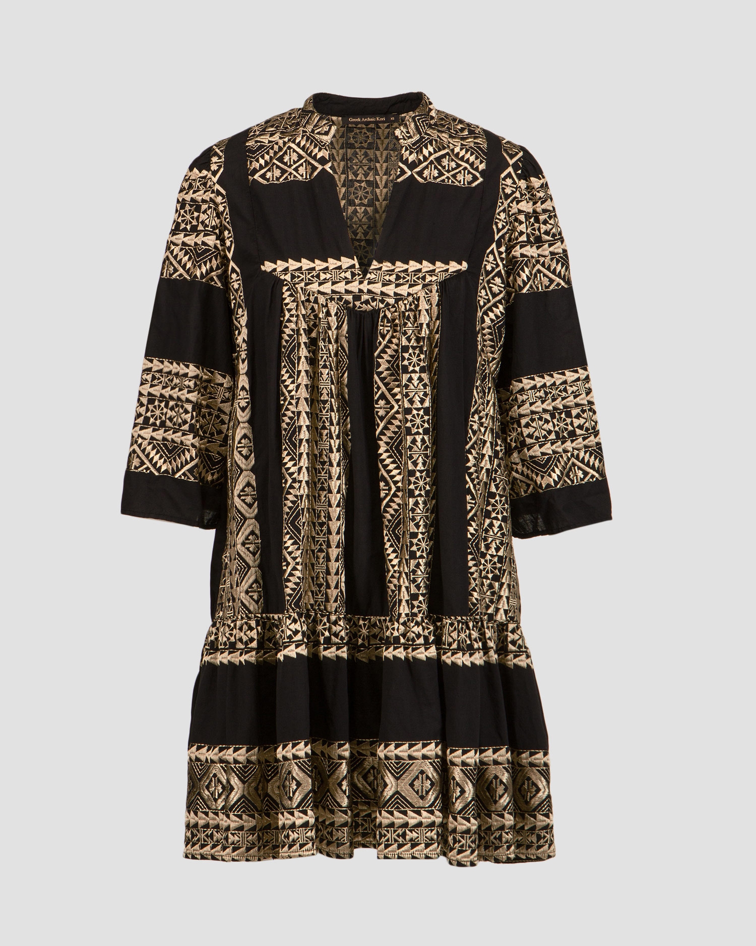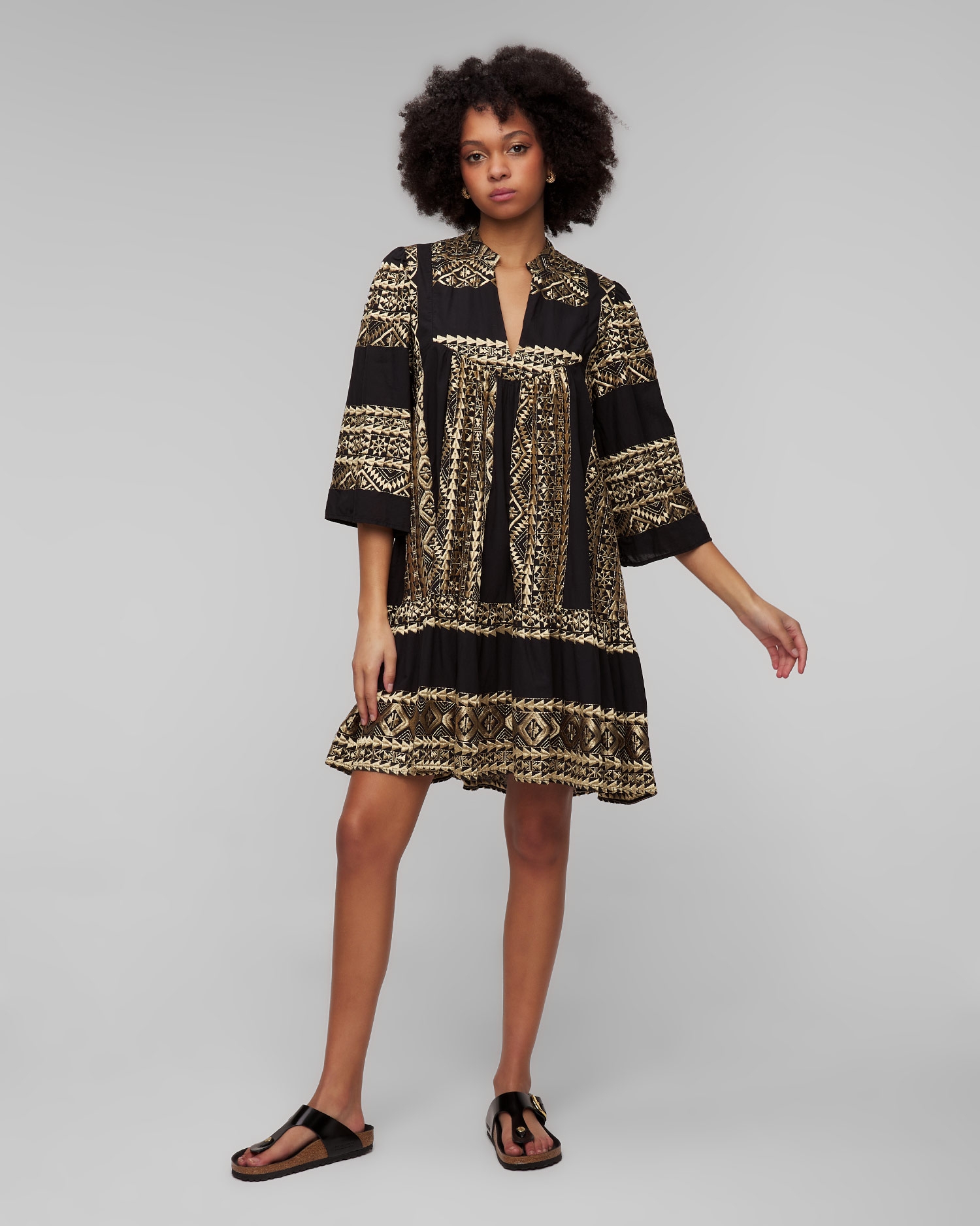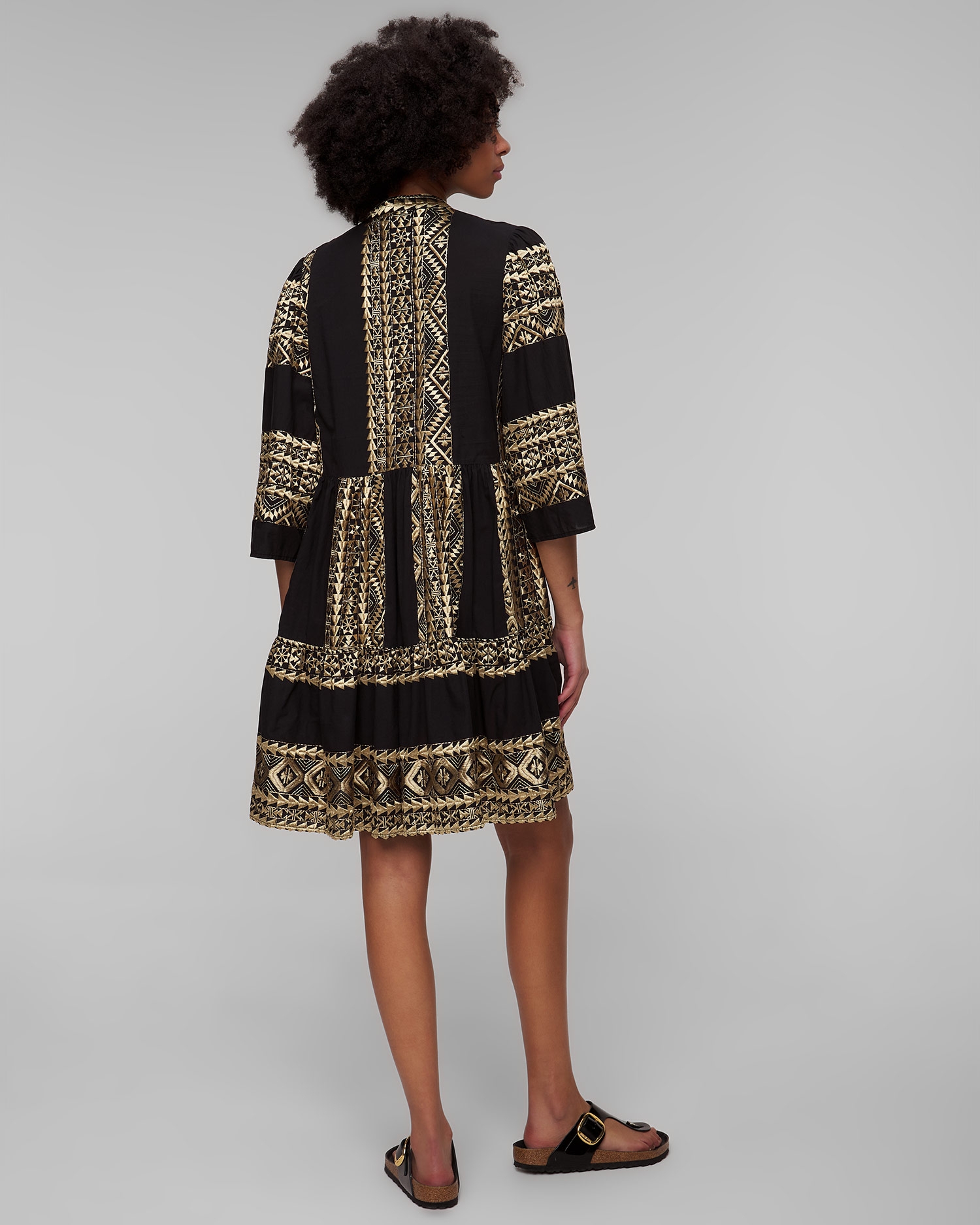La robe noire pour femmes Kori est un choix exceptionnel pour la saison estivale. Elle séduit par la richesse de son design et ses broderies faites à la main, inspirées de la culture ancienne. Elle sera parfaite pour les vacances d'été et les promenades en ville pendant les chaudes journées d'été. La robe est en coton extrêmement doux et agréable au toucher. Son design décontracté assure un confort maximal sans restreindre les mouvements. L'encolure en V allonge efficacement la silhouette. Les manches évasées de ¾ de longueur ajoutent une touche élégante et une légèreté de vacances à l'ensemble.