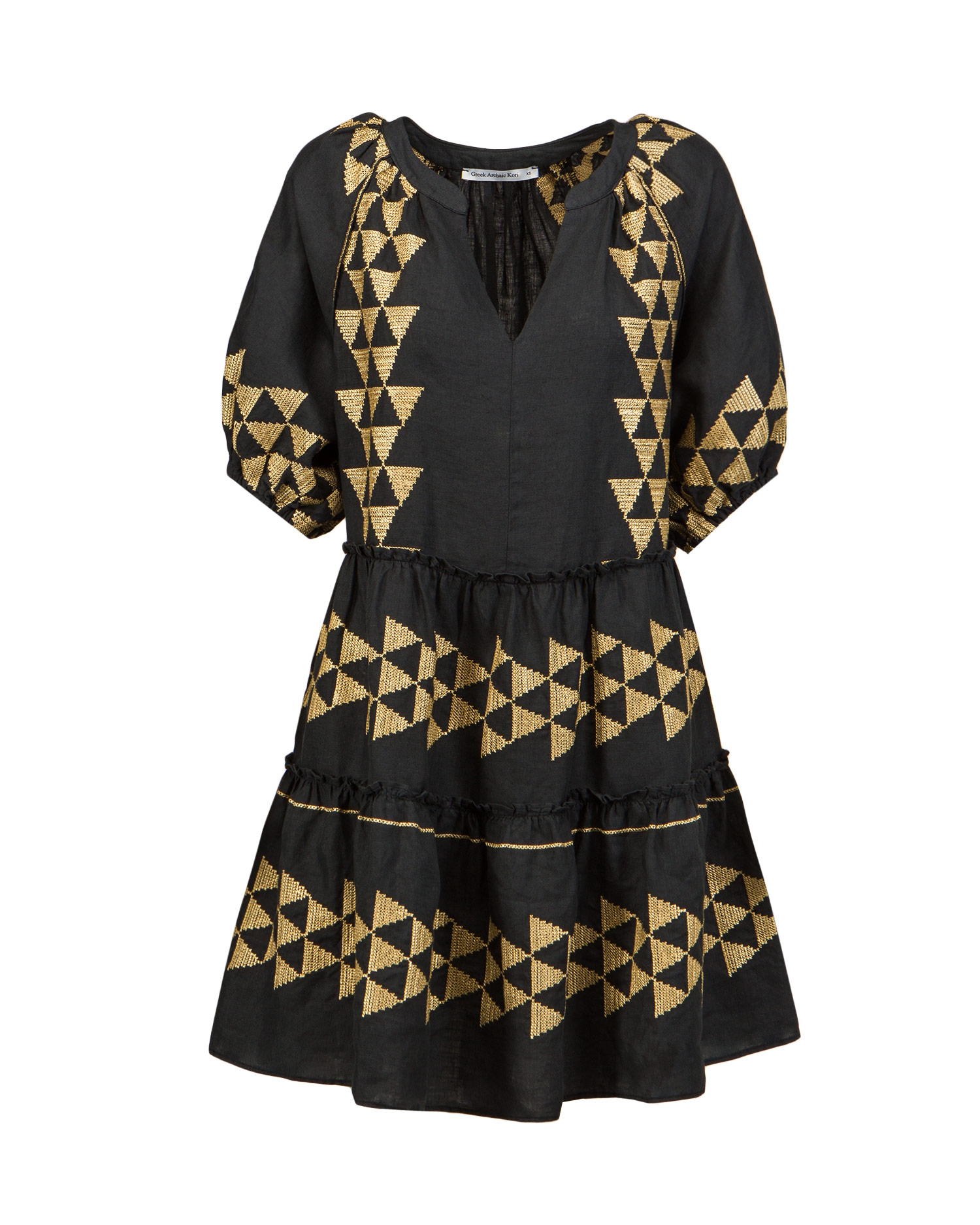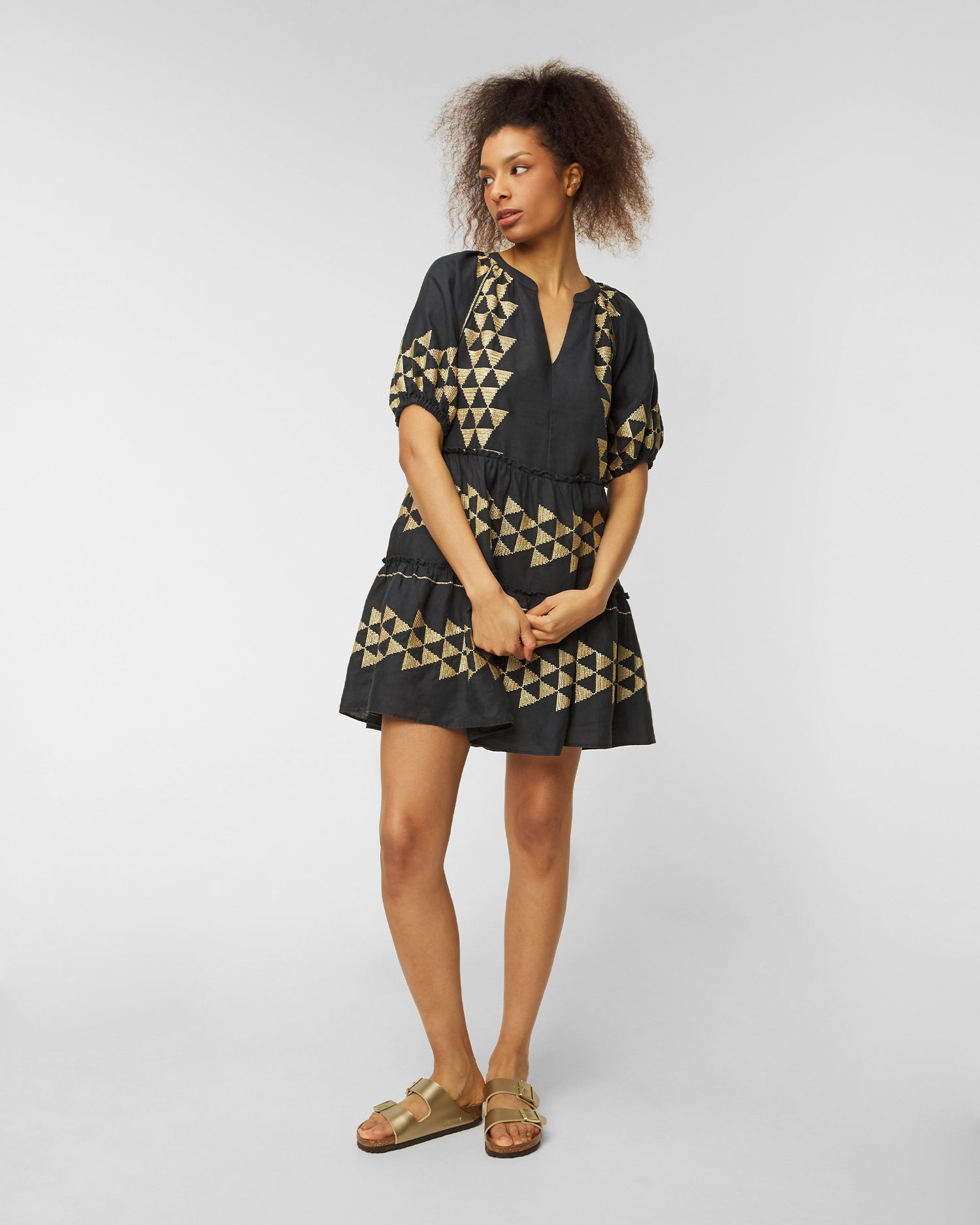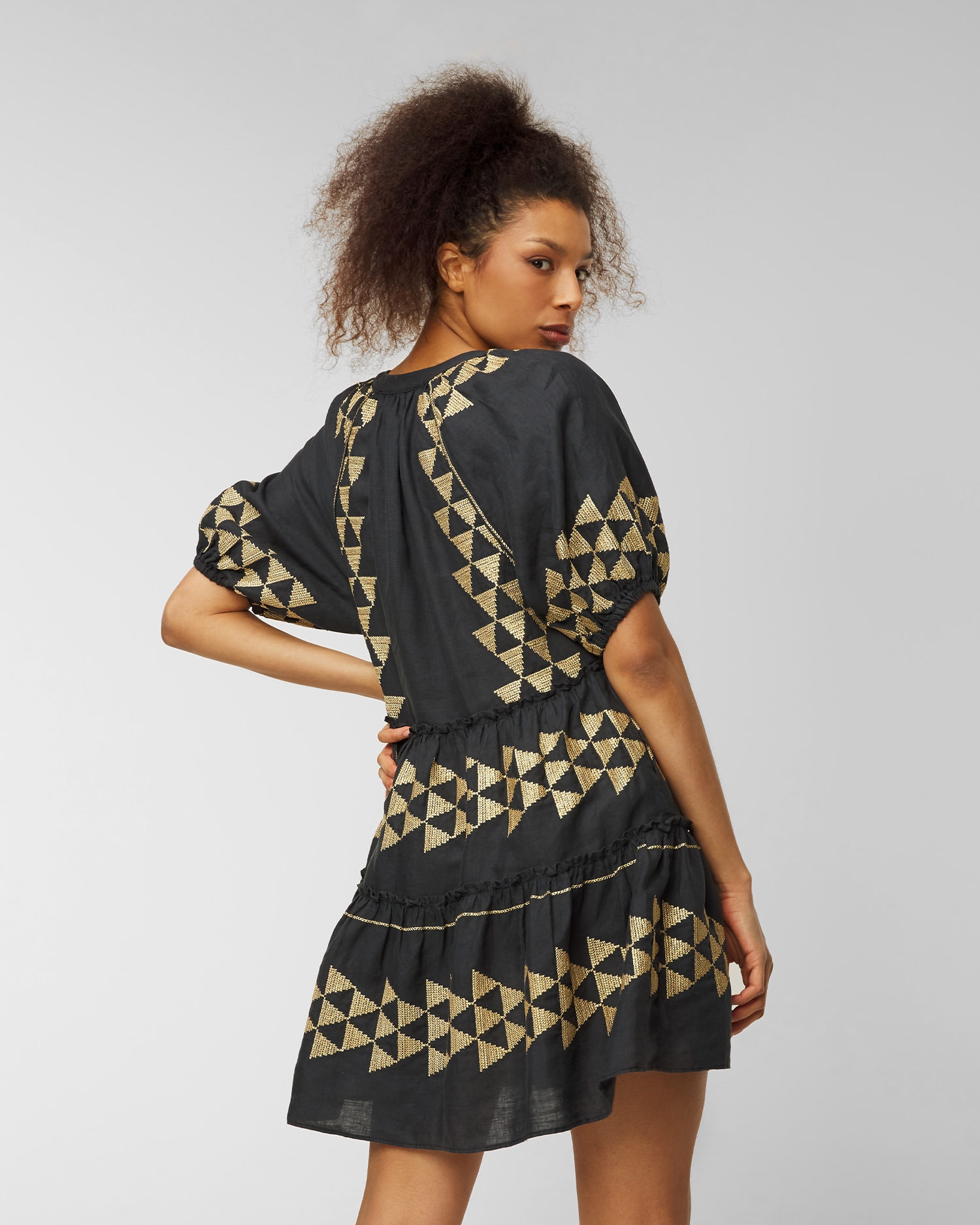La robe en lin Kori est une proposition dans laquelle vous vous sentirez extrêmement féminine et élégante. Fabriqué en tissu de lin aéré aux propriétés naturelles de respirabilité et d'absorption de l'humidité, grâce auquel il offrira un grand confort pendant les chaudes journées d'été. Robe décontractée à col en V et manches bouffantes. Il attire l'attention avec une broderie décorative faite à la main dans un motif grec. Le caractère original de la robe est en outre souligné par une jupe à volants.