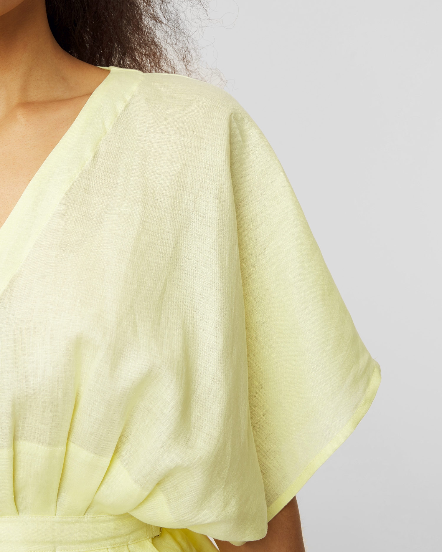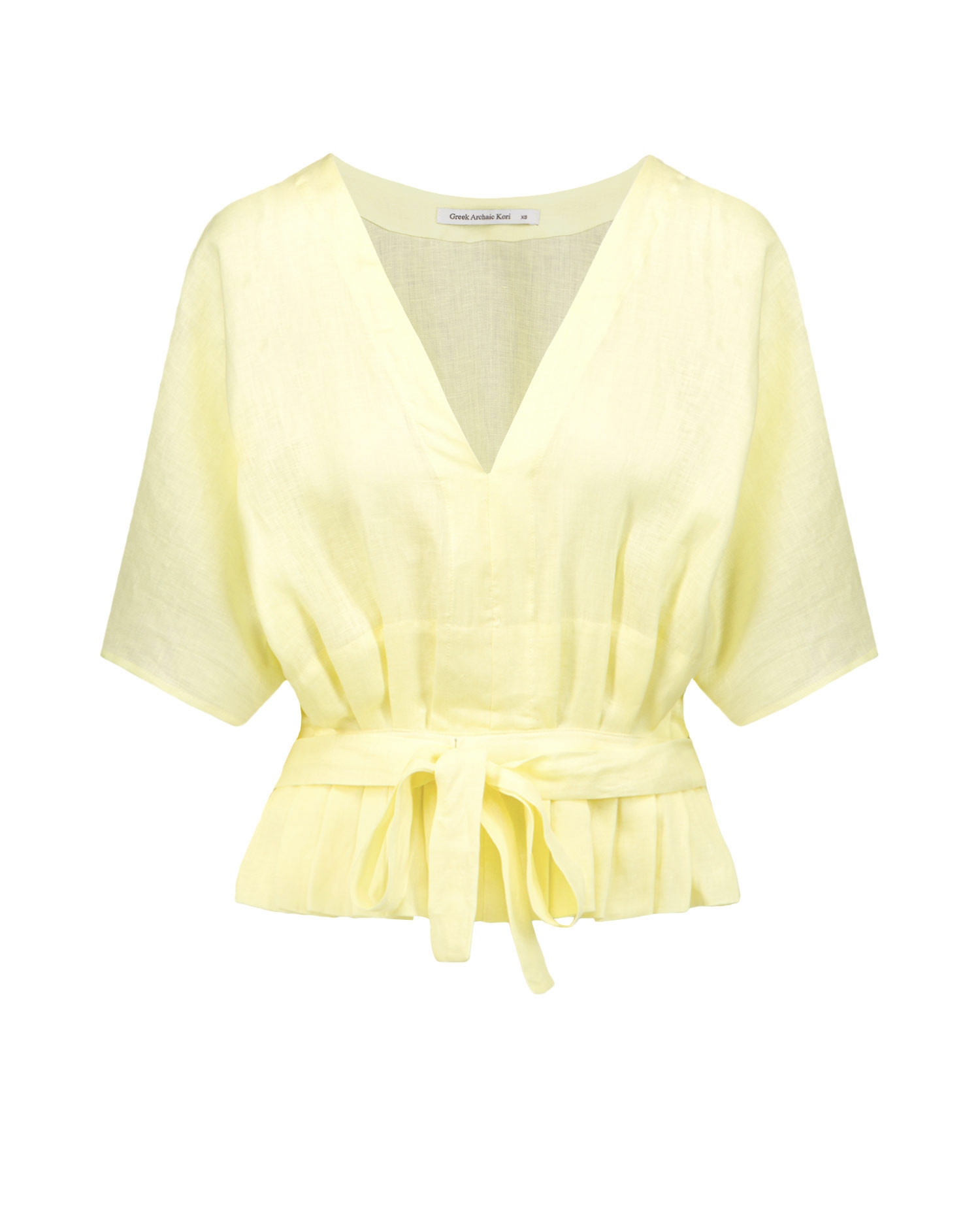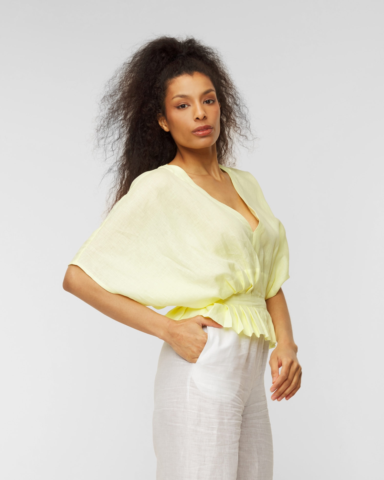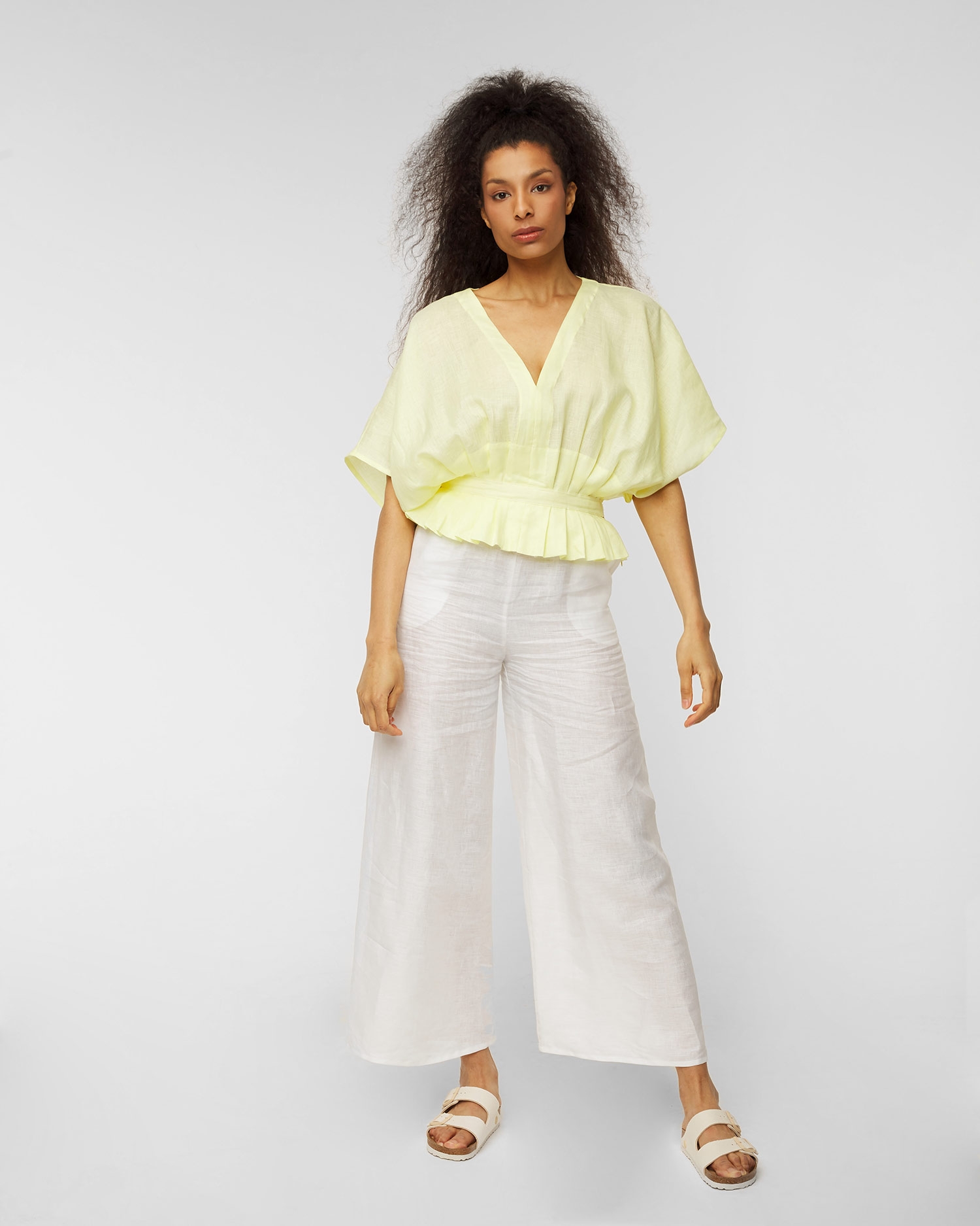 Le haut en lin Kori apportera une touche stylée à toutes vos tenues estivales. Il fonctionnera parfaitement aussi bien comme élément d'ensemble de tous les jours qu'élégant. Fabriqué entièrement en lin aéré aux propriétés naturelles de respirabilité et d'absorption de l'humidité, grâce auquel il offrira un grand confort par temps chaud. La construction d'une coupe libre avec taille réglable avec une ceinture, qui vous permettra de l'ajuster à la silhouette, tout en soulignant sa forme. Top avec une encolure en V et des manches courtes et amples, qui accentuent encore son caractère de vacances.
