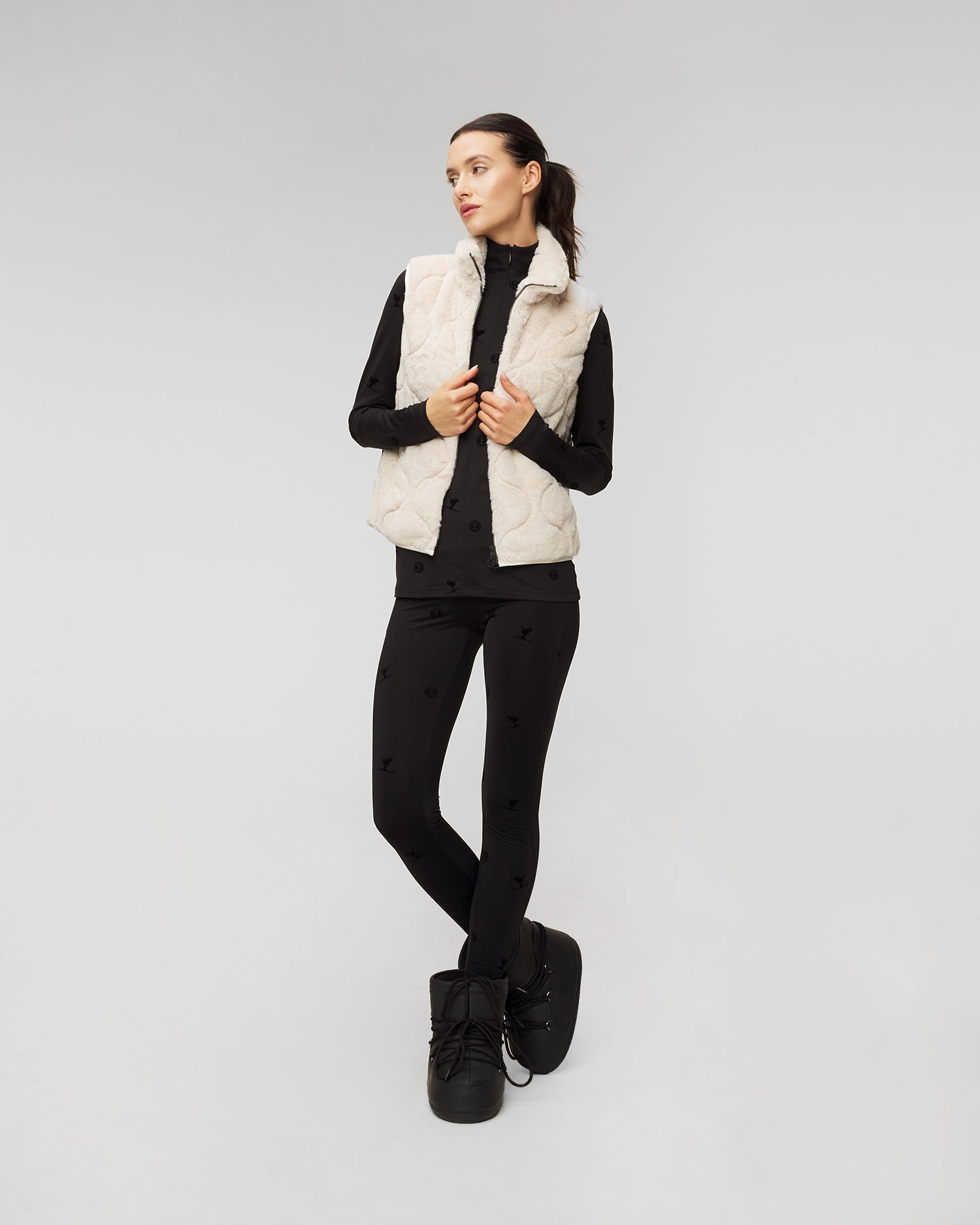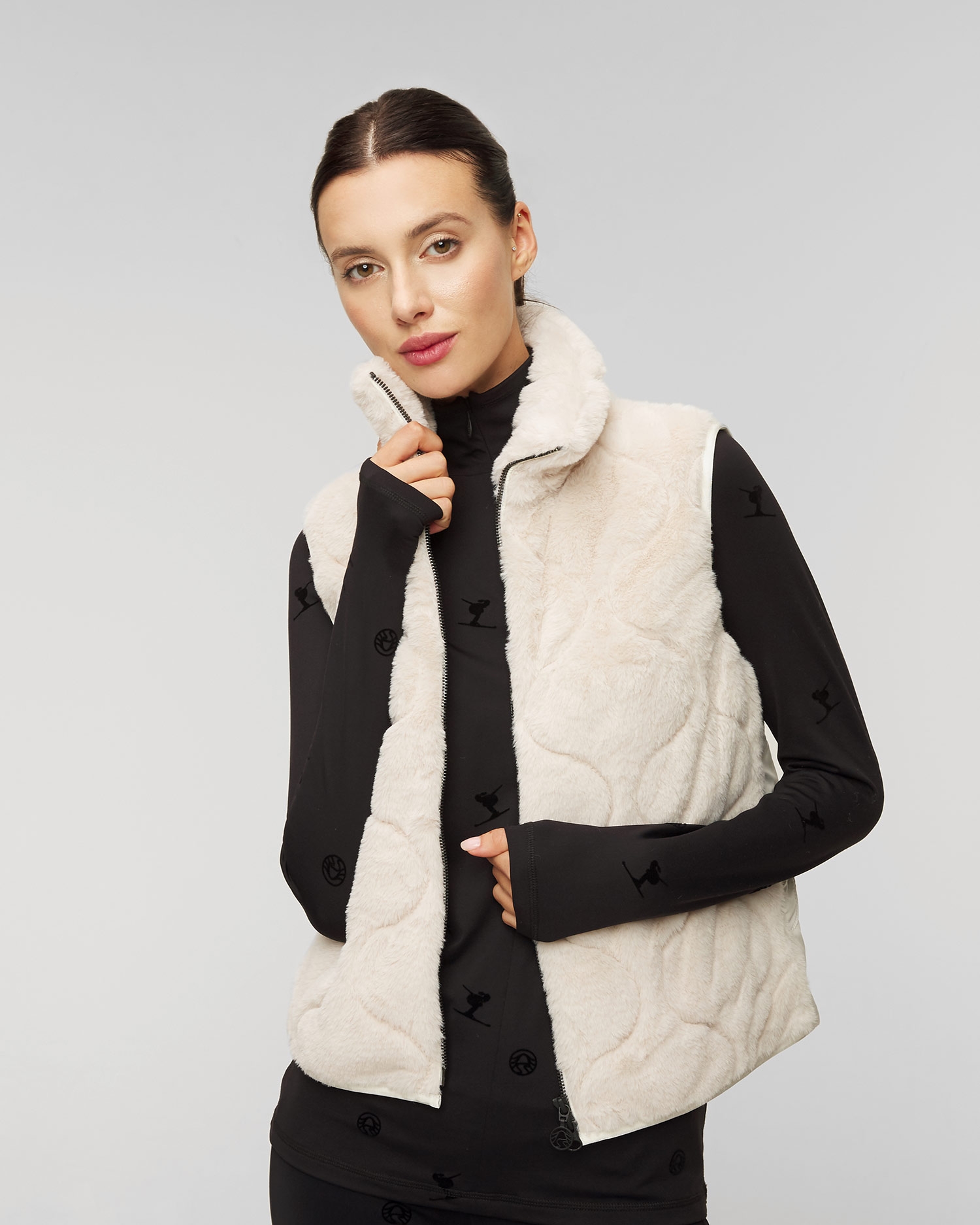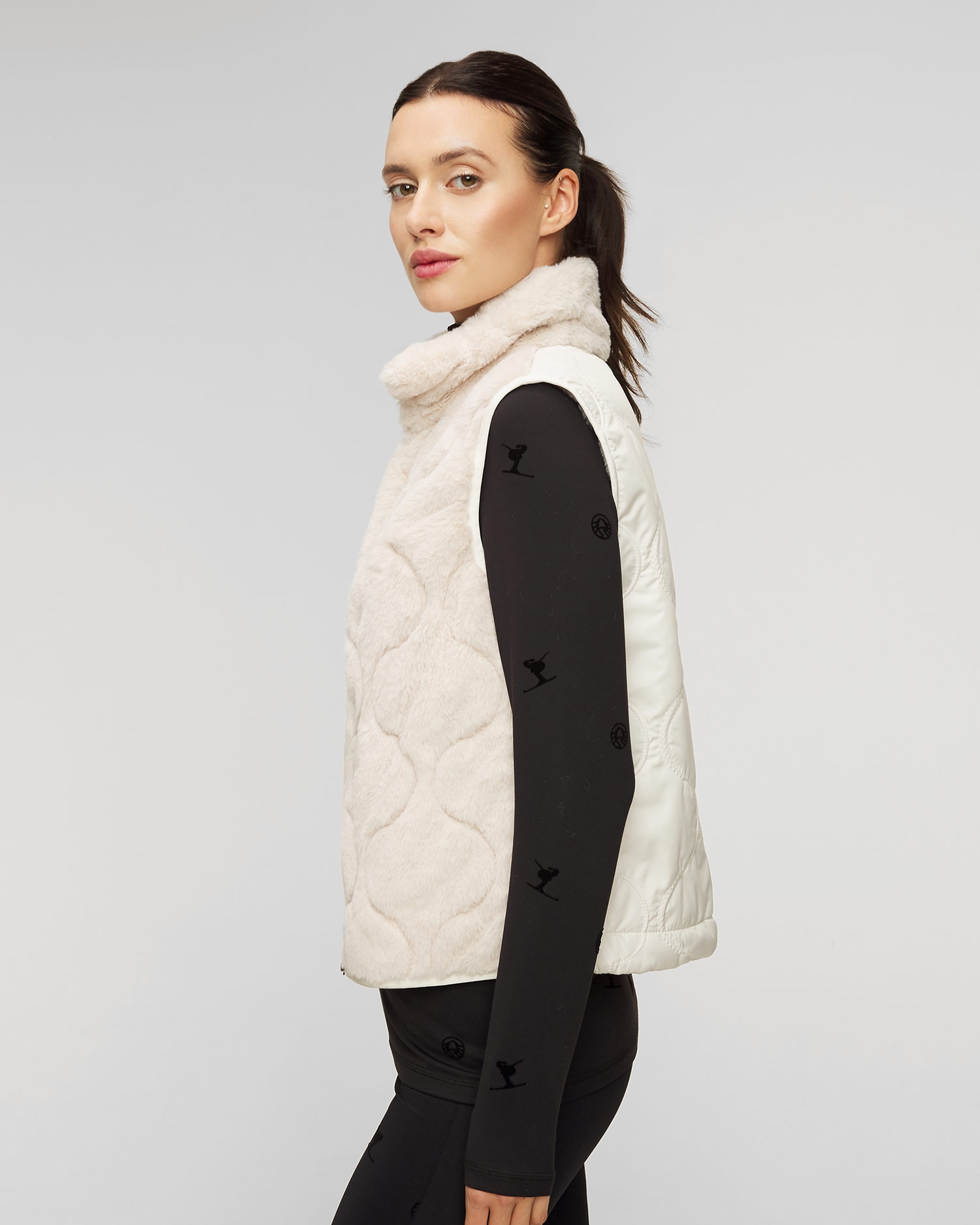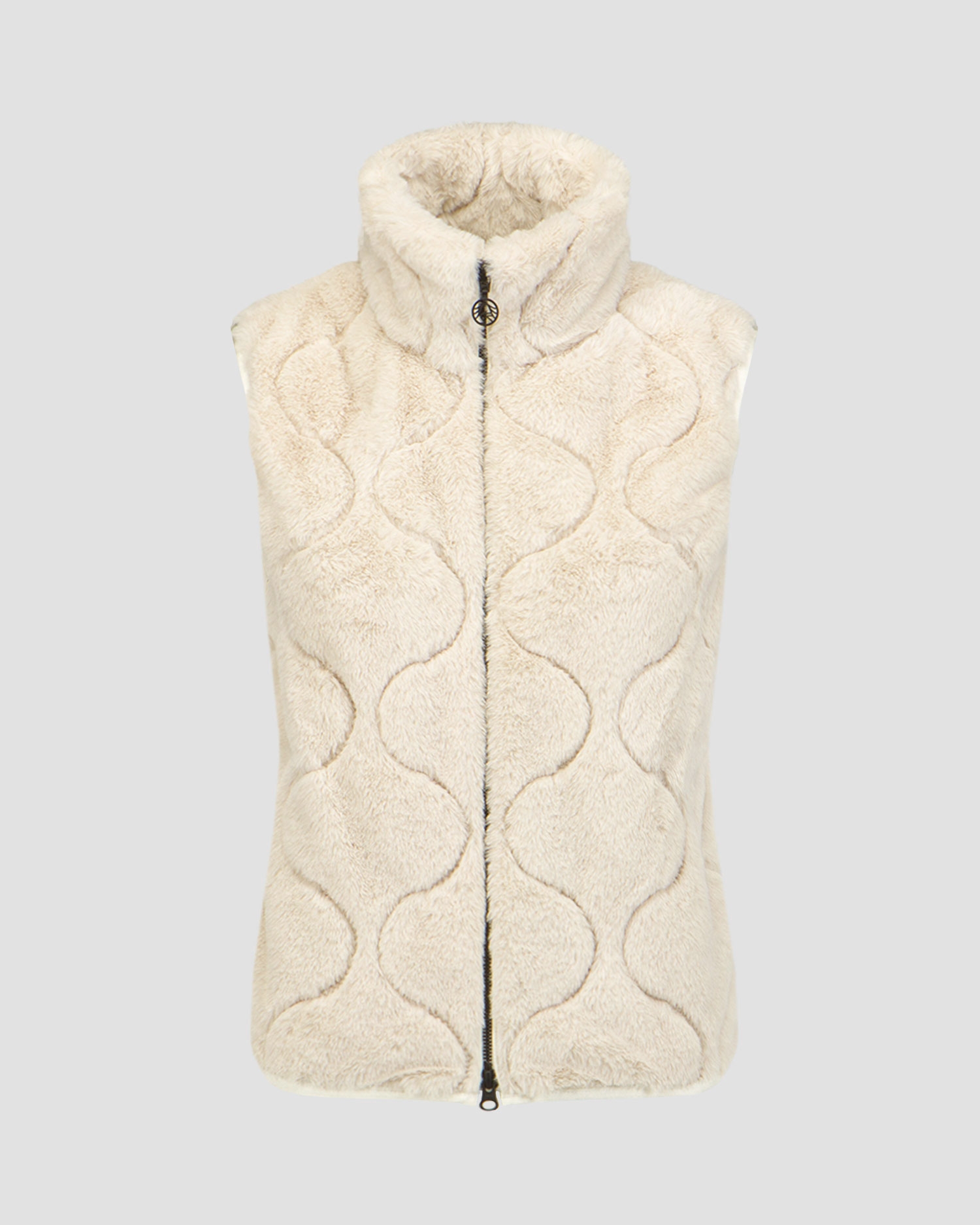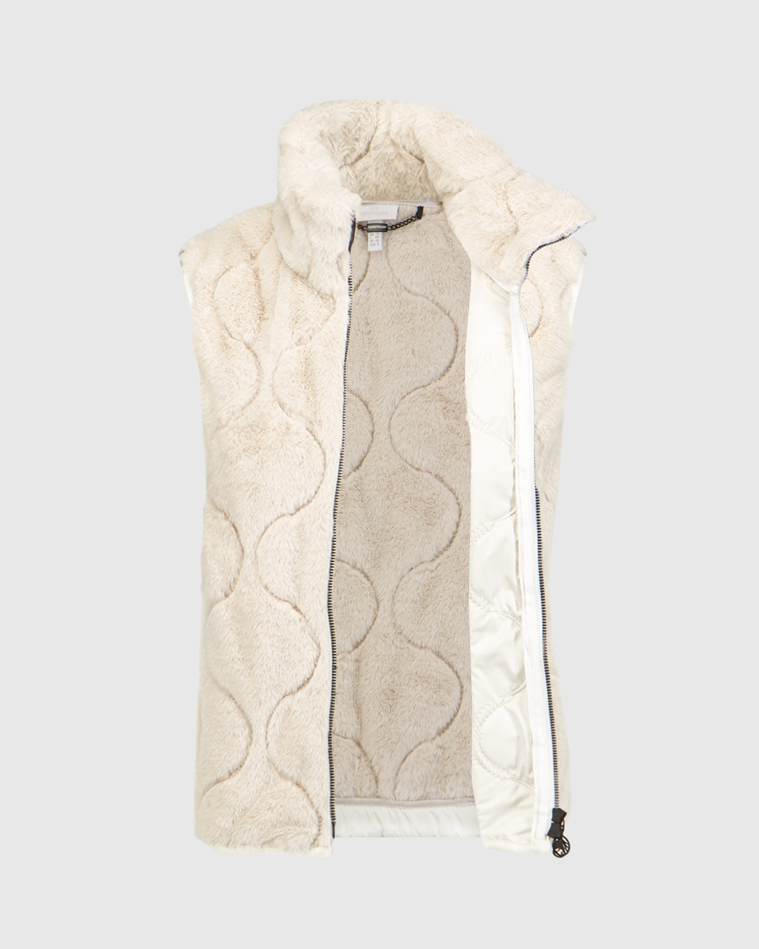 Il gilet da donna Sportalm dal taglio classico con il colletto alto in pelliccia sintetica. Con la cerniera pratica a doppio cursore rifinita con il logo Sportalm. Il gilet è da una parte in peluche e dall’altra in nylon leggermente lucido con gli elementi trapuntati alla moda che creano il contrasto armonioso. Le maniche e la parte inferiore con il bordo elastico. Due tasche integrate nella cucitura laterale.