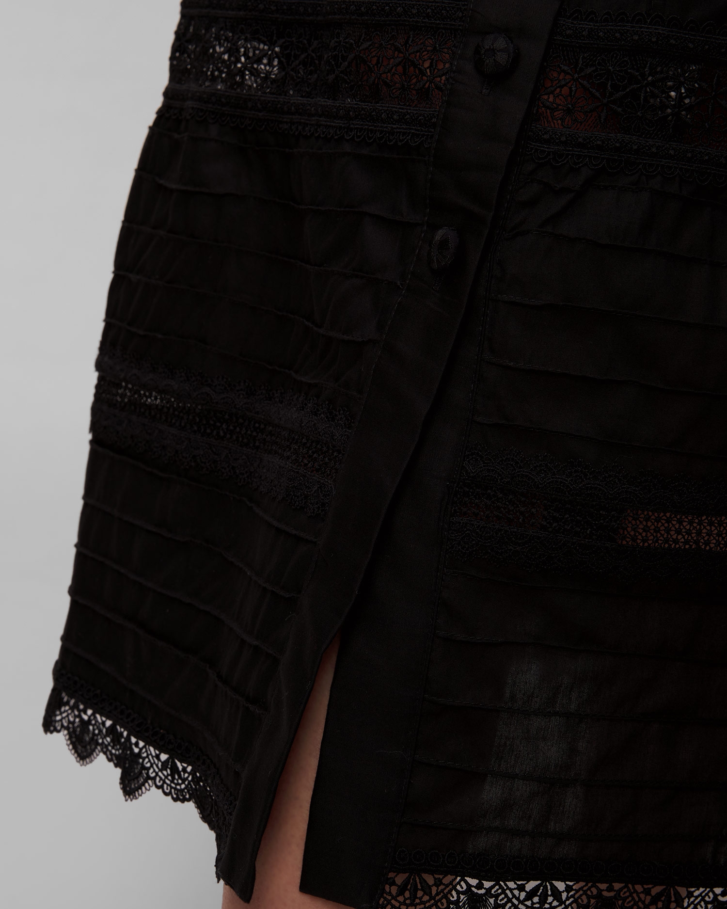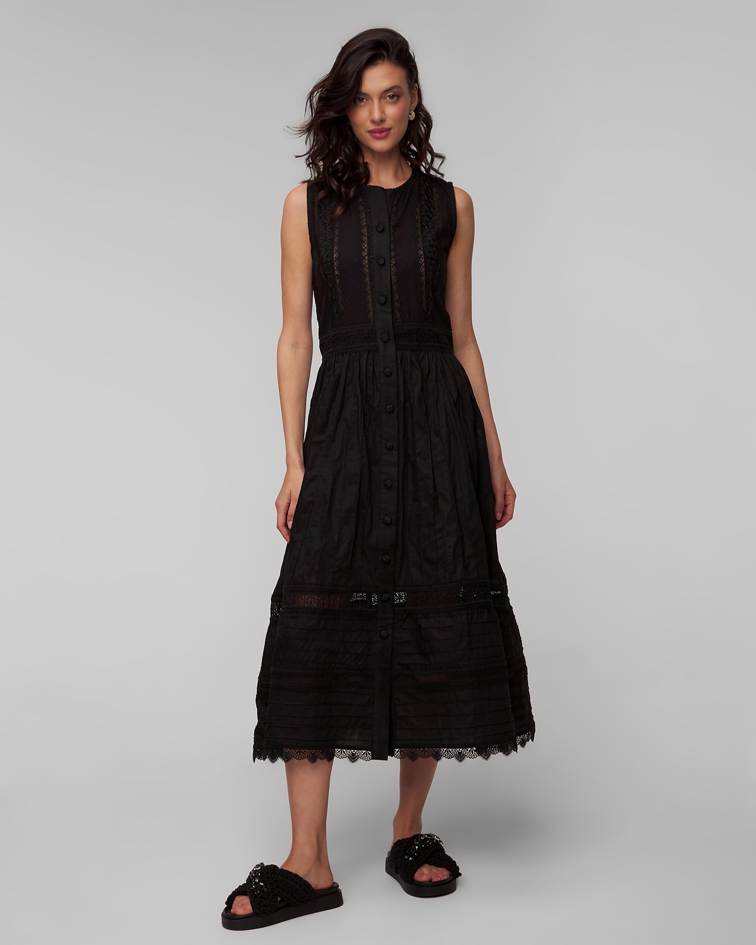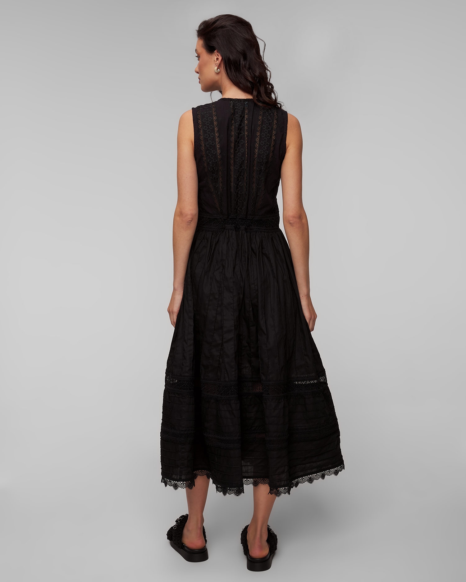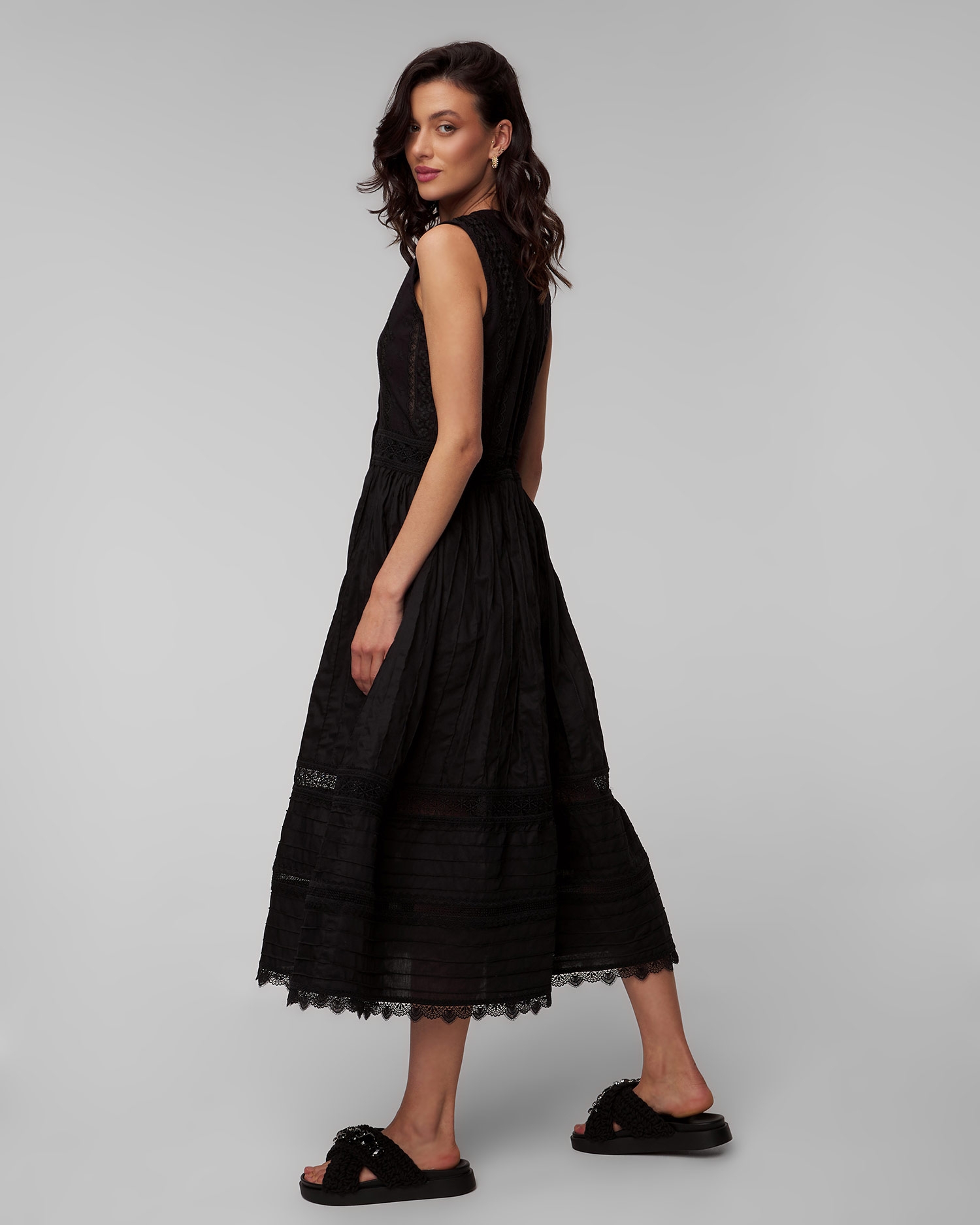 L’abito nero da donna Waimari Solaire è una proposta estiva che attira attenzione con il design unico. Gli inserti in pizzo fatto a mano sottolineano il suo carattere insolito, conferendo l’accento chic. Fatto in tessuto di cotone morbido e traspirante. Si caratterizza per la costruzione di lunghezza maxi con la chiusura decorativa con i bottoni.